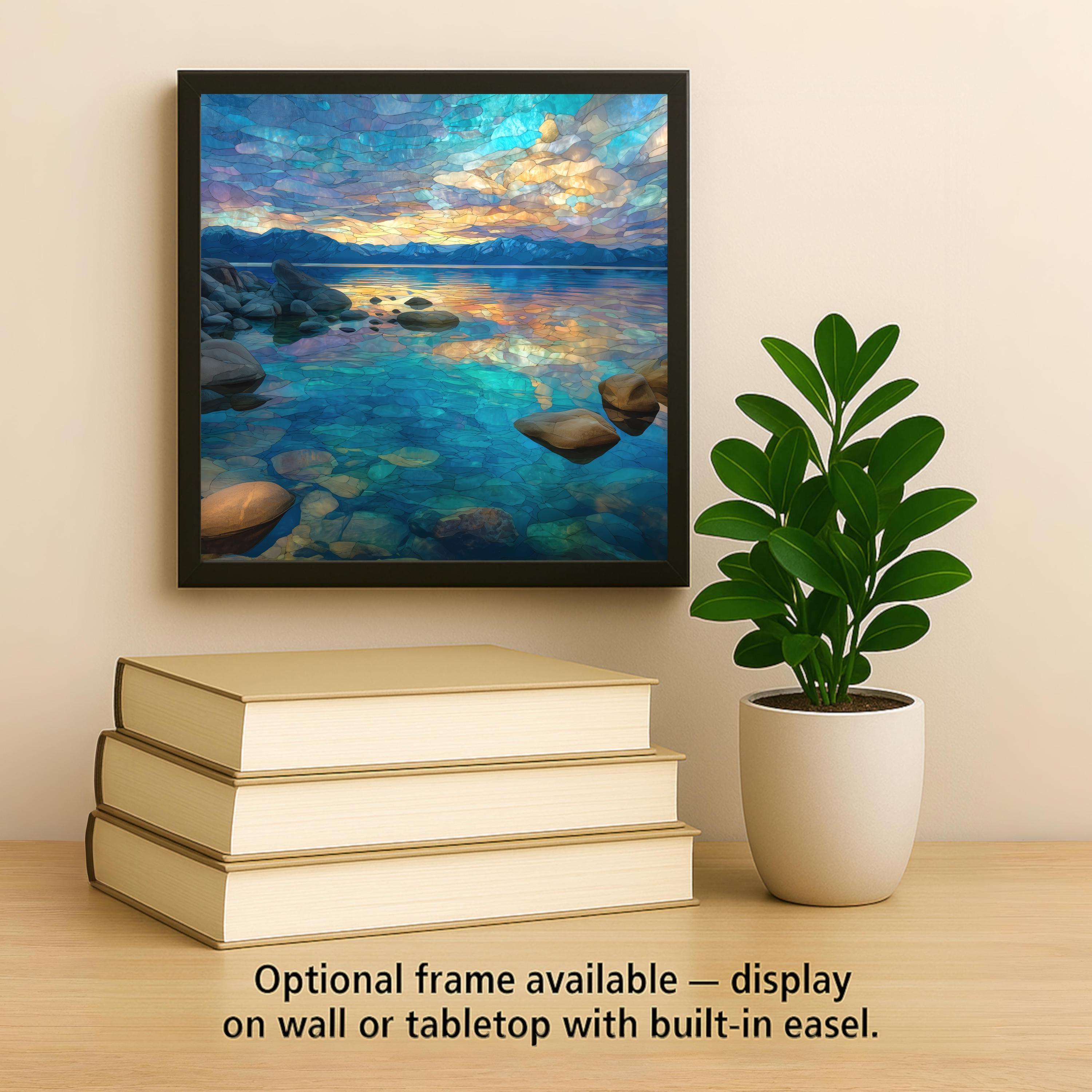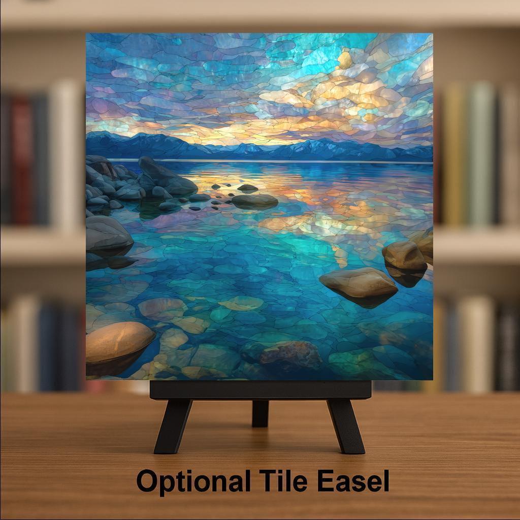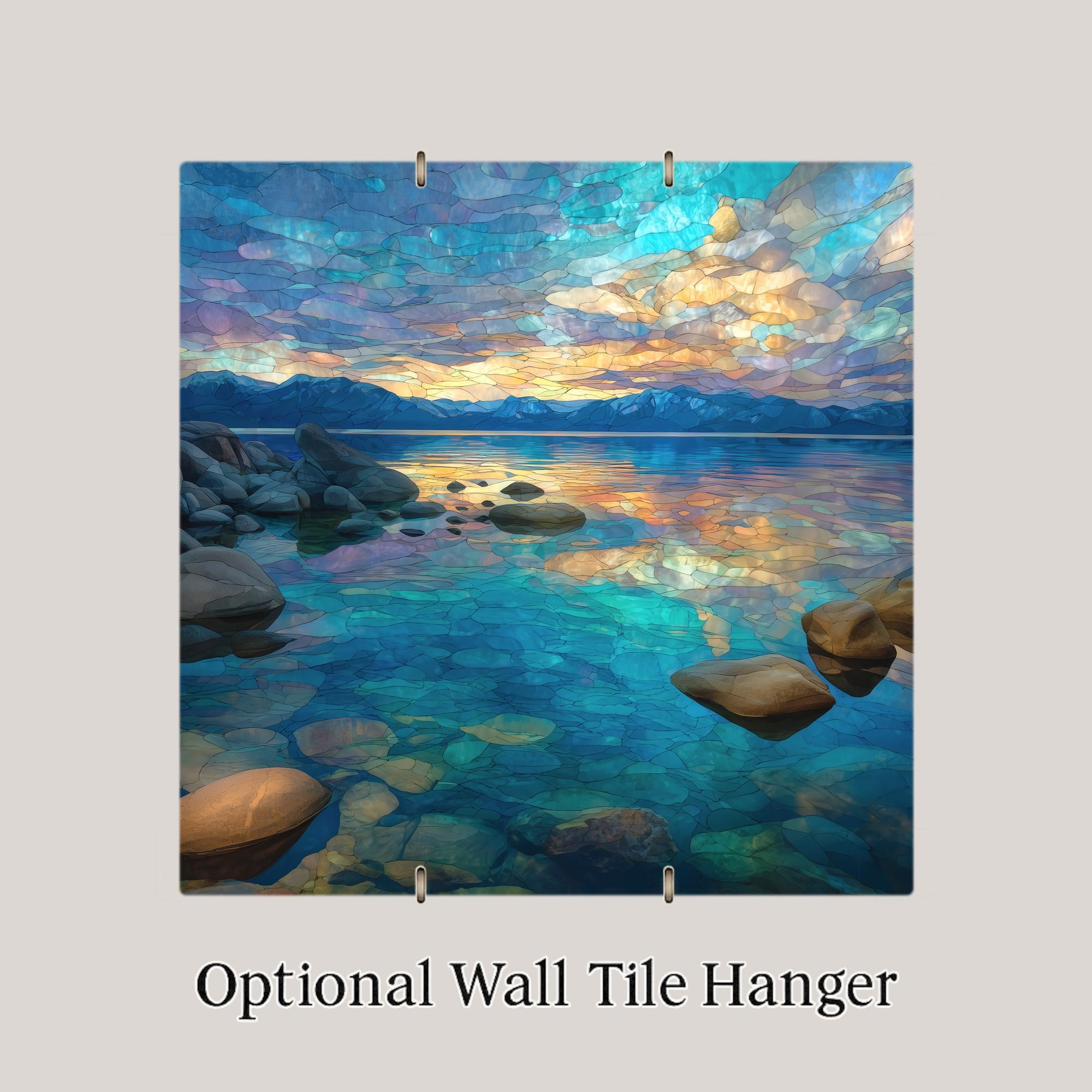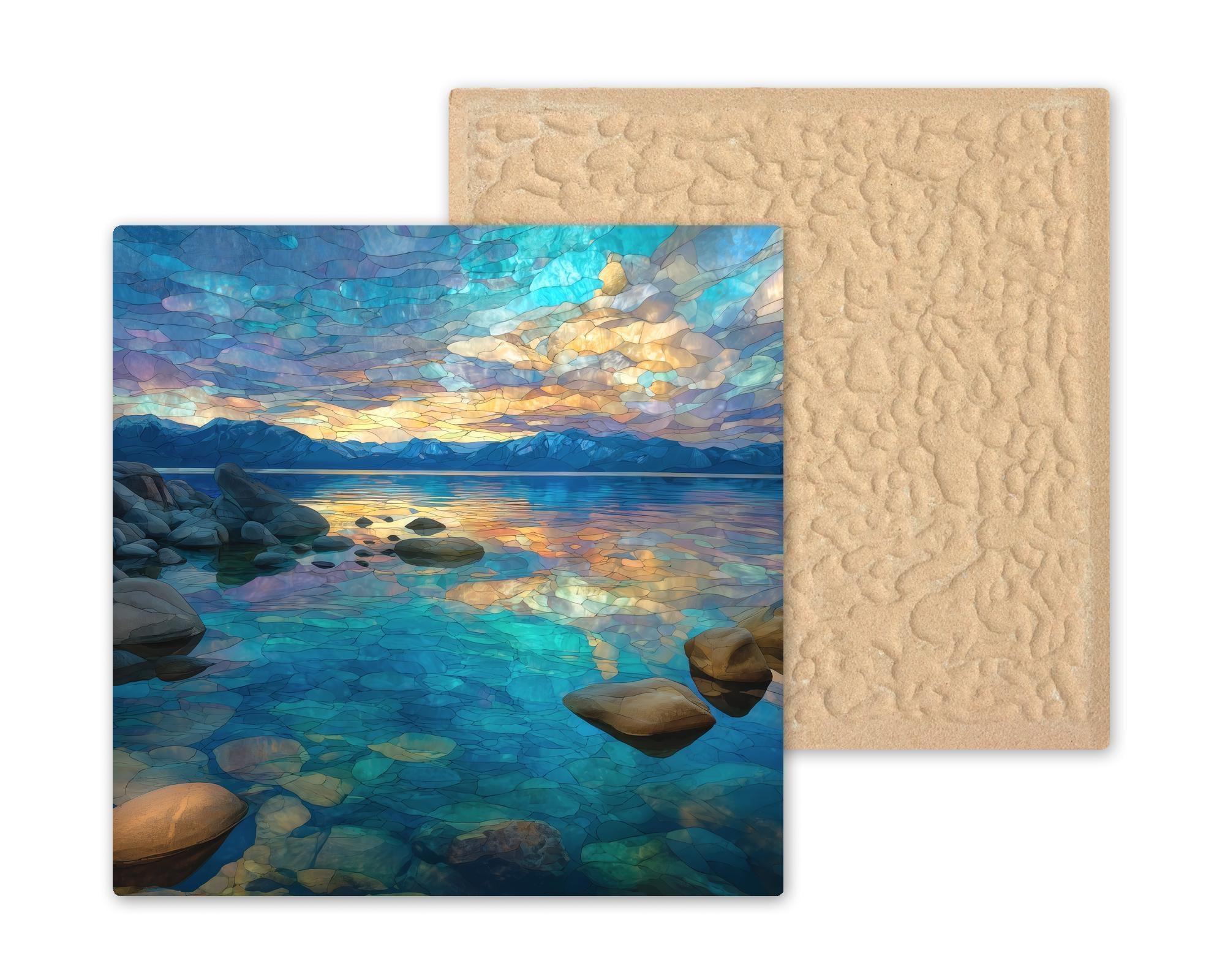 Inspired by the crystal waters of Lake Tahoe, this ceramic tile wall art captures a moment of stillness where sky, water, and mountains merge. Tahoe is celebrated for its clarity, calm, and sense of escape, and this artwork reflects those qualities through layered blues, soft sunset light, and mirror-like reflections across the lake’s surface.