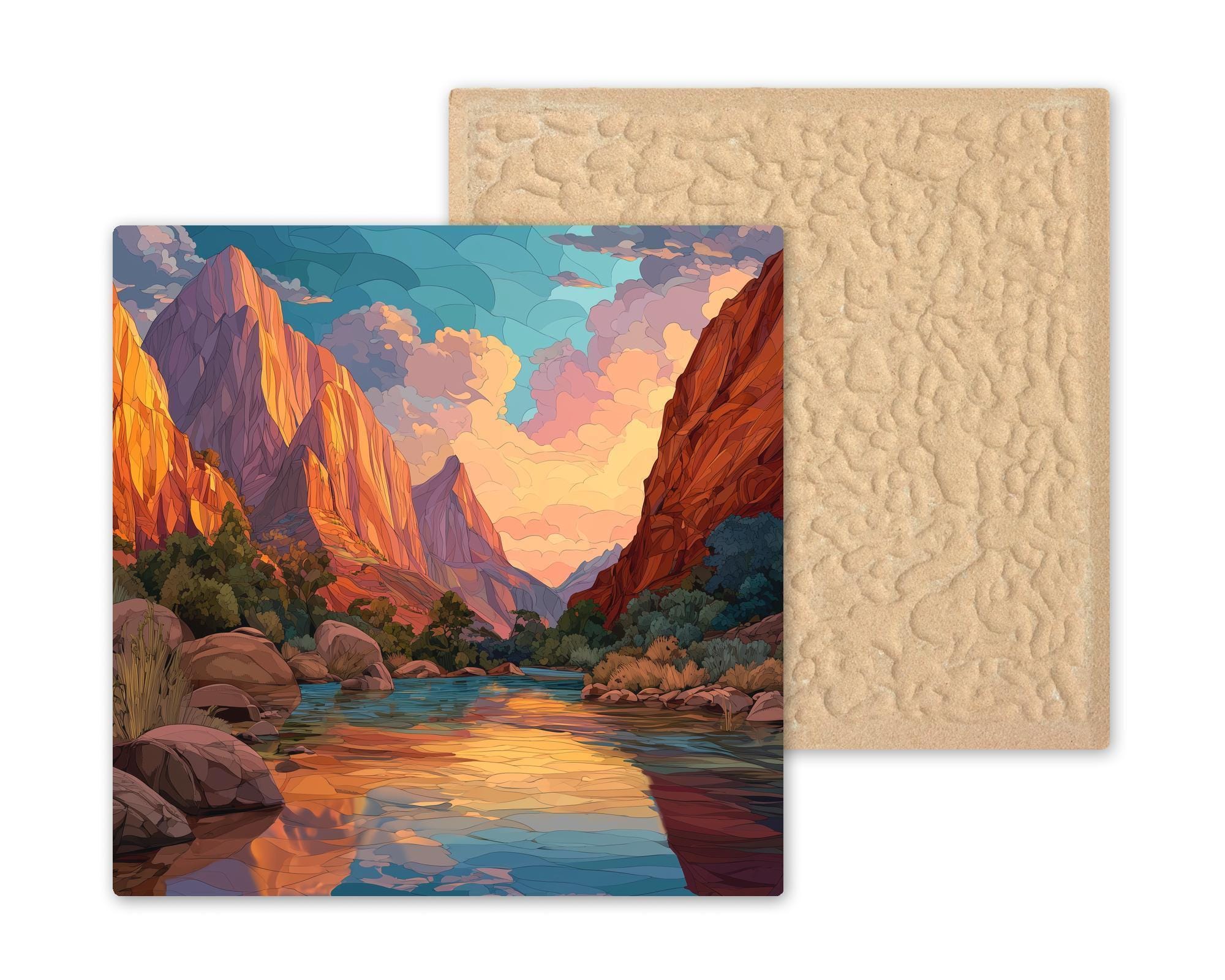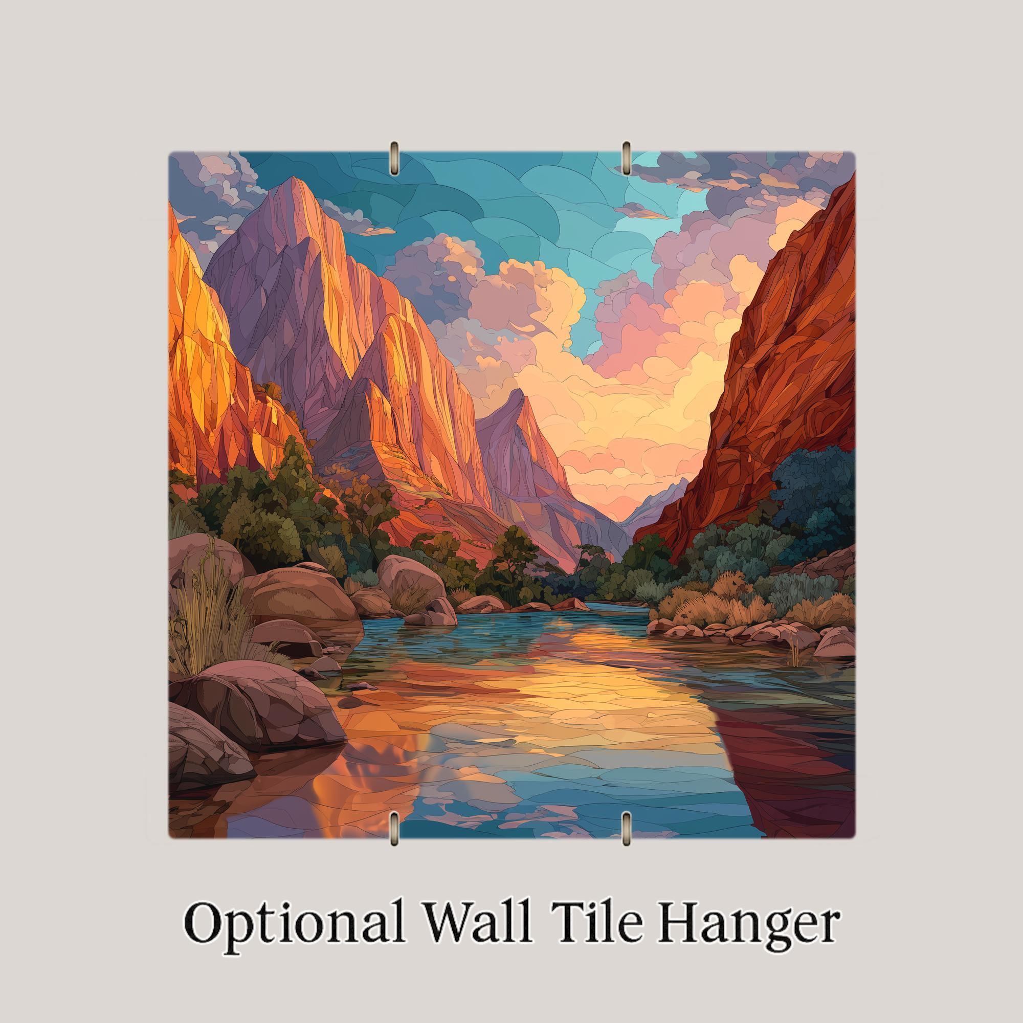 This Zion National Park ceramic tile wall art celebrates the awe and serenity of the desert Southwest. The towering canyon walls and glowing reflections evoke the quiet moments found along the Virgin River at golden hour. It’s an ideal choice for those who love national parks, outdoor adventure, or meaningful landscape art inspired by iconic American destinations.