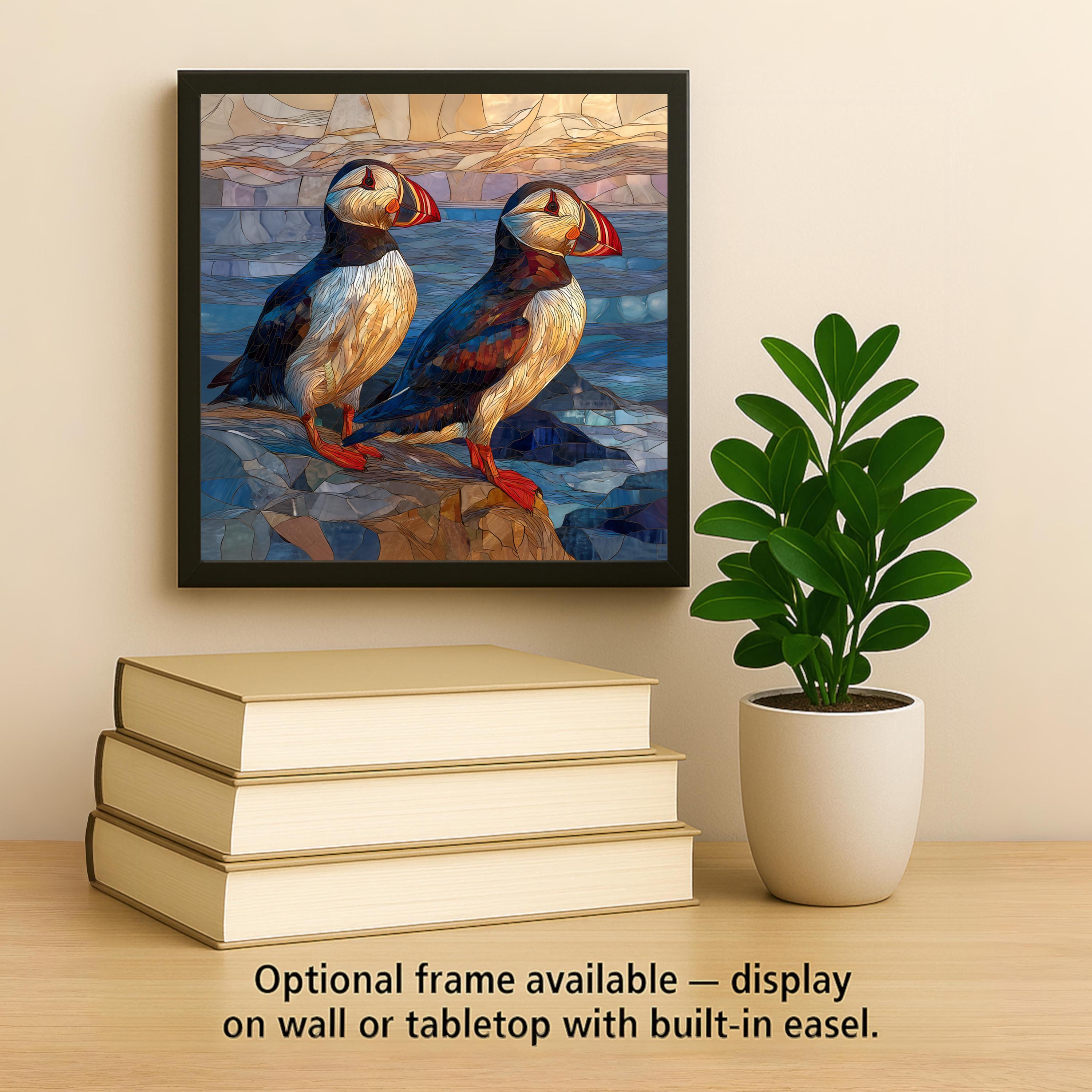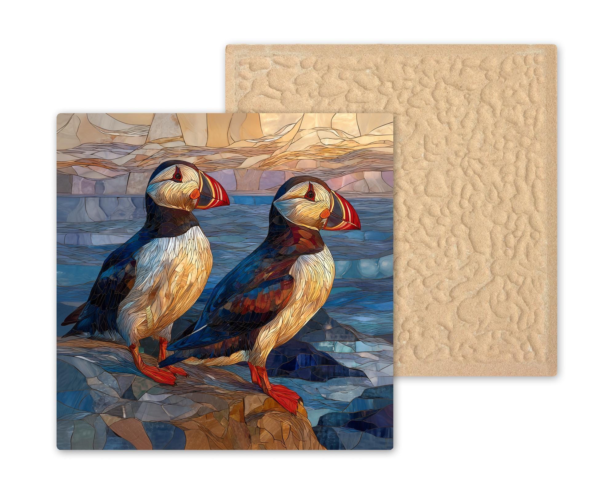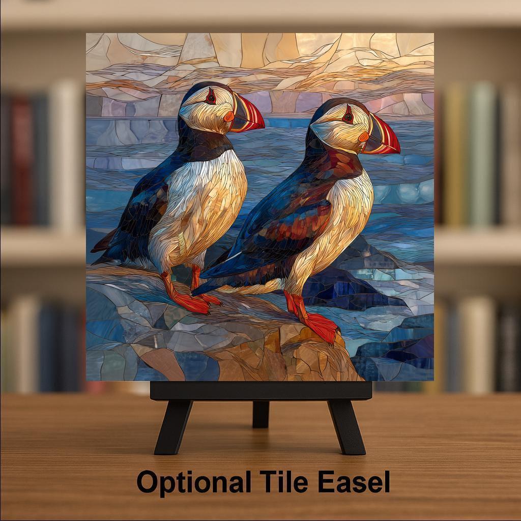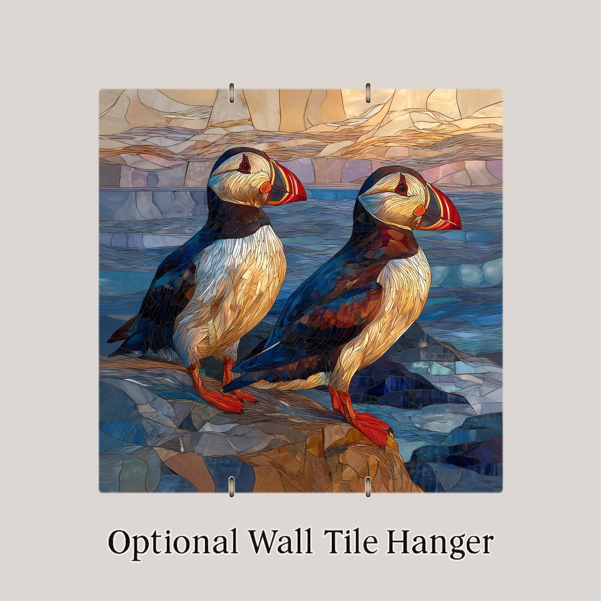 This puffin couple ceramic tile wall art is a quiet but powerful expression of partnership and love. The two birds stand close, facing the same direction, symbolizing shared paths, trust, and commitment. The coastal tones and gentle movement of water add a sense of calm and stability, reinforcing the idea of growing together over time.