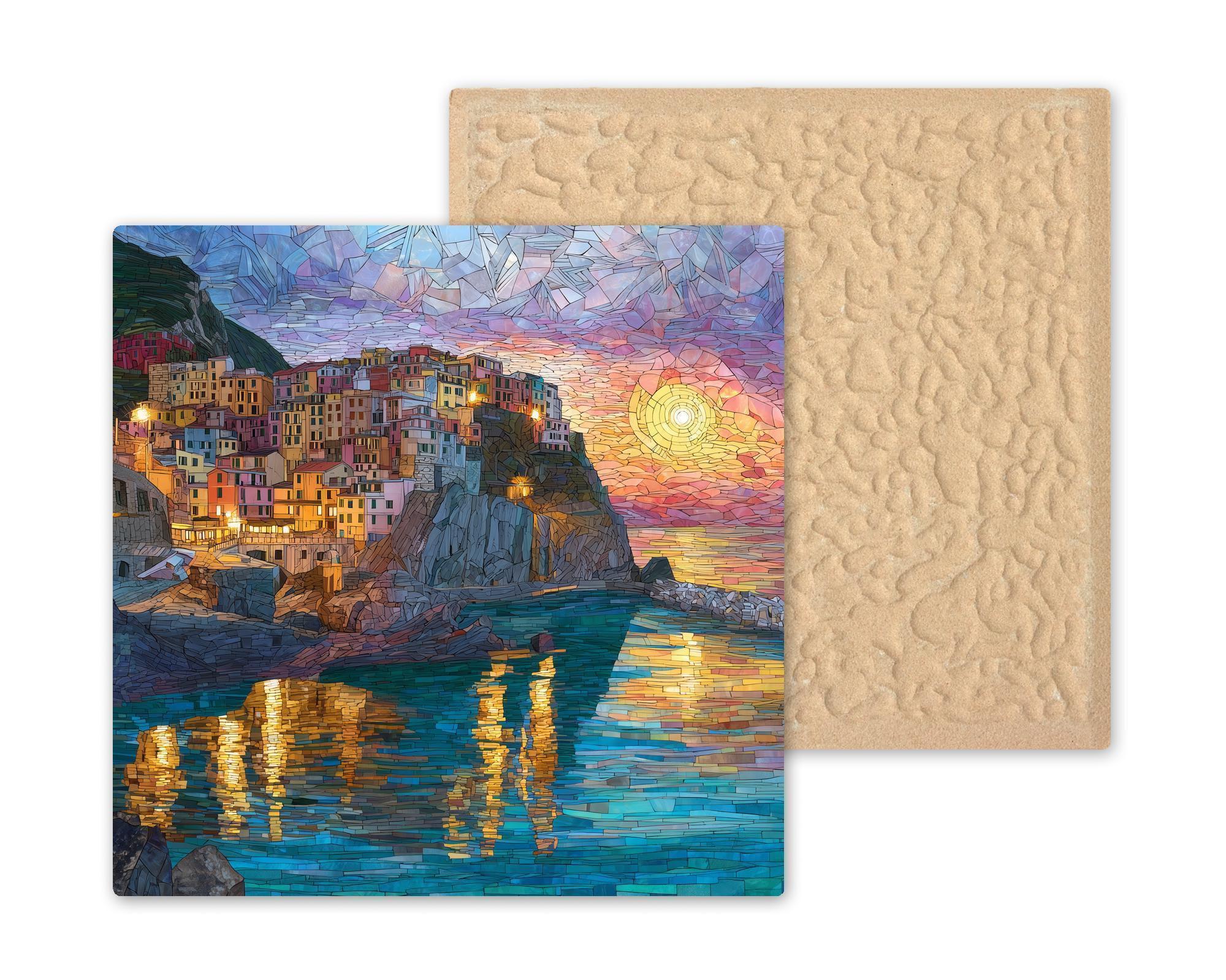 This Cinque Terre ceramic tile wall art celebrates the beauty of Italian coastal living and the magic of seaside villages glowing at dusk. The warm sunset tones, colorful architecture, and reflective water evoke relaxed evenings overlooking the Mediterranean, making this artwork a calming yet striking focal point.