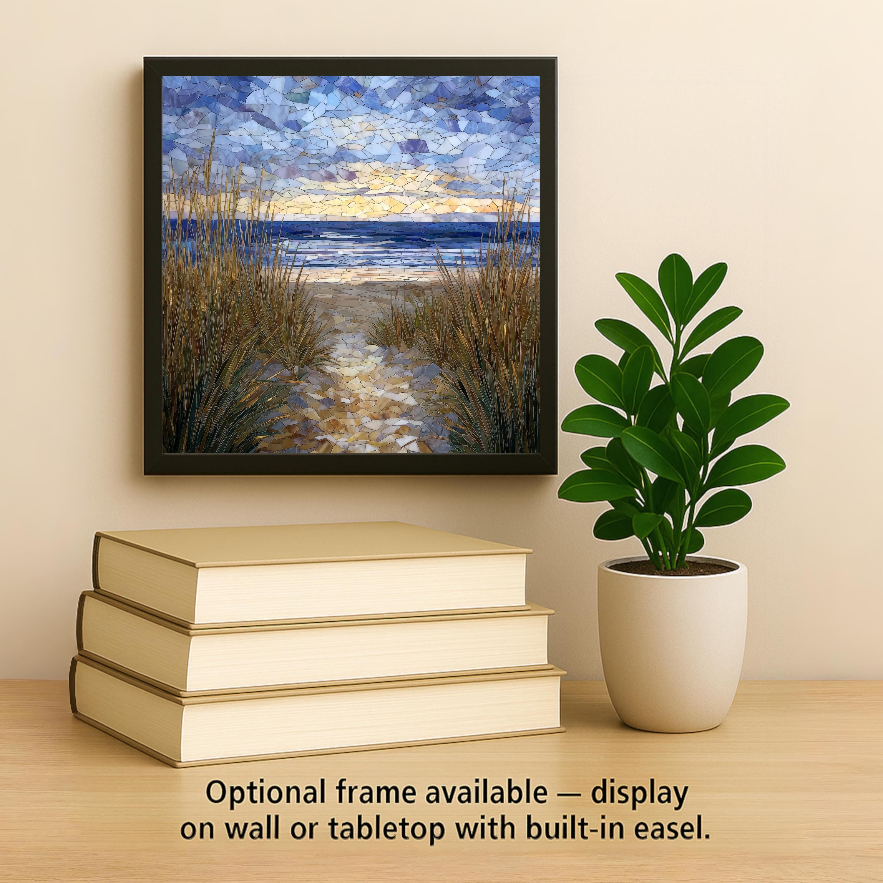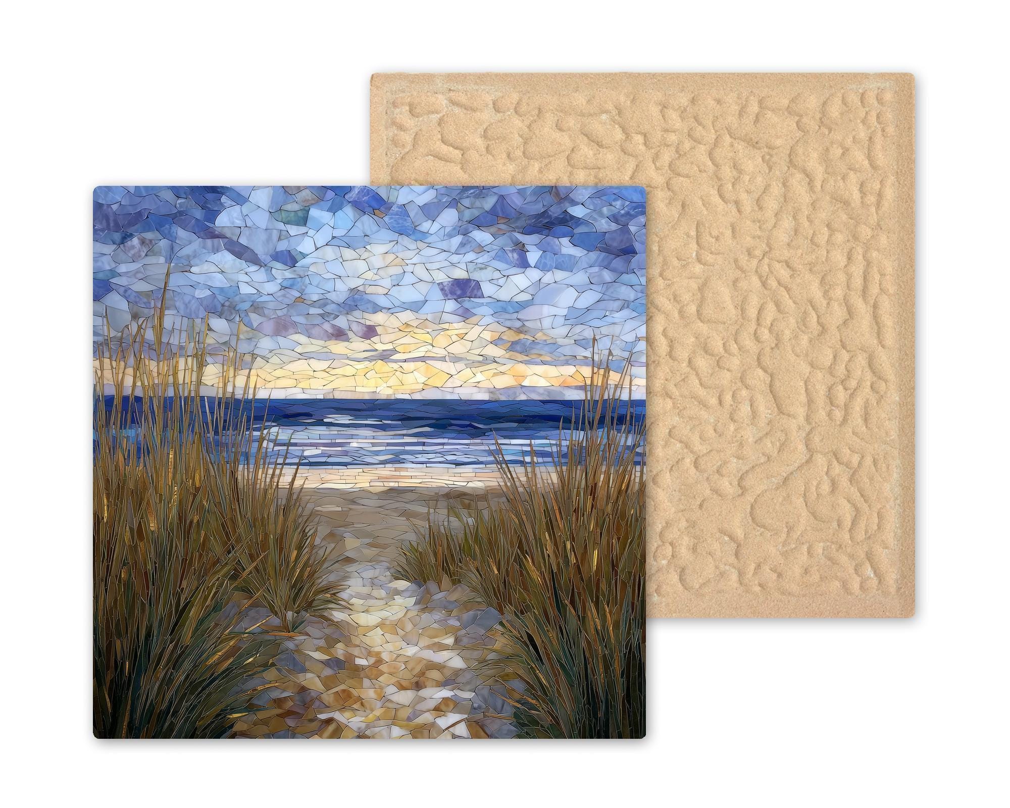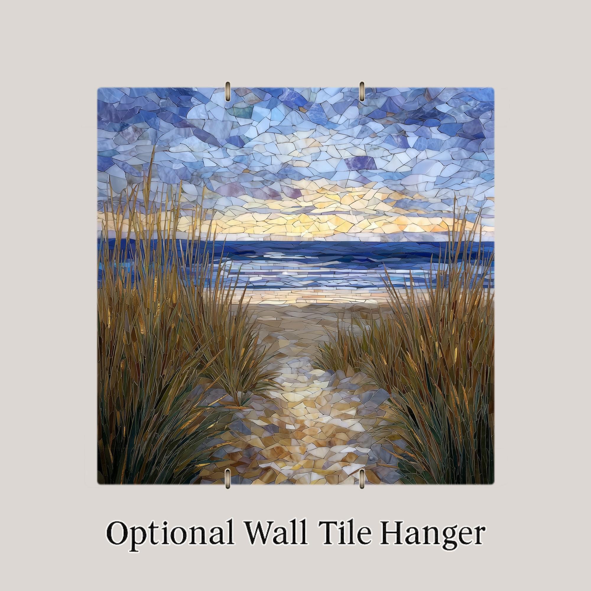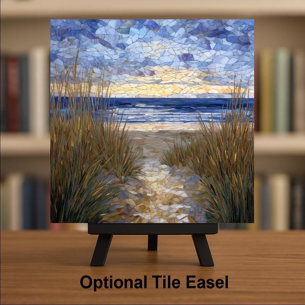 This Cape Cod ceramic tile wall art captures the feeling of standing at the edge of the dunes, where tall beach grass frames a winding path toward the sea. Soft blues, sandy neutrals, and warm sky tones blend together in a stained glass–style composition that feels both peaceful and inviting. The design works beautifully as wall decor or as a subtle focal piece on a shelf or tabletop.