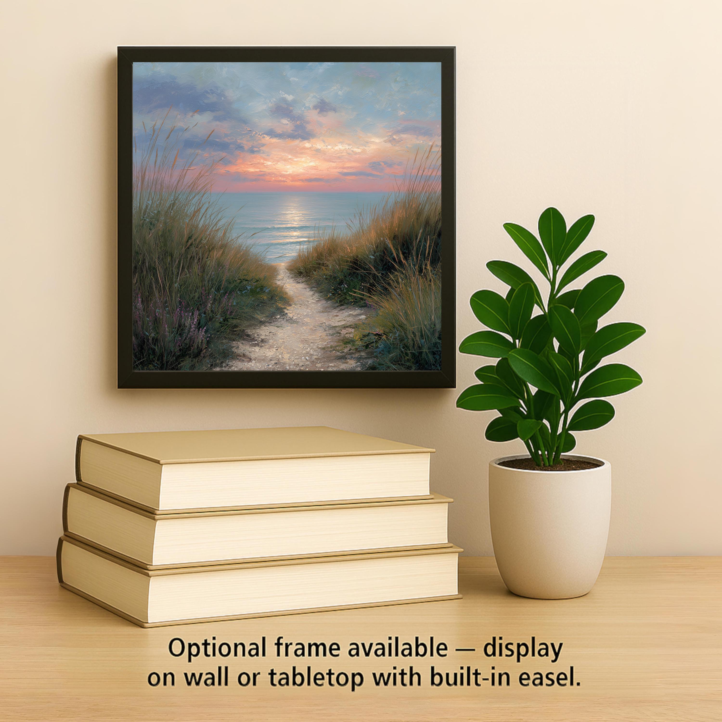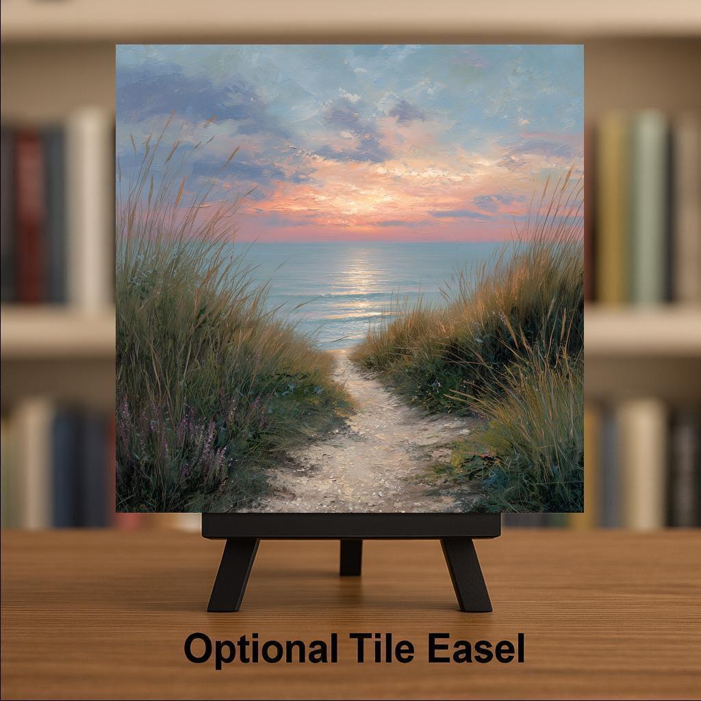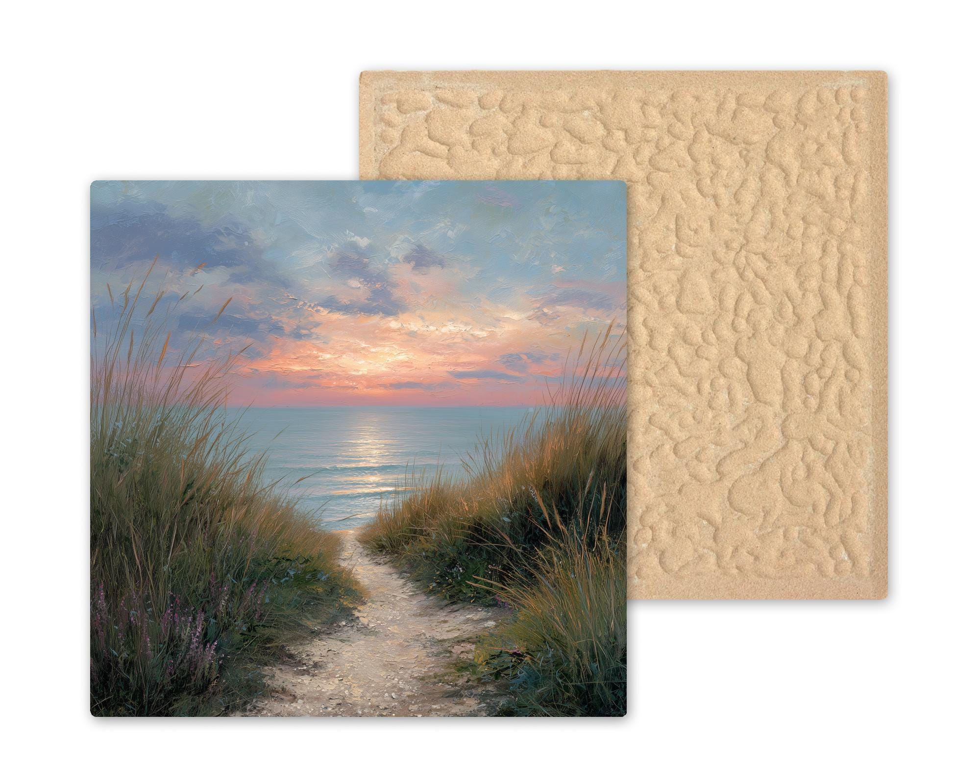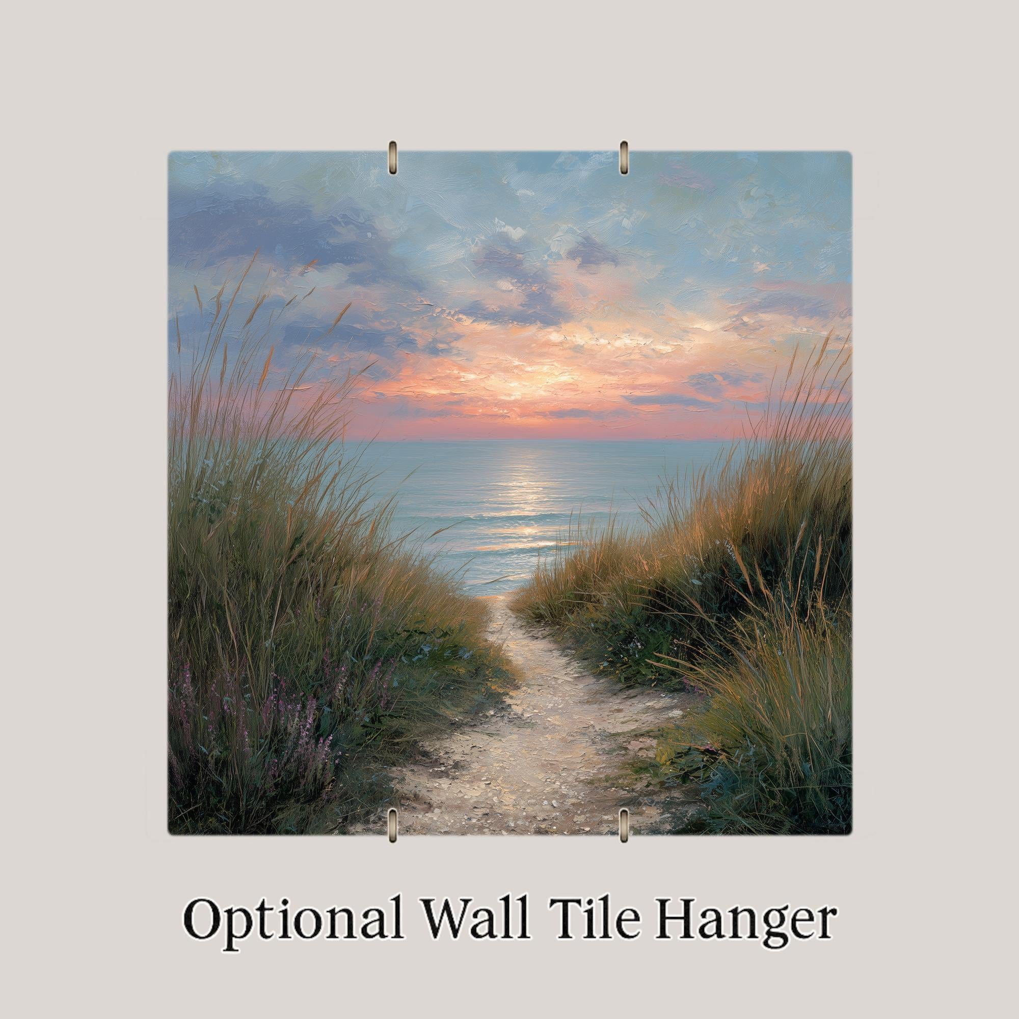 This coastal ceramic tile artwork reflects the relaxed beauty of Cape Cod, where sandy paths wind through dune grass toward open water. The pastel sky and gentle ocean tones create a sense of calm that fits perfectly with coastal home decor and beach-inspired interiors.