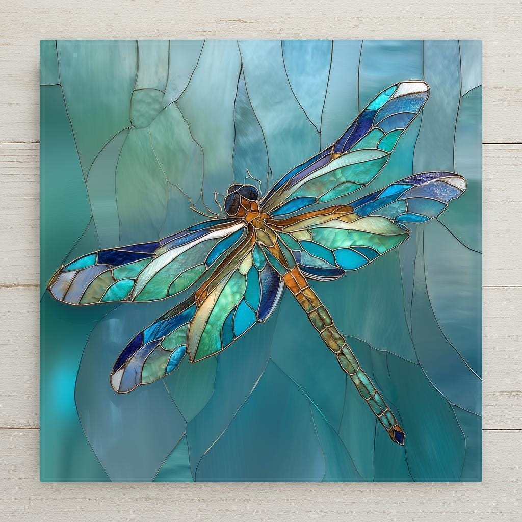 Both find exactly what they need here. The stained glass treatment gives the teal and cobalt wings a luminous quality that is hard to photograph but immediately apparent in person, which is why this listing generates favorites from buyers who return to purchase.