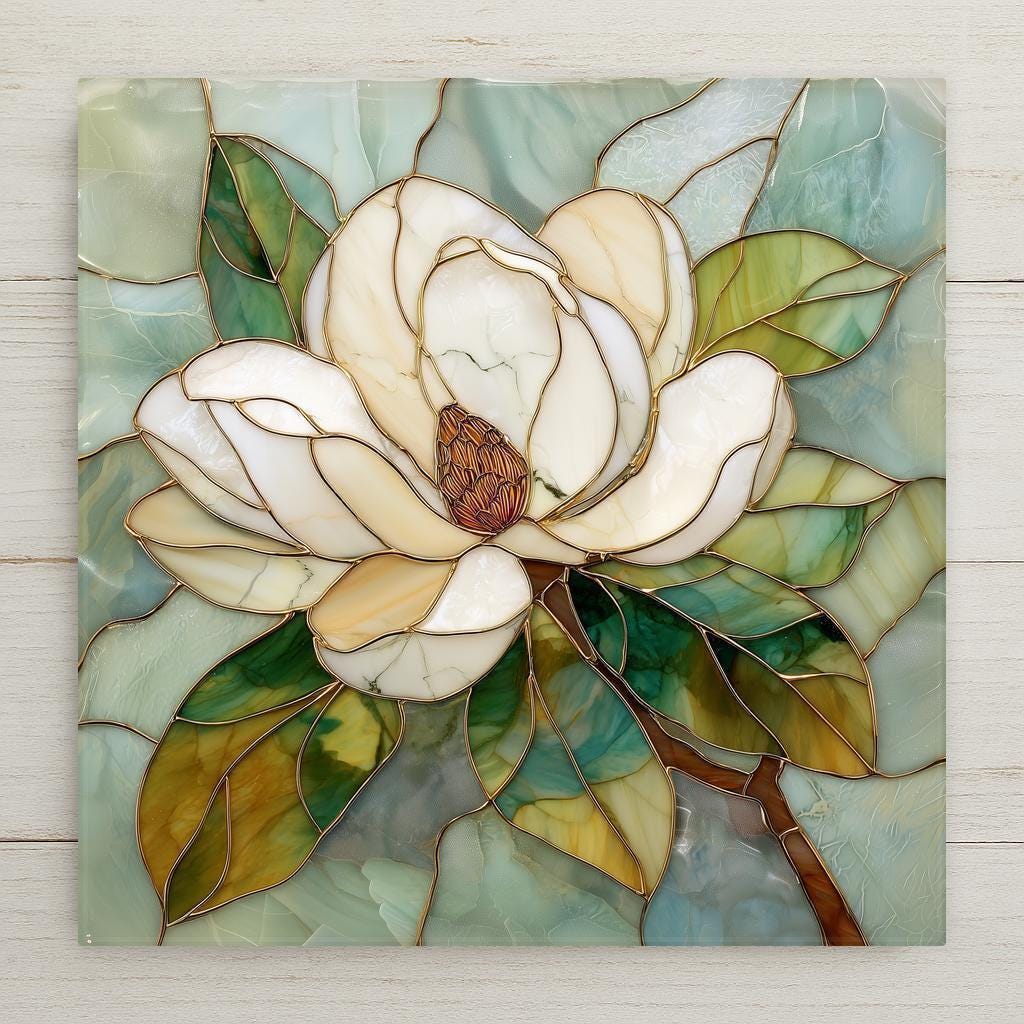 Elegant and calming, this magnolia ceramic tile wall art blends stained glass style with botanical home decor. The soft white petals contrast beautifully with the layered green leaves, creating a peaceful design that fits easily into both modern and traditional spaces. The gentle color palette makes this floral wall decor easy to style alongside neutral tones, natural wood, and light furnishings.