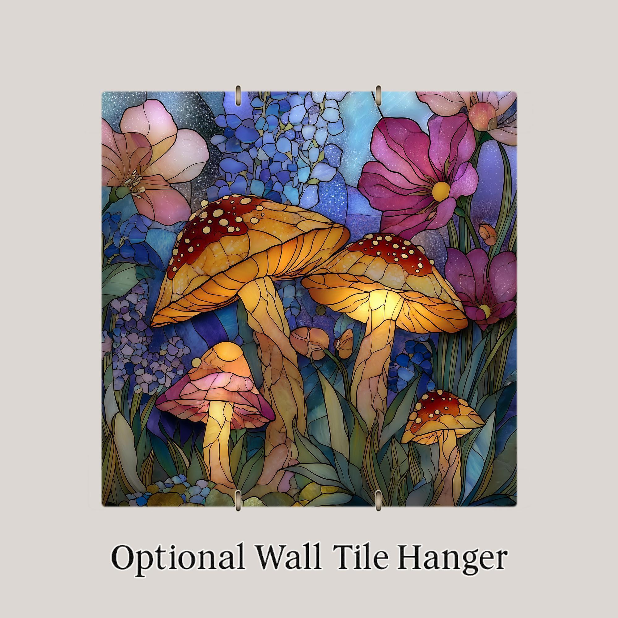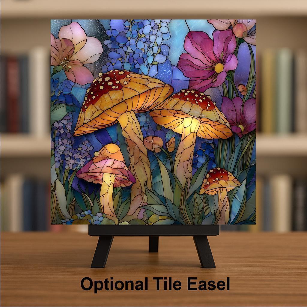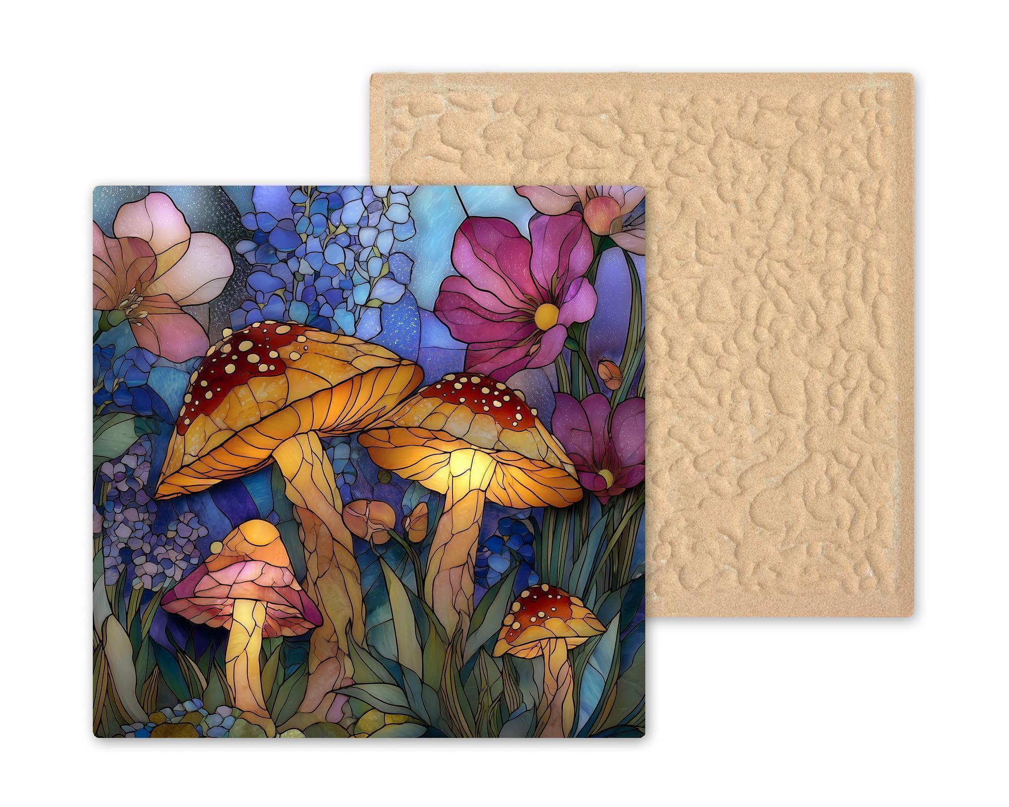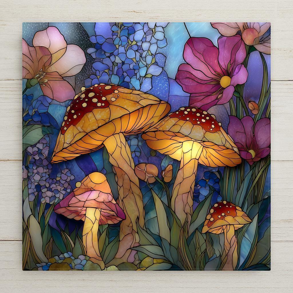 Mushrooms have long symbolized magic, growth, and the hidden wonders of nature, making them a favorite motif in woodland and fantasy-inspired decor. This ceramic tile wall art embraces that symbolism with a stained glass style composition filled with glowing fungi, delicate flowers, and layered botanical textures. The flowing lines and luminous colors create a peaceful yet enchanting focal point.