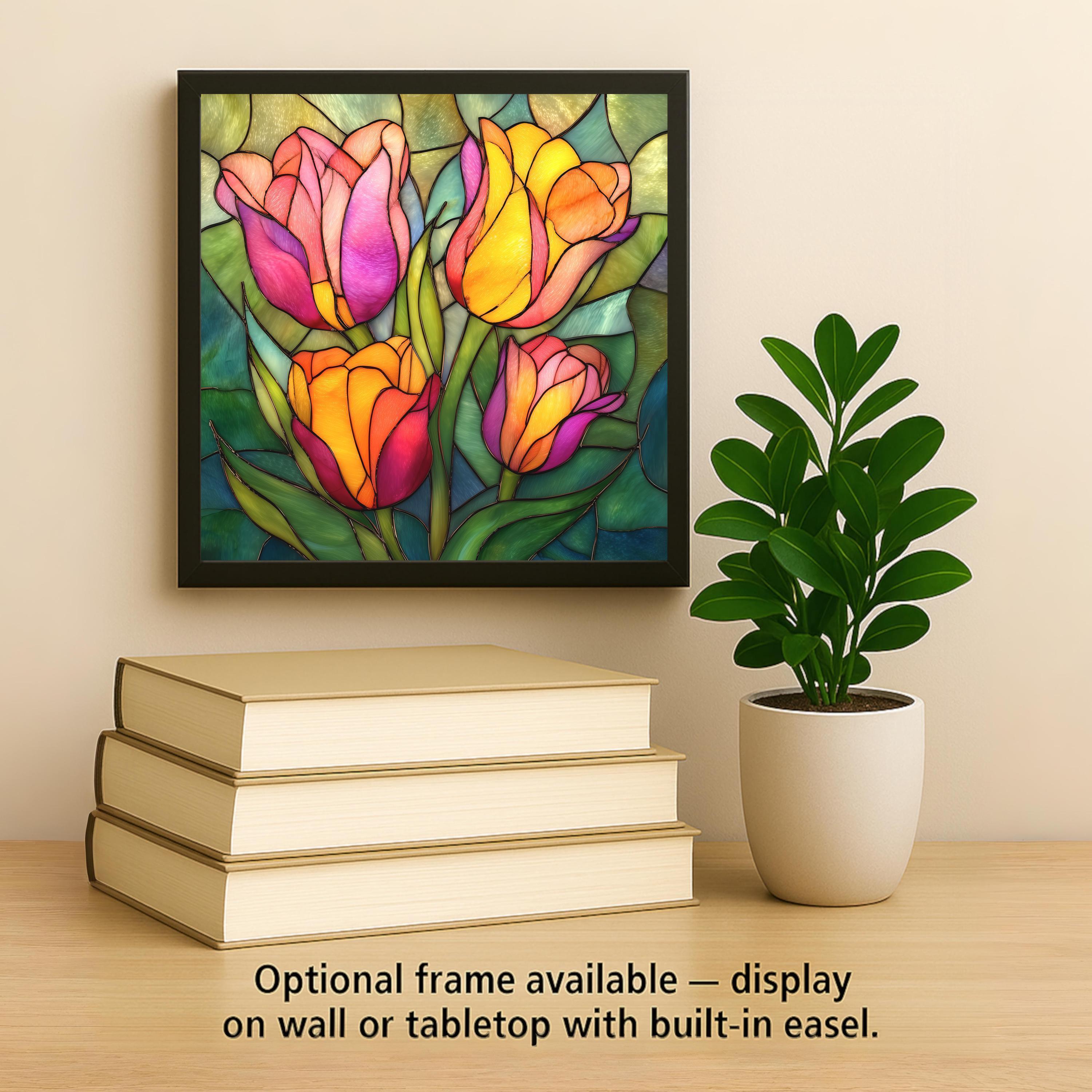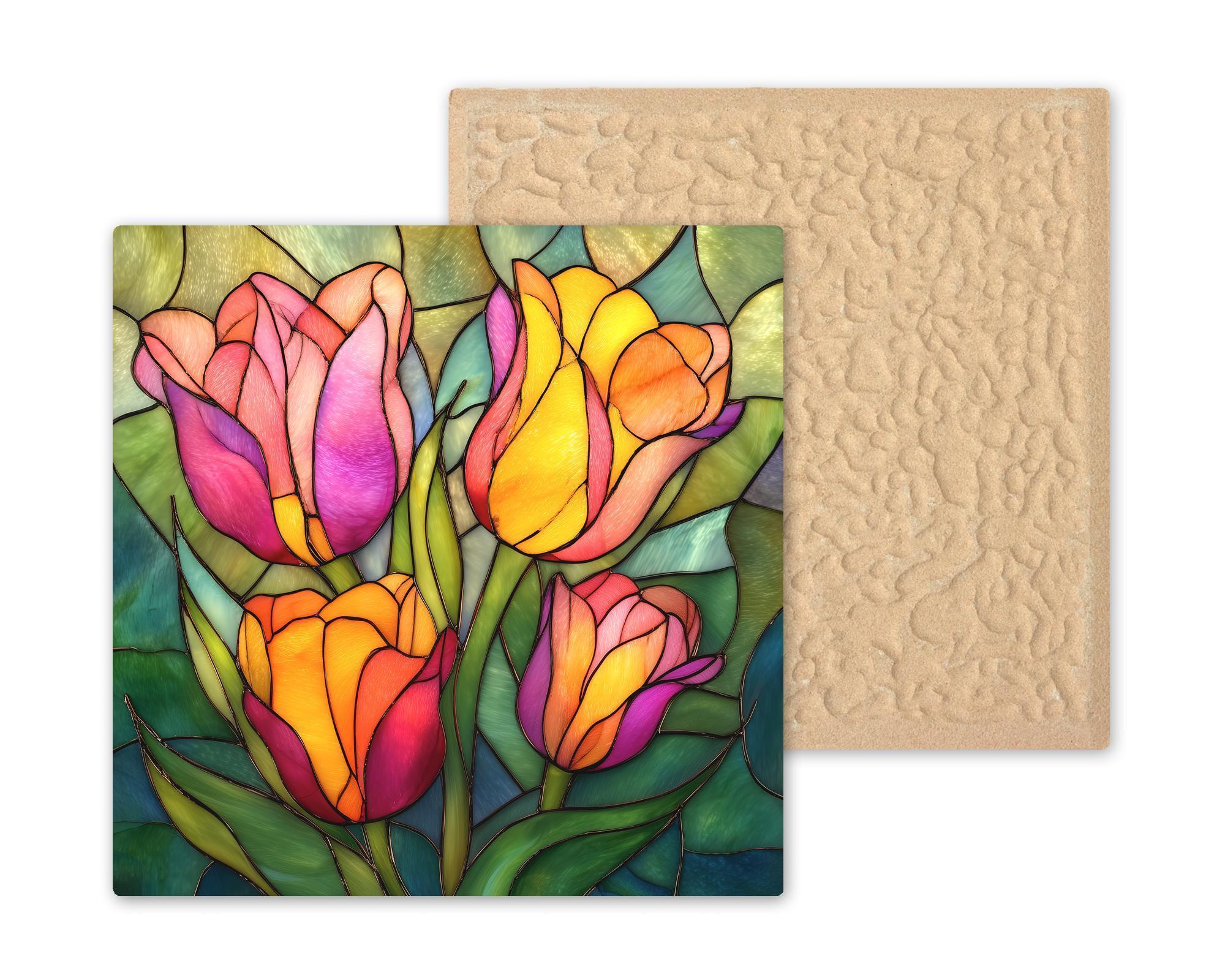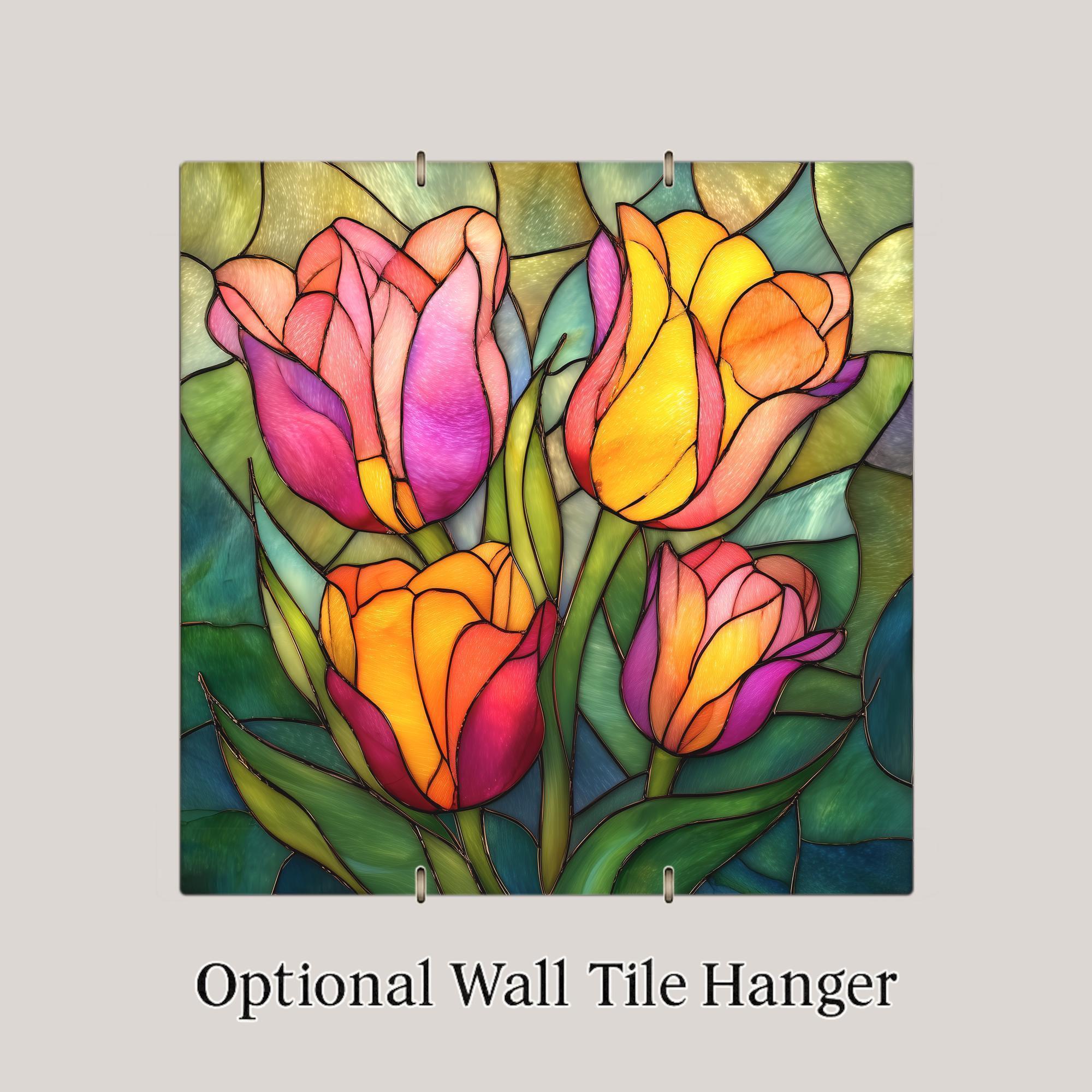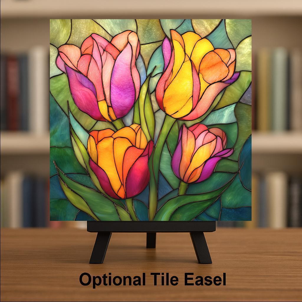 Tulips symbolize renewal, joy, and the arrival of spring, making them a timeless favorite for floral wall decor. This ceramic tile wall art captures that symbolism with a stained glass style composition that feels cheerful, elegant, and inviting. The layered petals and lush greenery create visual movement while maintaining a balanced, calming design.