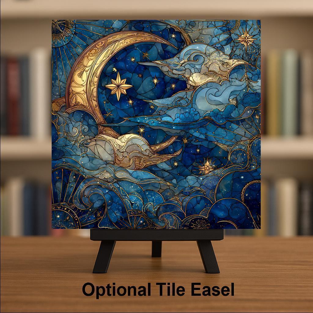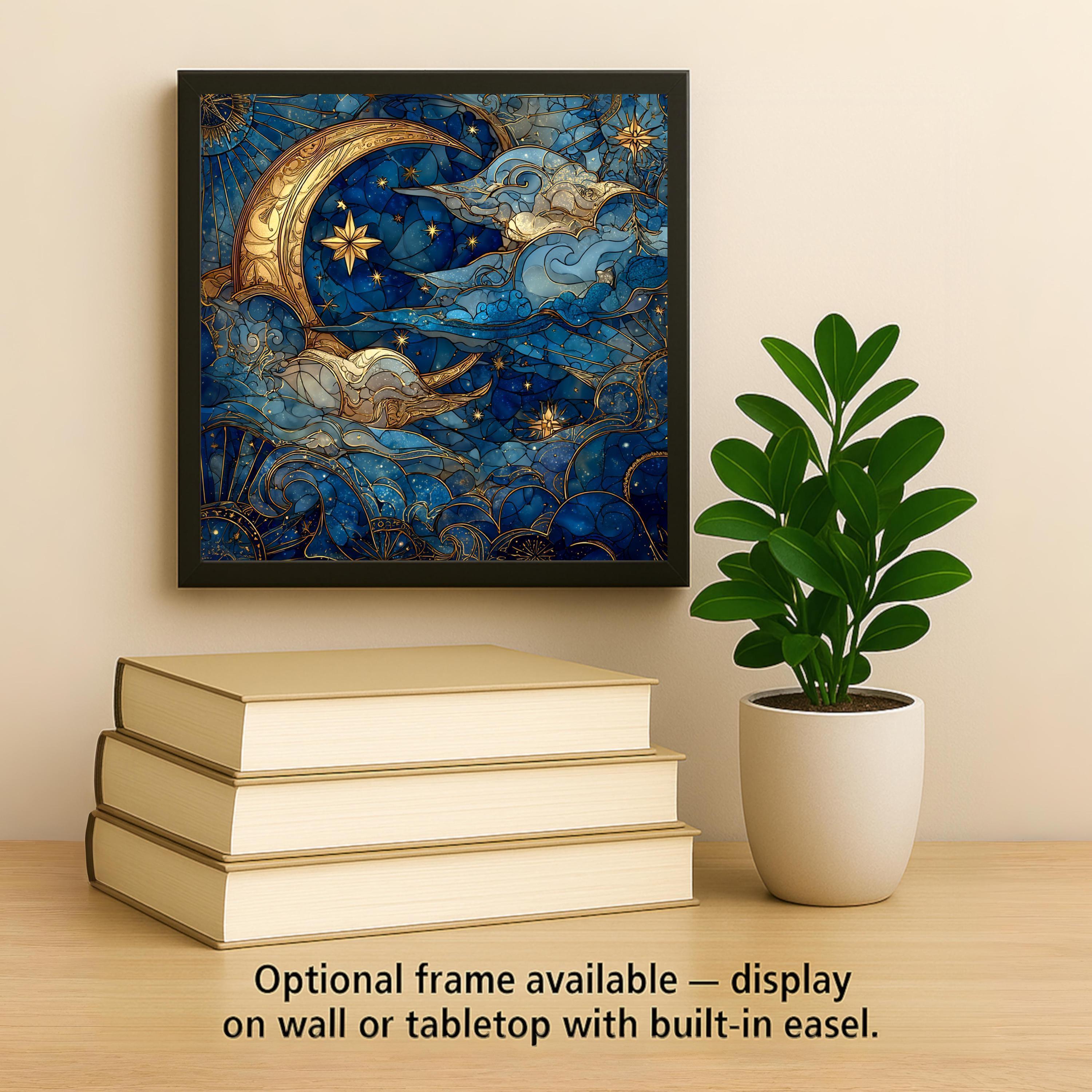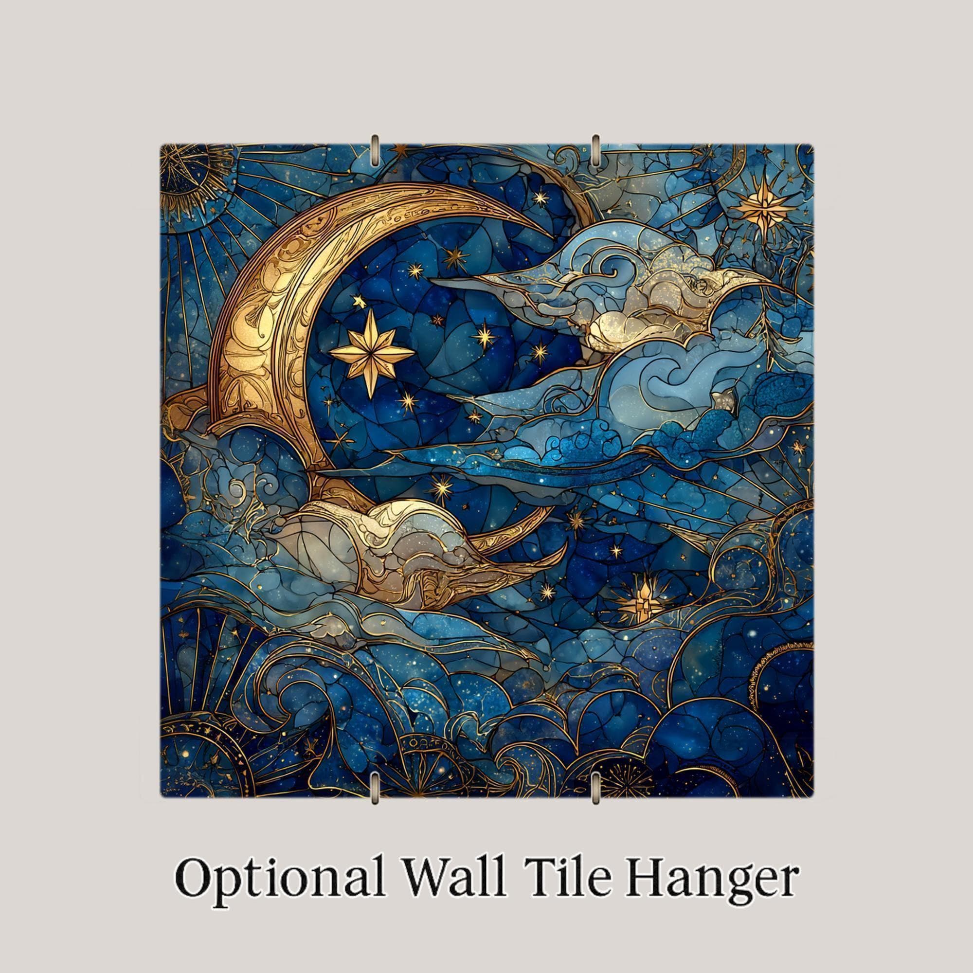 Optional accessories include a tile wall hanger, easel tile stand, cork backing, or a premium frame that functions as both wall decor and tabletop display. Each option allows you to customize how this celestial tile fits into your home or gifting plans.