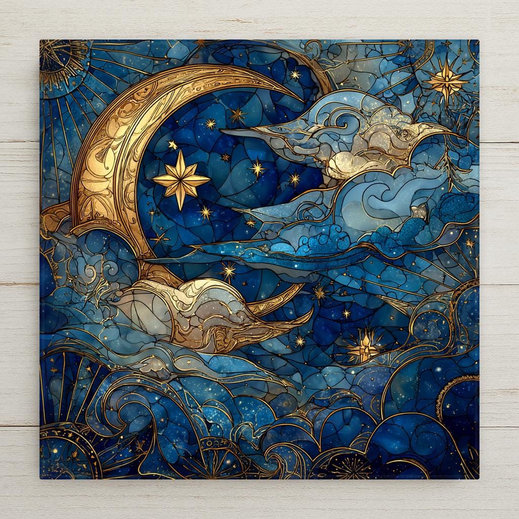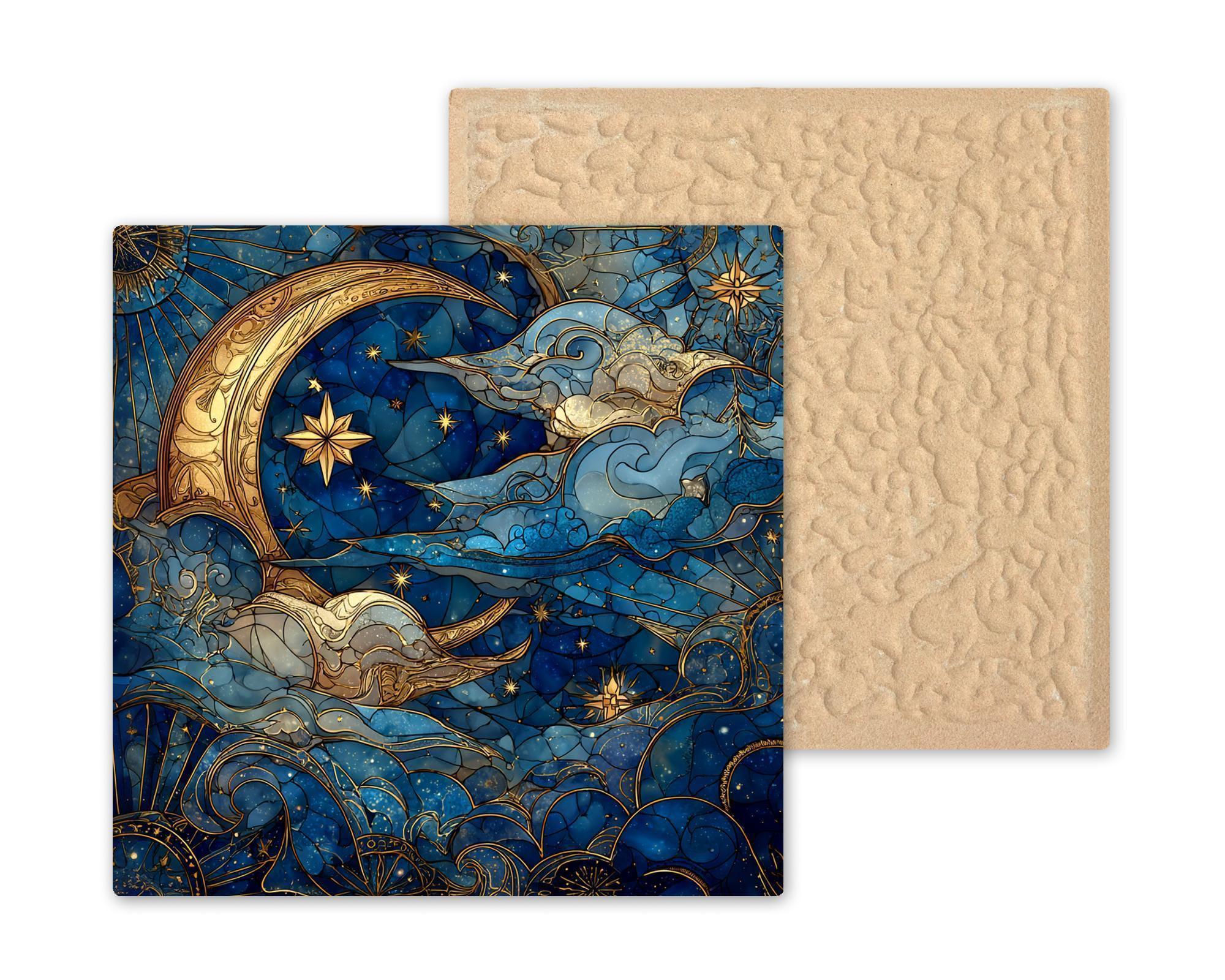 The moon has long been a symbol of intuition, guidance, and quiet strength. This stained glass style moon and stars ceramic tile wall art brings that symbolism into your home through a serene celestial design inspired by classic stained glass and Art Nouveau influences. Soft cloud forms and radiant star details create gentle movement while keeping the overall composition calming and balanced.