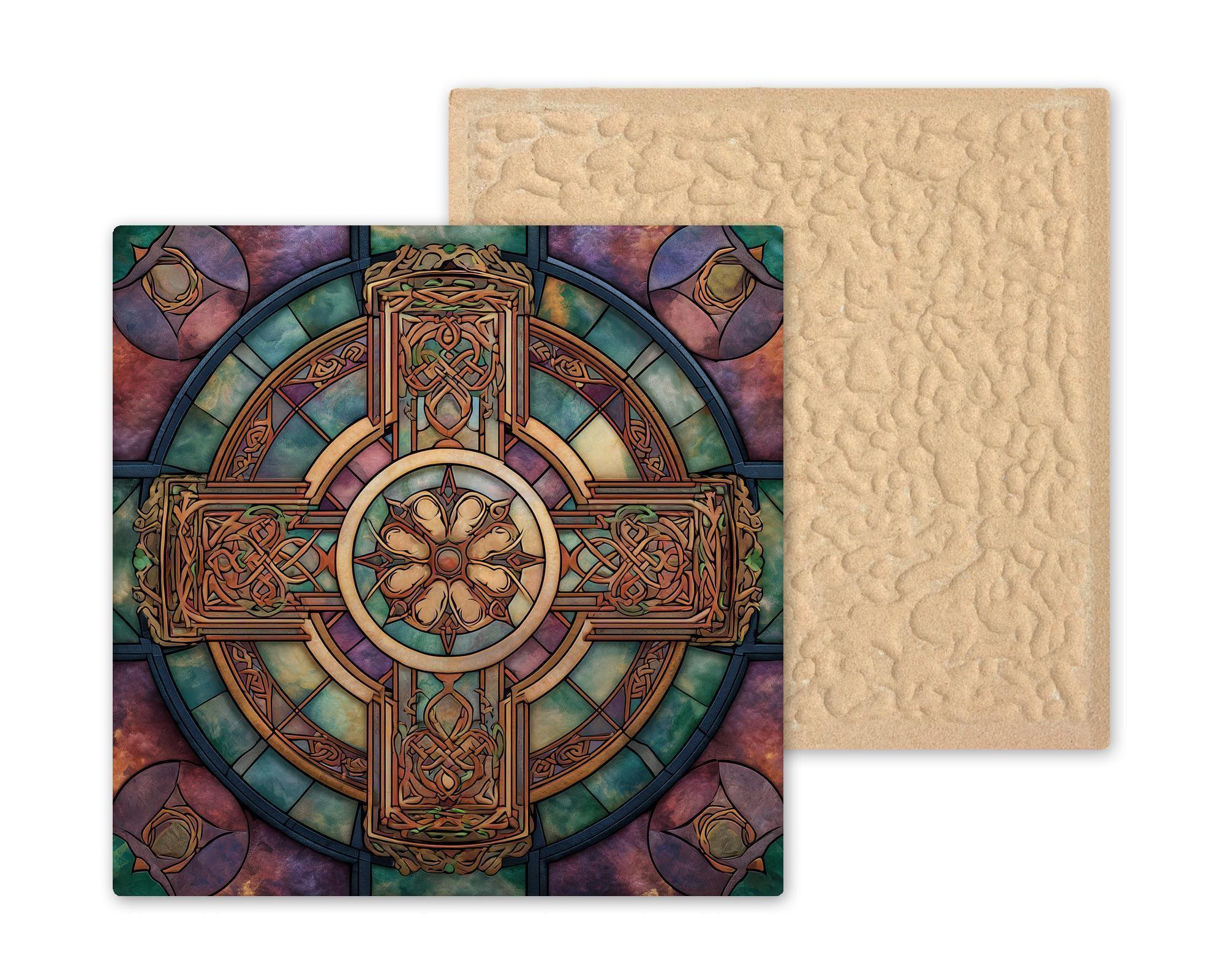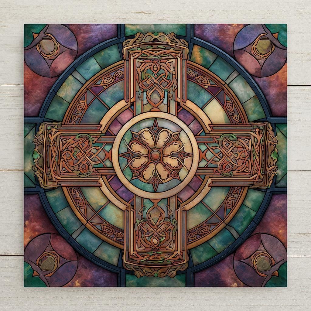 The Celtic cross is one of the most enduring symbols in Irish and Christian art, representing the intersection of the spiritual and earthly realms. This ceramic tile wall art interprets that tradition through a stained glass style composition filled with flowing knotwork, circular balance, and medieval ornamentation. The symmetrical layout and interwoven lines reflect themes of unity, protection, and timeless faith.