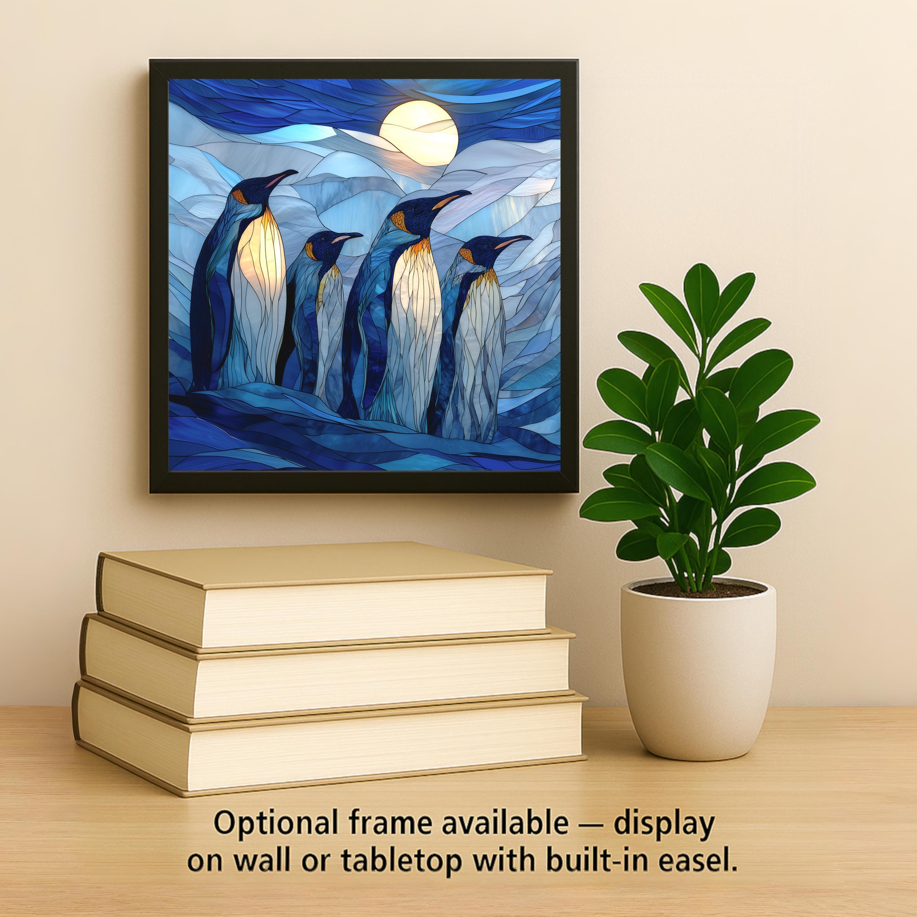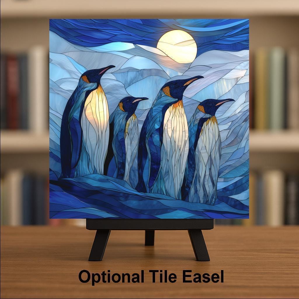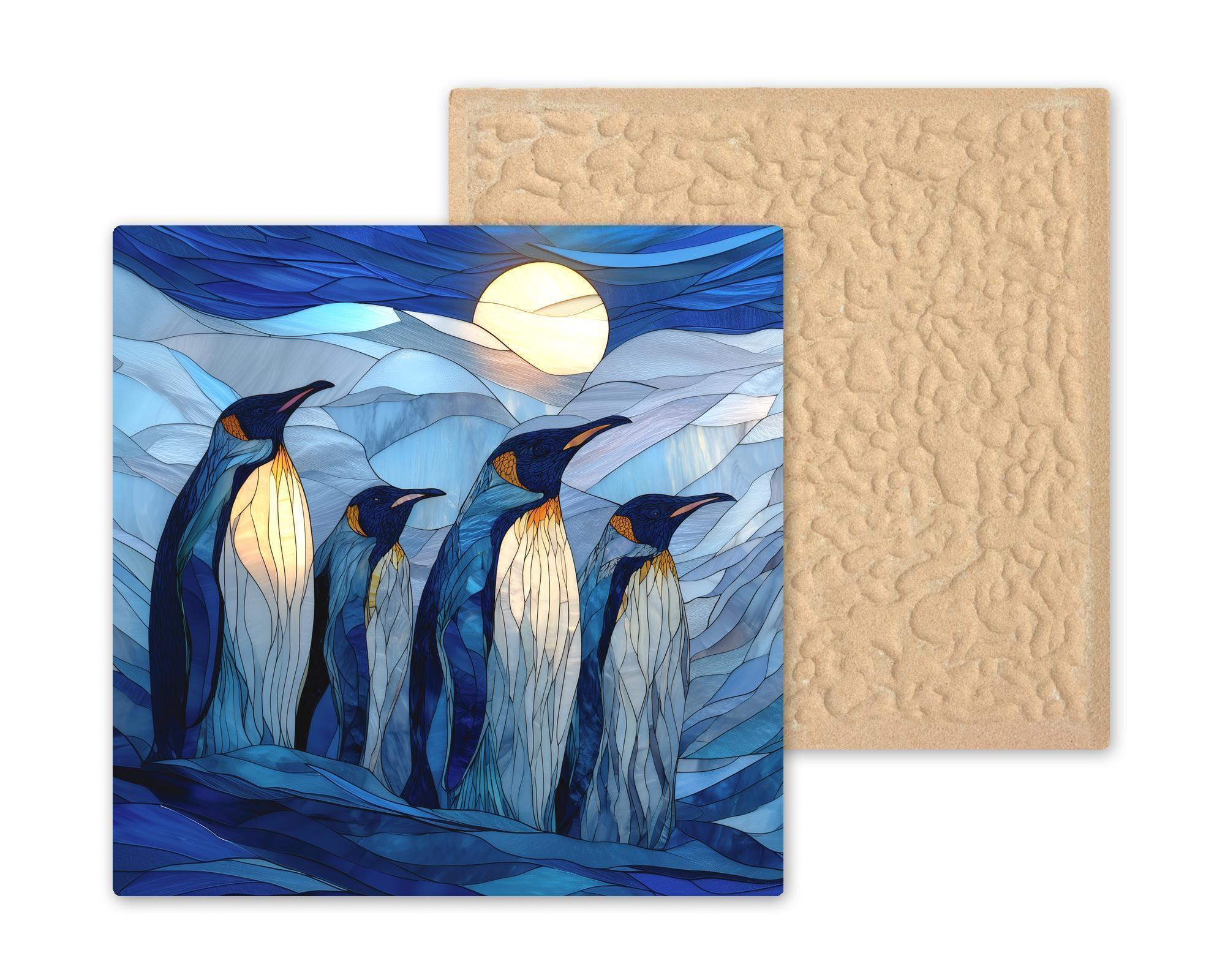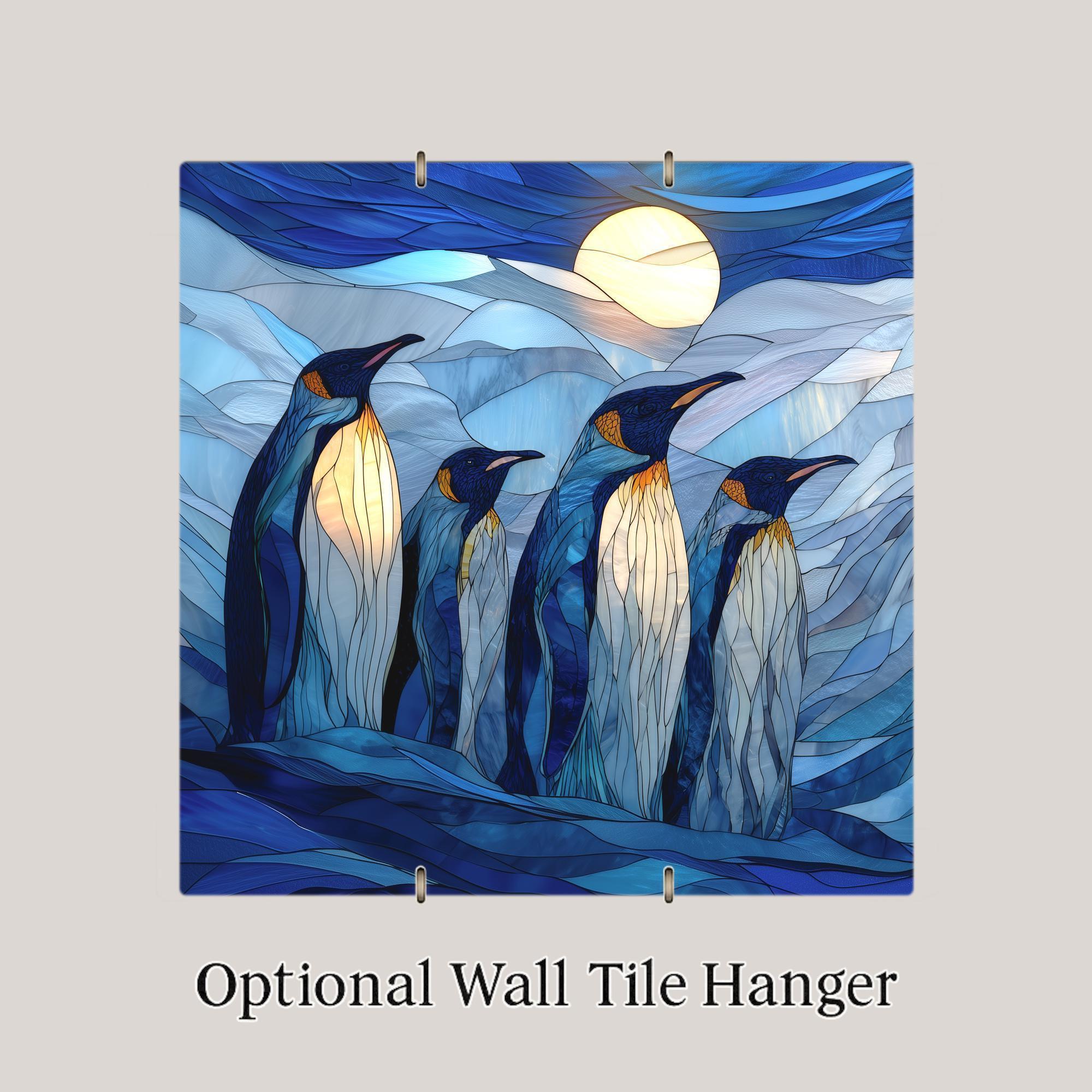 Penguins are often associated with loyalty, resilience, and community, and this stained glass–style ceramic tile captures those qualities through elegant composition and color harmony. The cool arctic palette paired with soft moonlight creates a tranquil mood that appeals to collectors seeking meaningful wall art with emotional depth. The flowing lines and layered glass effect draw the eye while maintaining a calm, balanced presence within any room.