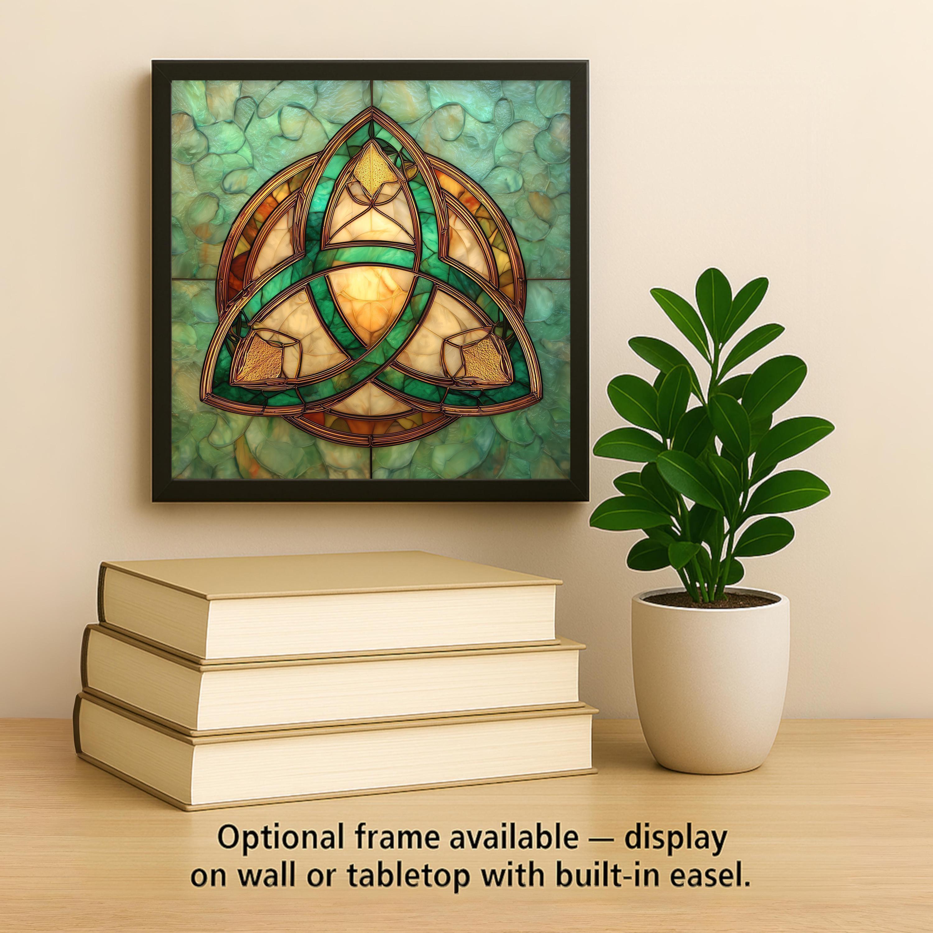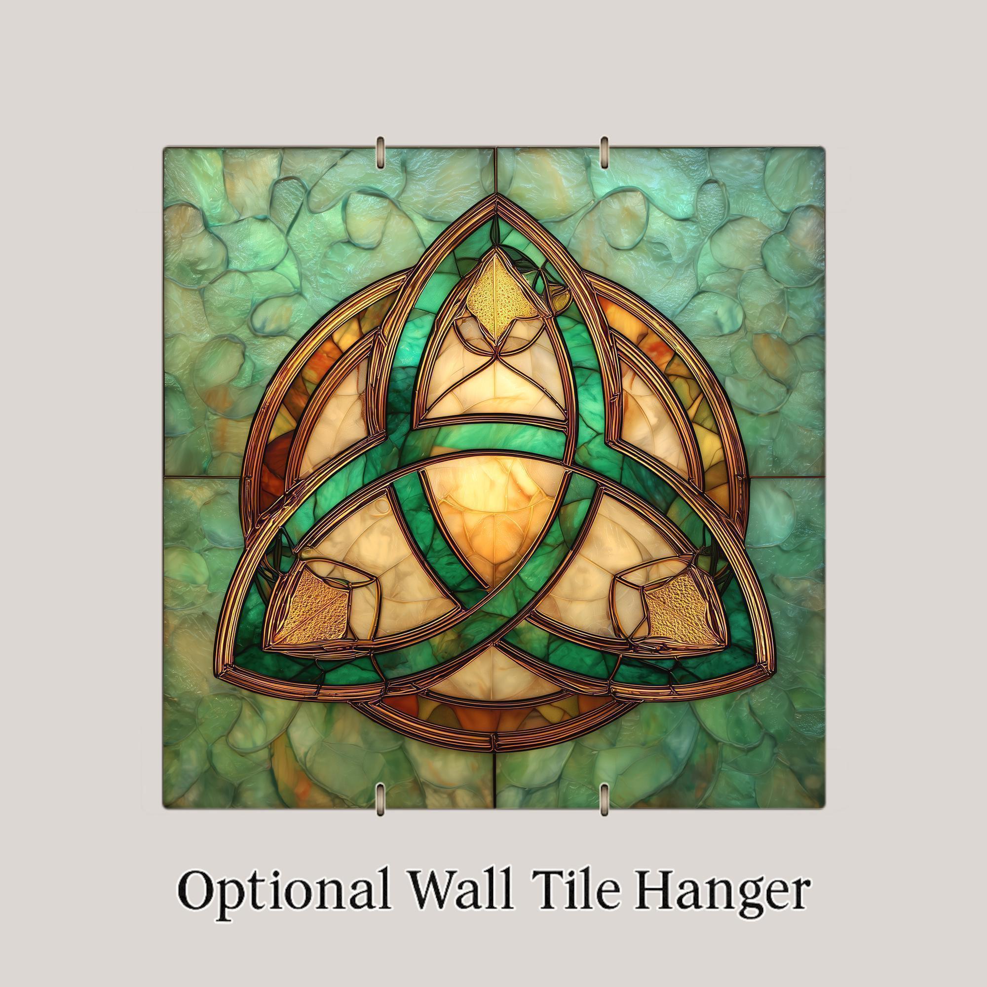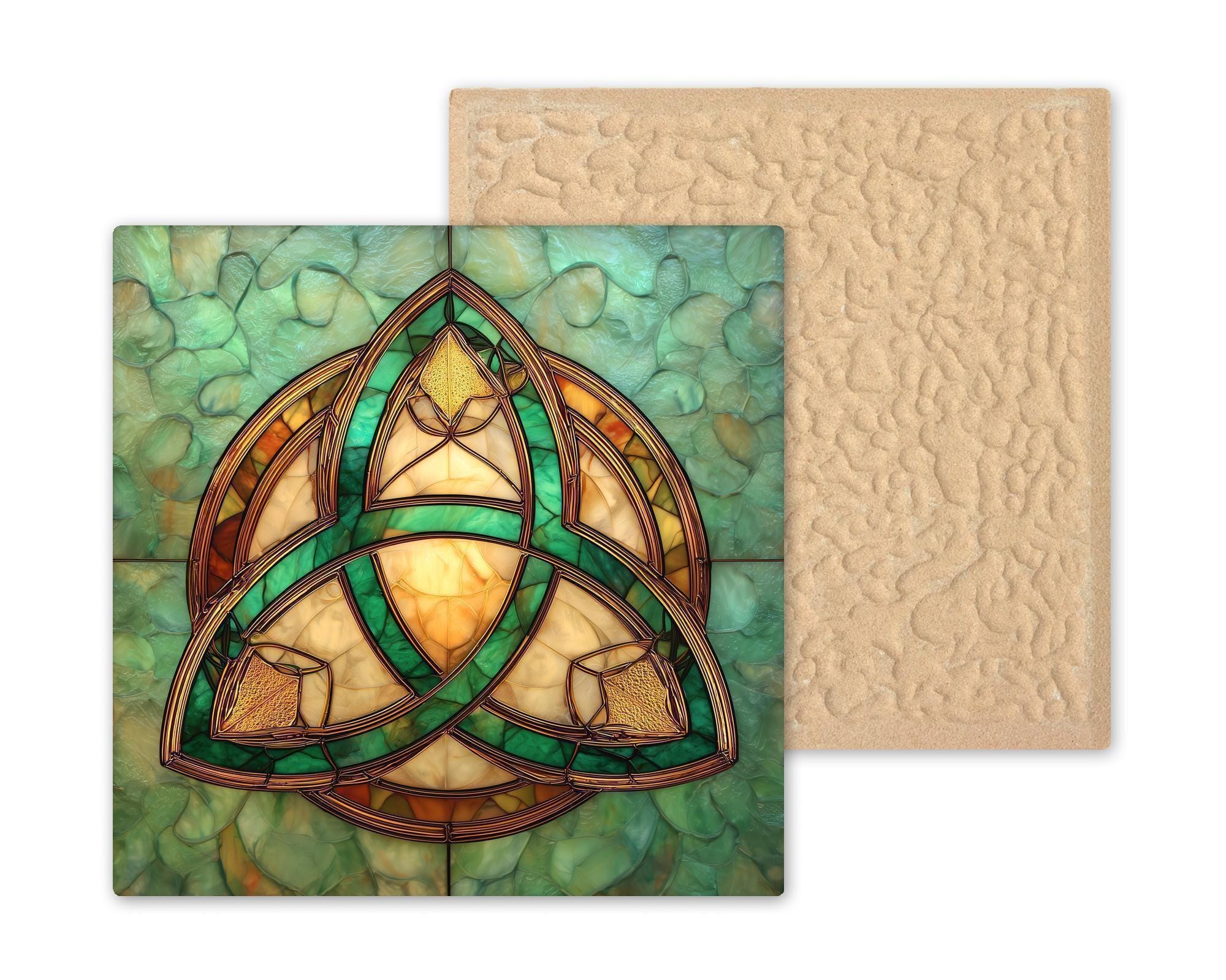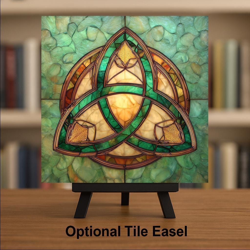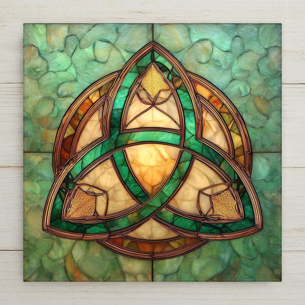 Designed for collectors who appreciate symbolic art with meaning, this Celtic Trinity Knot tile brings a calm yet powerful presence to any space. The stained glass style creates a luminous effect, with layered glass-like shapes that catch the eye without overwhelming the room. The soft jade-green background enhances the golden knotwork, making the symbol stand out while still feeling harmonious and serene.