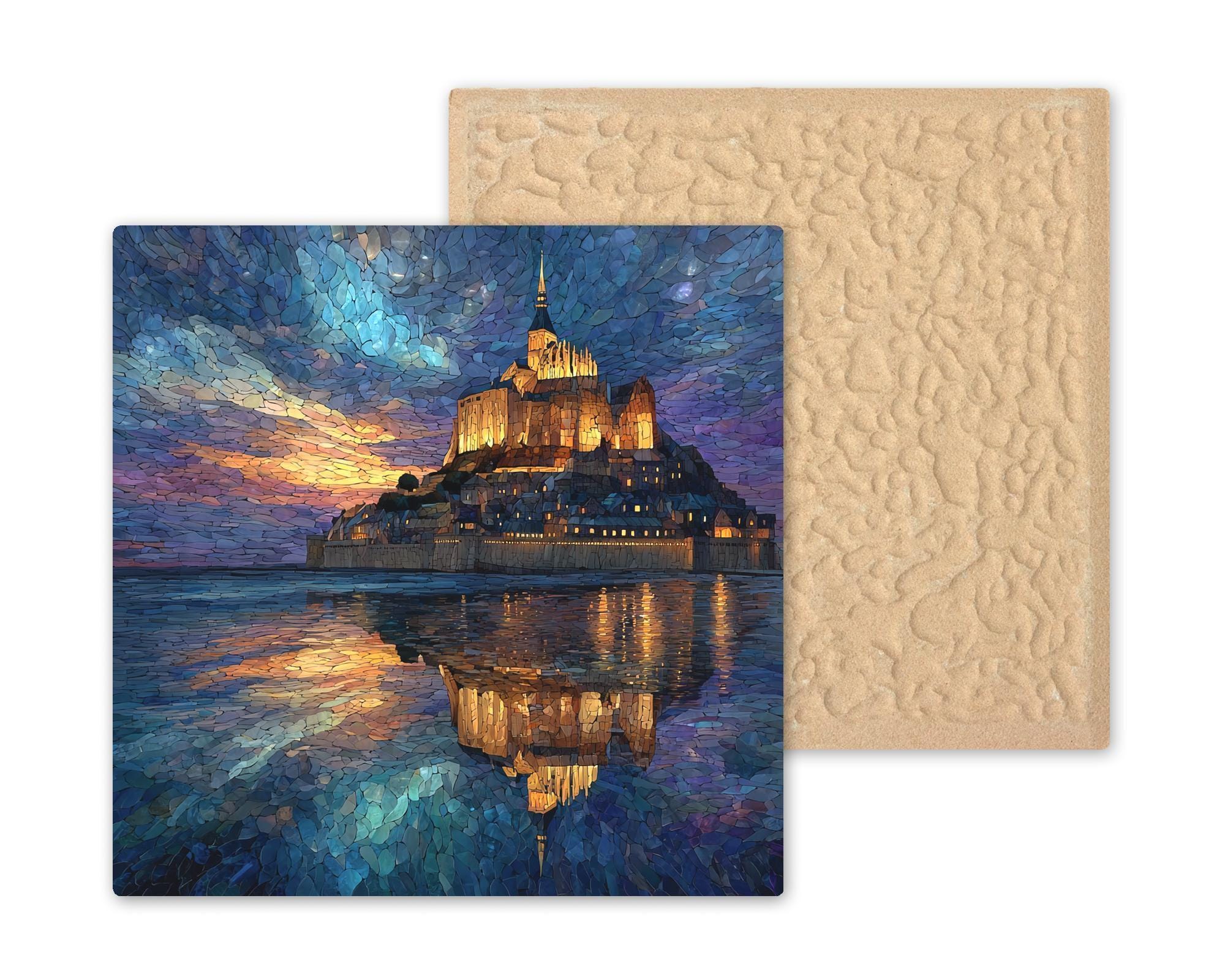 Mont-Saint-Michel has inspired artists and travelers for centuries, and this ceramic tile wall decor translates that iconic silhouette into a collectible work of art. The stained-glass-inspired composition emphasizes flowing reflections, glowing windows, and the dramatic meeting of sky and sea—elements that resonate strongly with buyers seeking art with meaning and destination-based home decor.