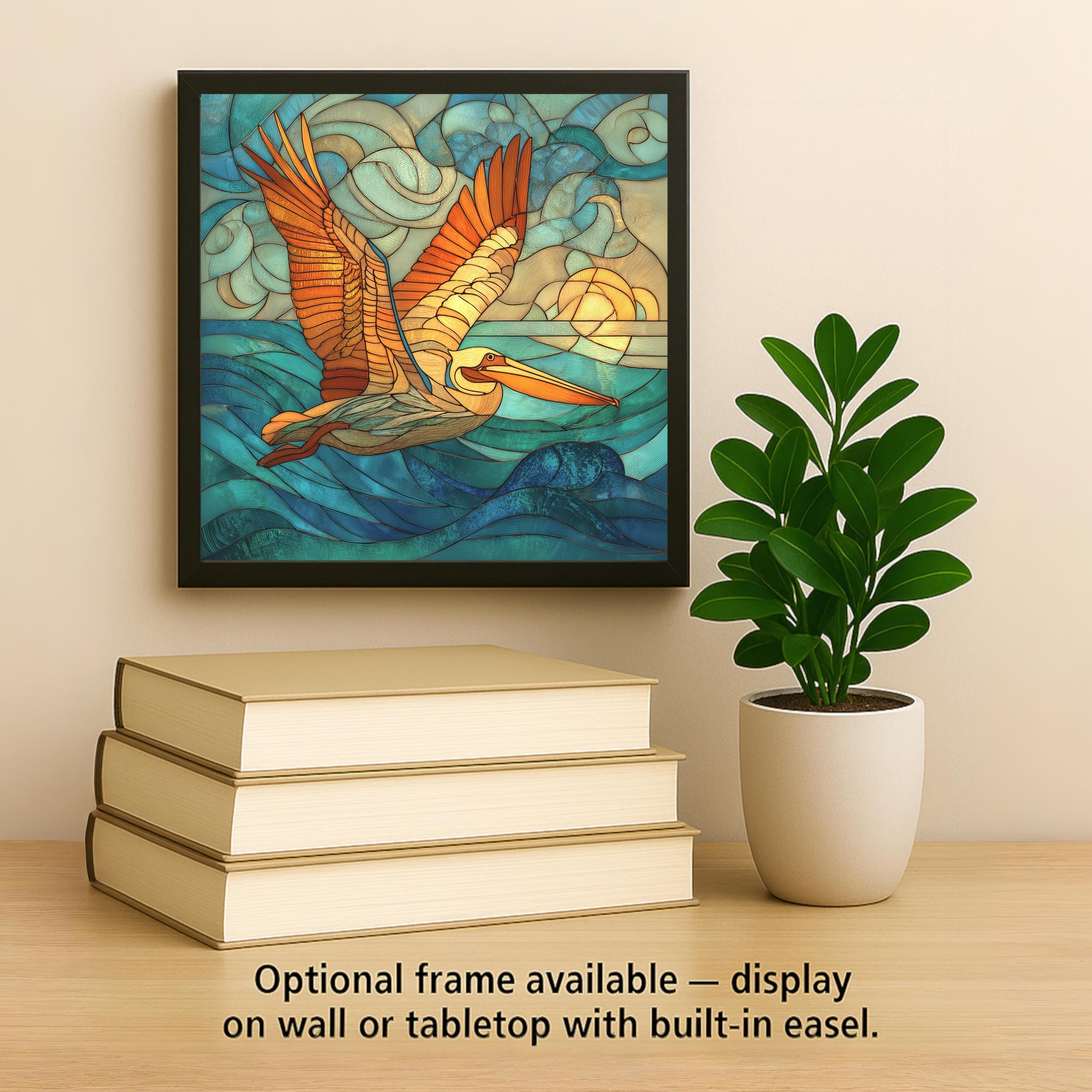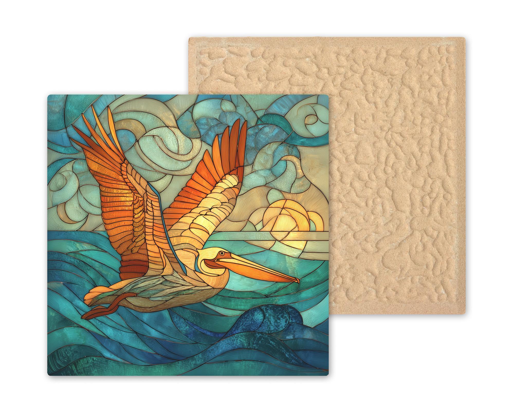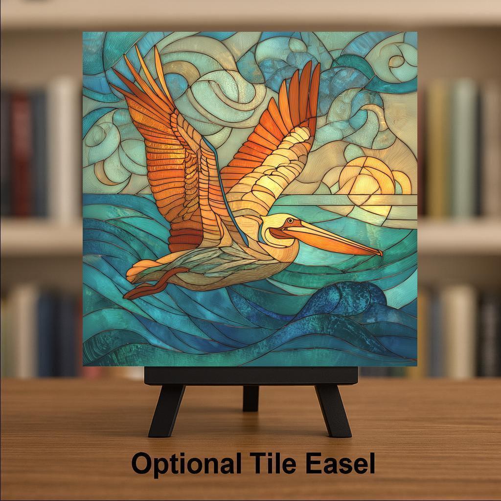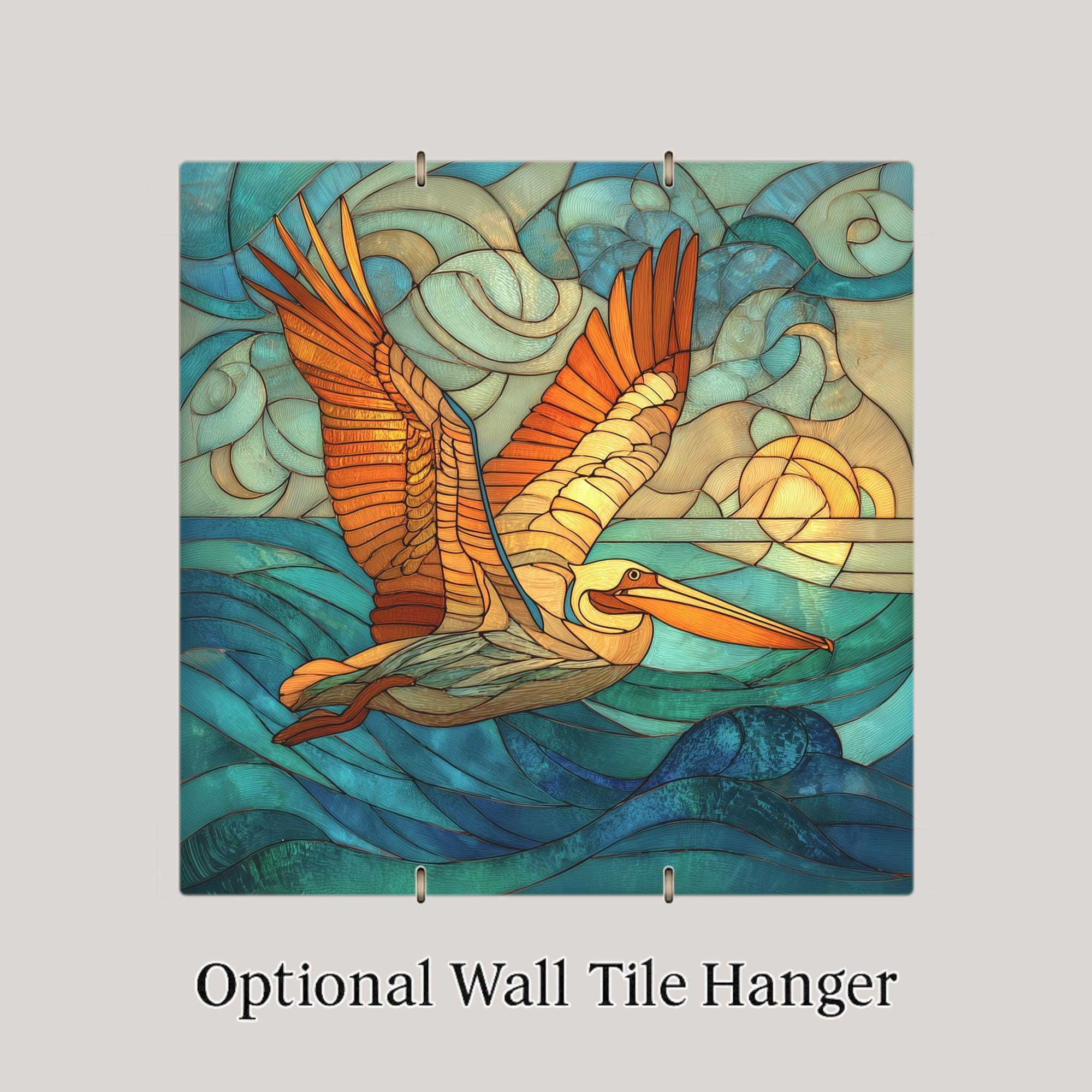 Inspired by coastal light and open water, this stained glass–style pelican ceramic tile brings movement and warmth into any space. The sweeping wings, layered ocean tones, and glowing sun create a sense of motion that draws the eye without overpowering the room. This balance makes the tile ideal for wall decor in living rooms, entryways, bedrooms, offices, or beach-themed spaces.