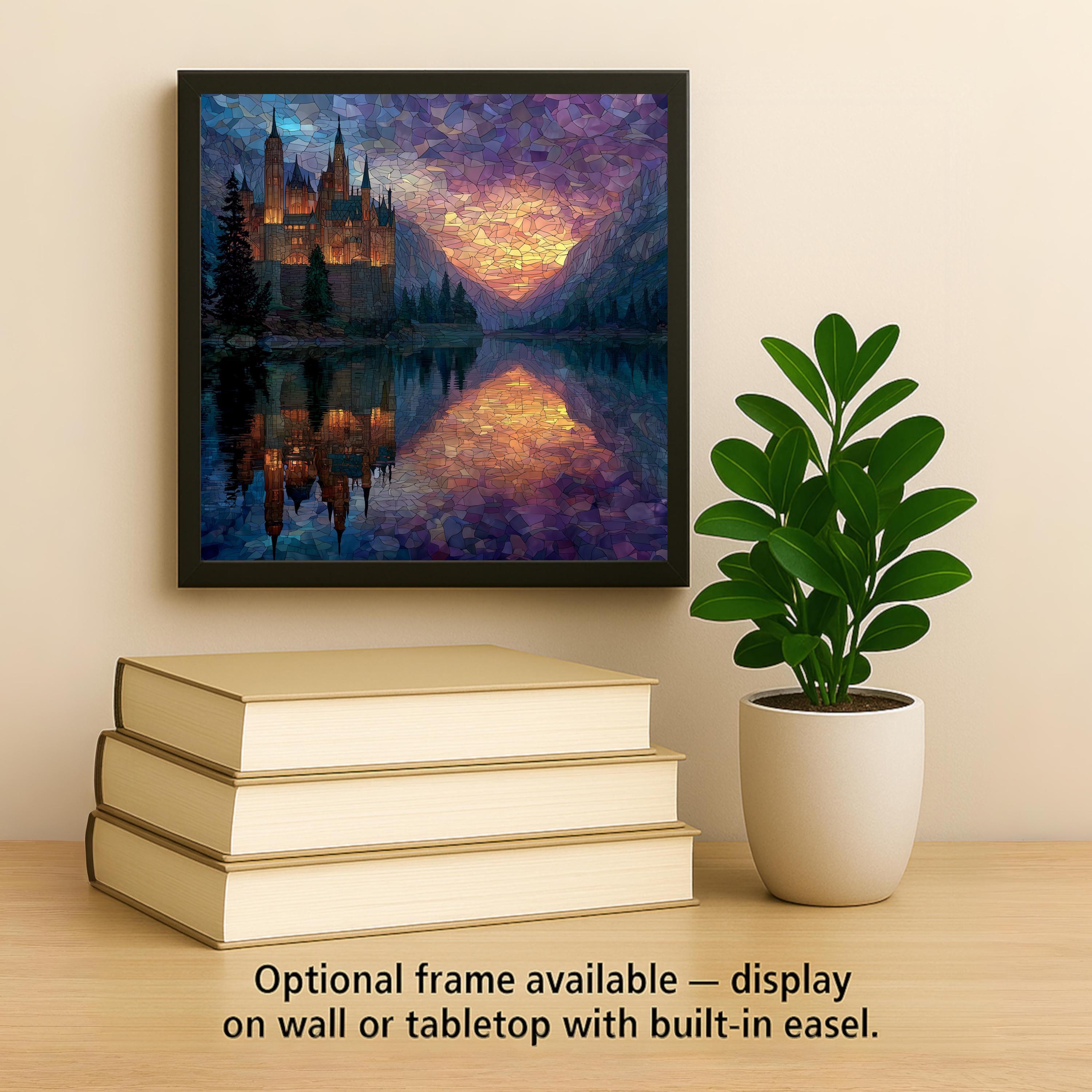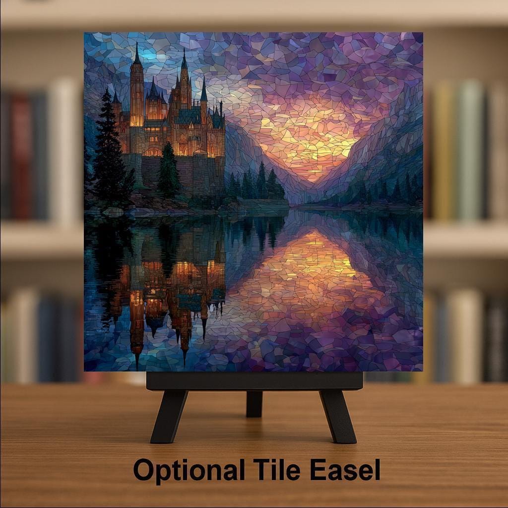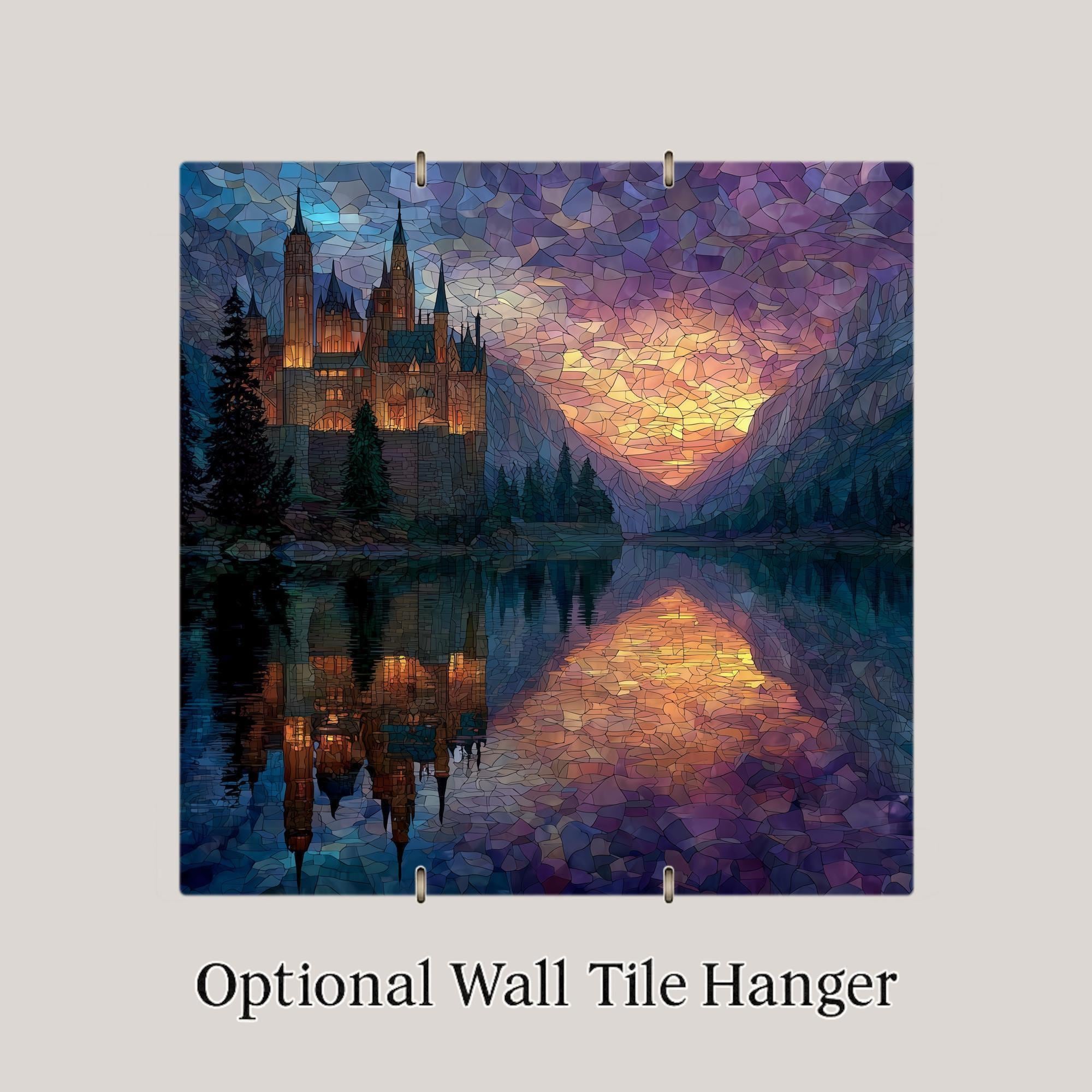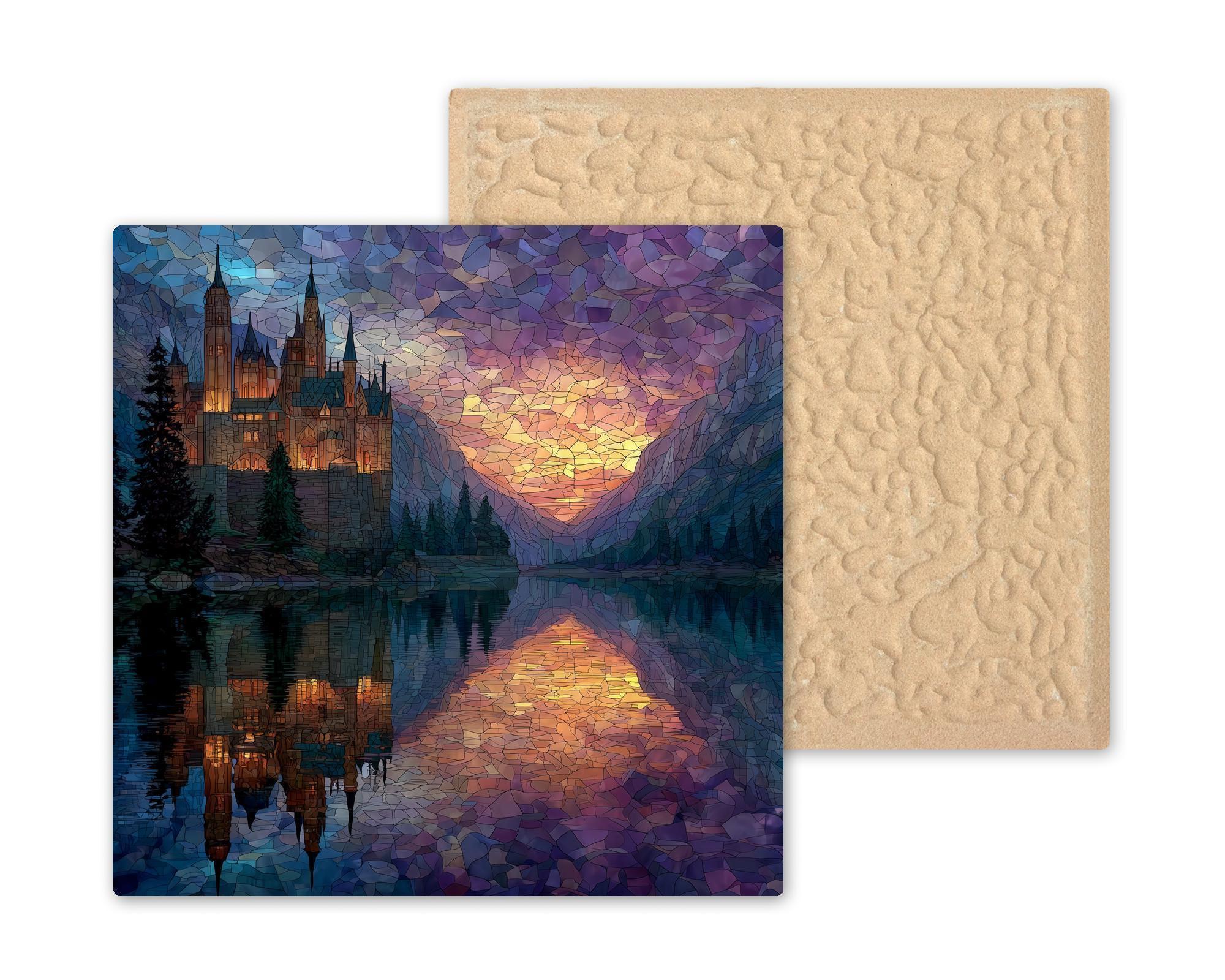Inspired by the legendary Neuschwanstein Castle in Bavaria, Germany, this ceramic tile wall art blends historic charm with a modern stained glass–style aesthetic. The castle rises above a peaceful alpine lake, glowing with warm light as the sky shifts into soft purples, golds, and blues. The reflection below adds balance and serenity, making this artwork feel calm, magical, and inviting.