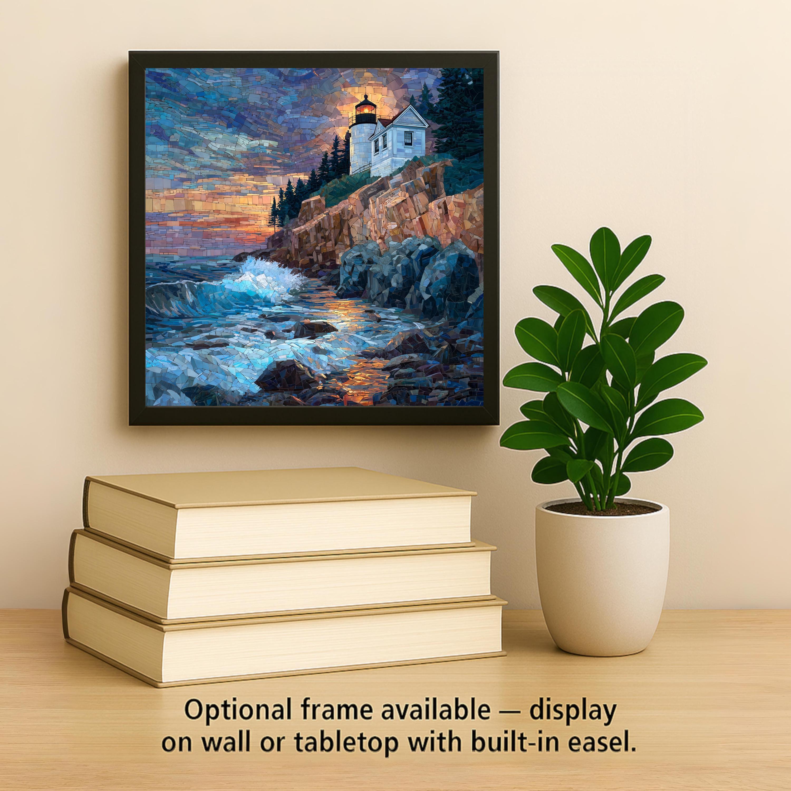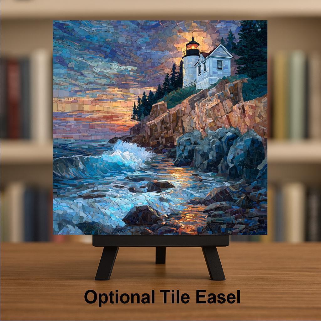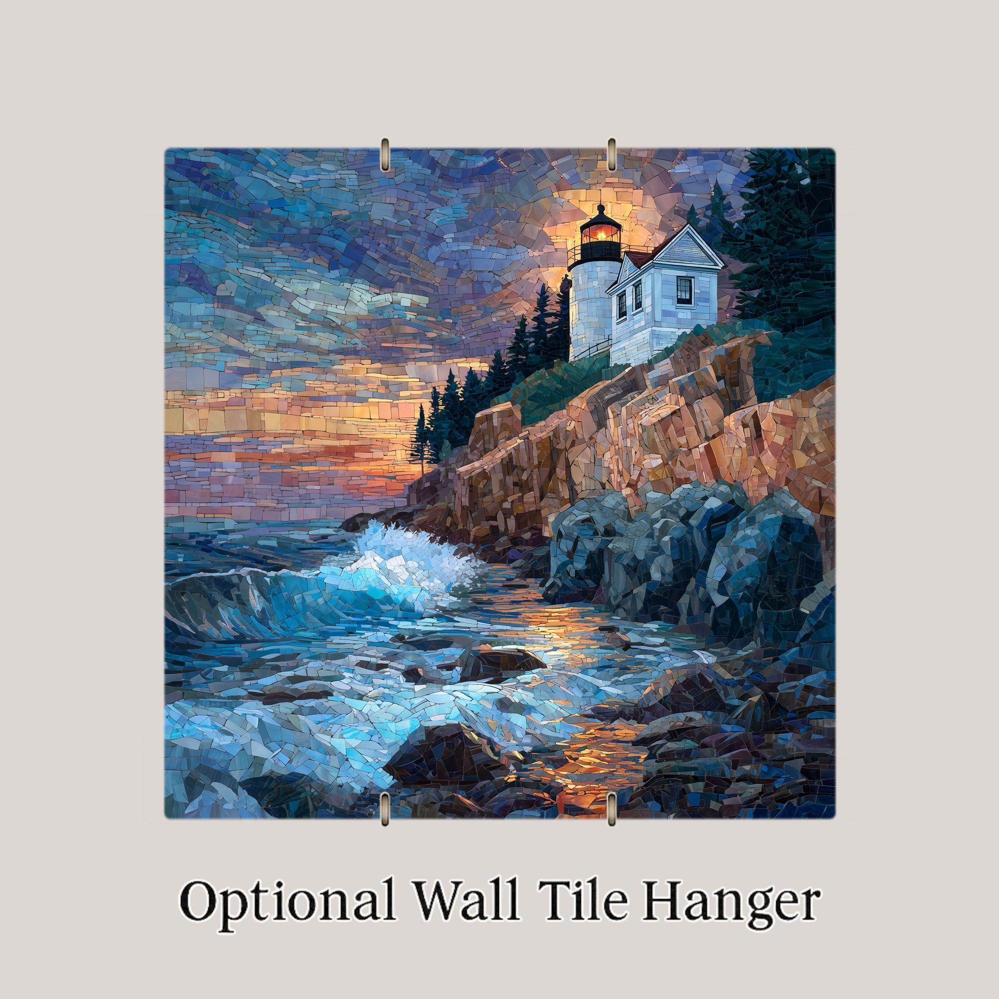 Each tile is made to order and carefully packaged for safe delivery. Optional accessories—including a tile wall hanger, easel tile stand, cork backing, or premium frame—allow you to customize how the artwork is displayed. This Bass Harbor Head Lighthouse ceramic tile art is designed to bring lasting coastal charm and visual warmth to your home decor.