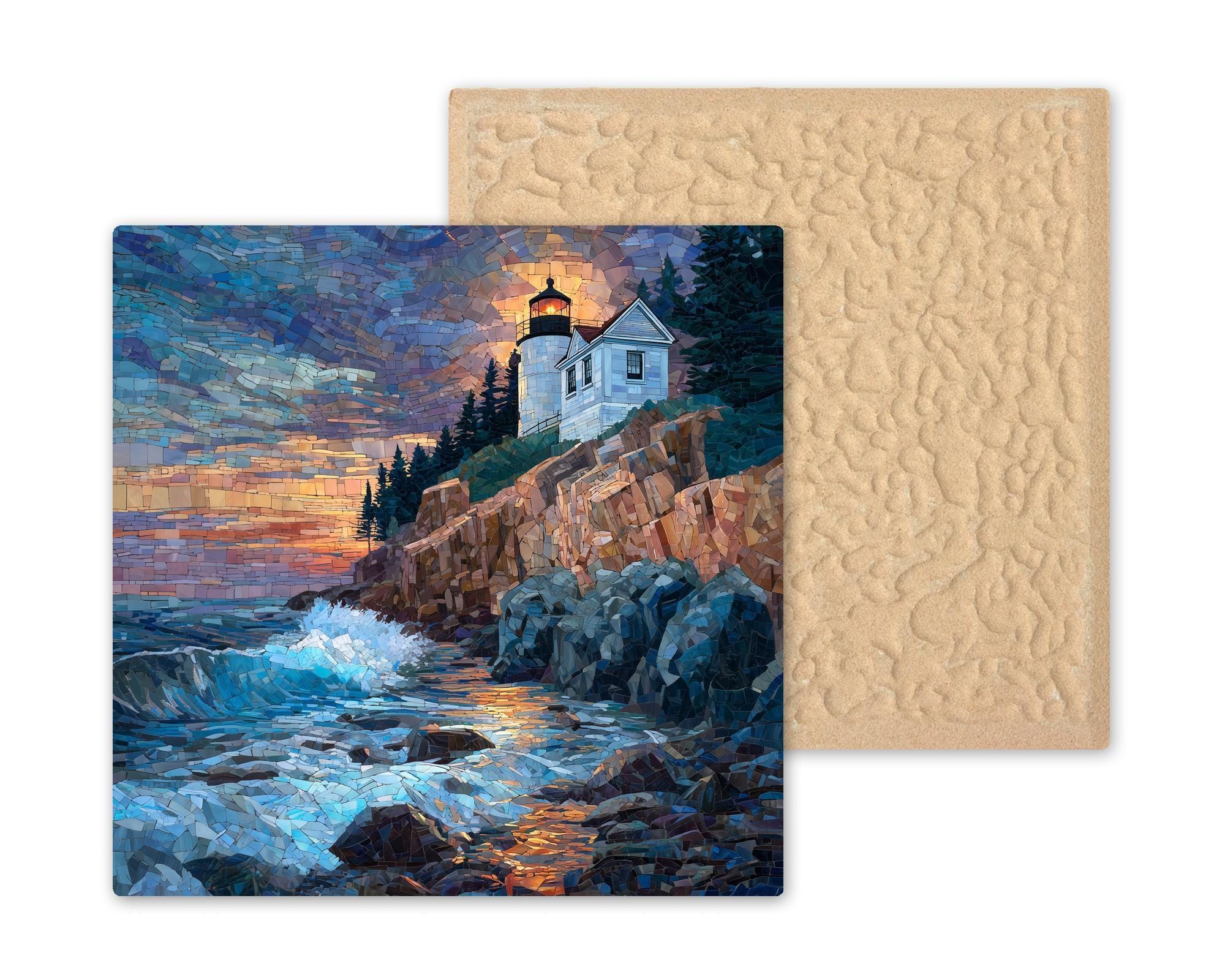 Designed to reflect the beauty of the Maine coastline, this Bass Harbor lighthouse ceramic tile wall art blends stained glass style with coastal landscape imagery. The layered mosaic effect gives the ocean waves and sky a sense of motion, while the lighthouse glow creates a peaceful focal point. This coastal wall decor fits effortlessly into nautical, beach, and nature-inspired interiors.