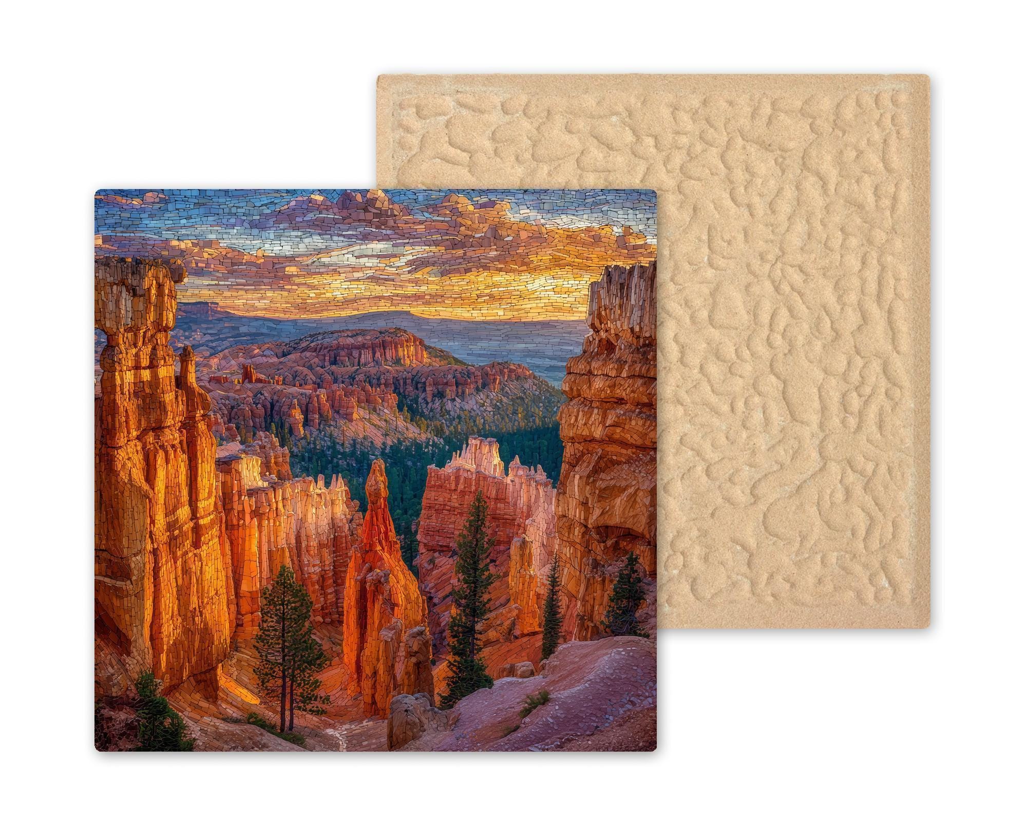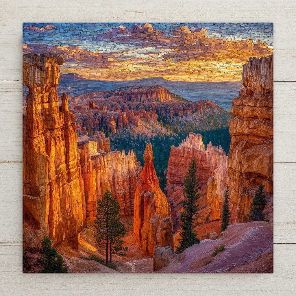 Inspired by the rugged beauty of Utah’s high desert, this Bryce Canyon ceramic tile wall art blends stained glass style with classic national park imagery. The mosaic effect emphasizes the vertical forms of the hoodoos and the layered textures of the canyon walls, creating a sense of depth and natural rhythm.