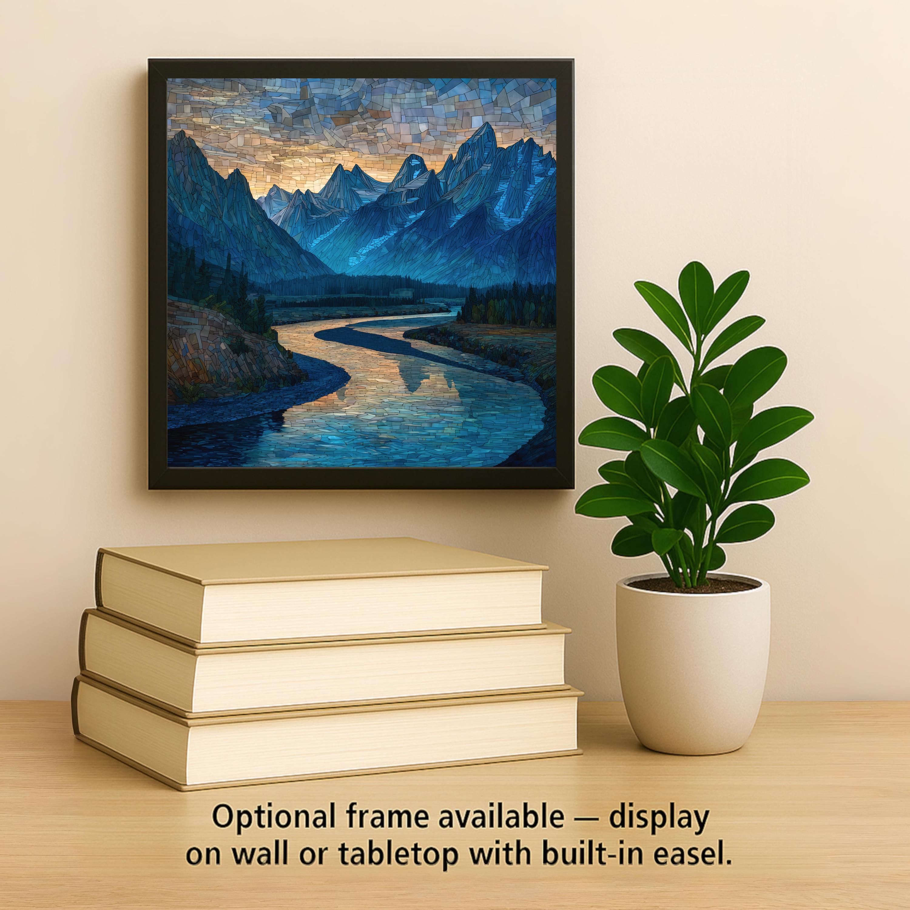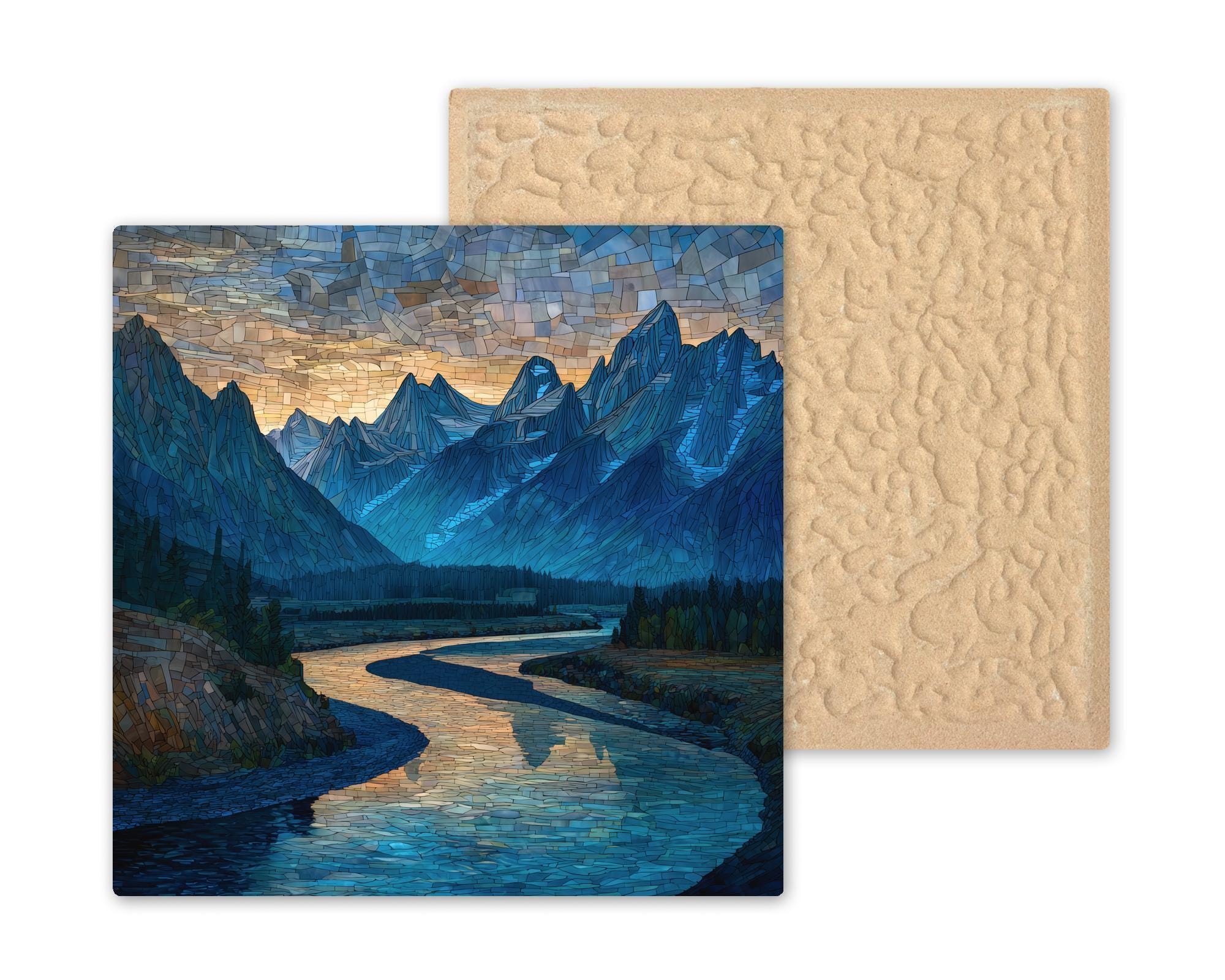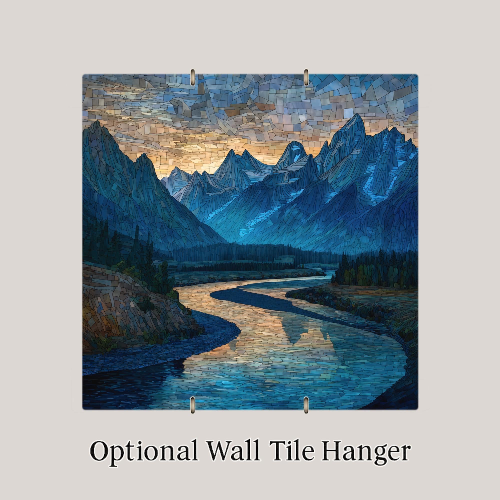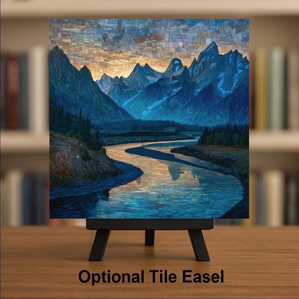 Inspired by the sweeping landscapes of Wyoming, this Snake River ceramic tile wall art blends stained glass style with classic mountain scenery. The mosaic effect emphasizes the river’s graceful curves and the sharp vertical lines of the Teton peaks, creating a balanced and visually striking composition.