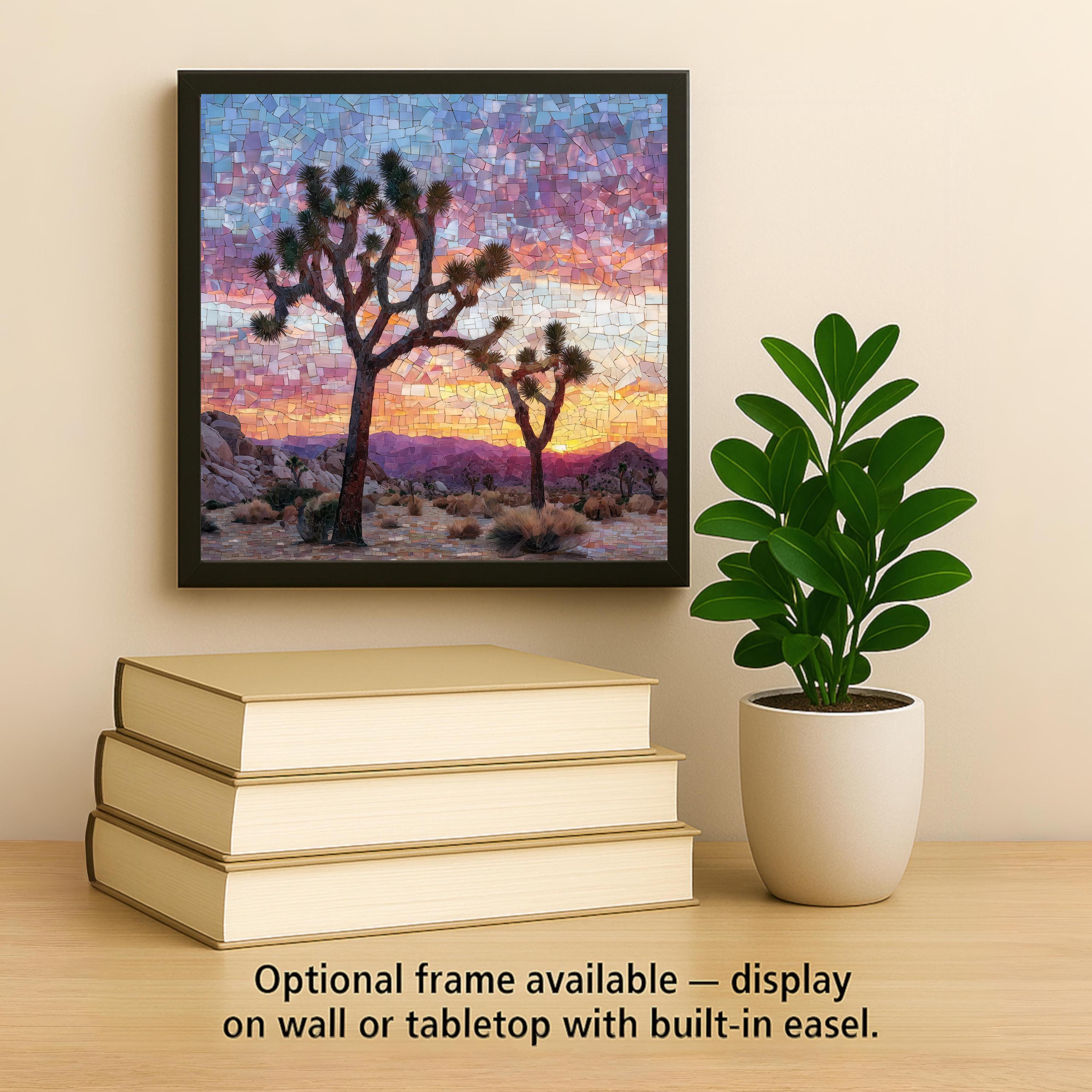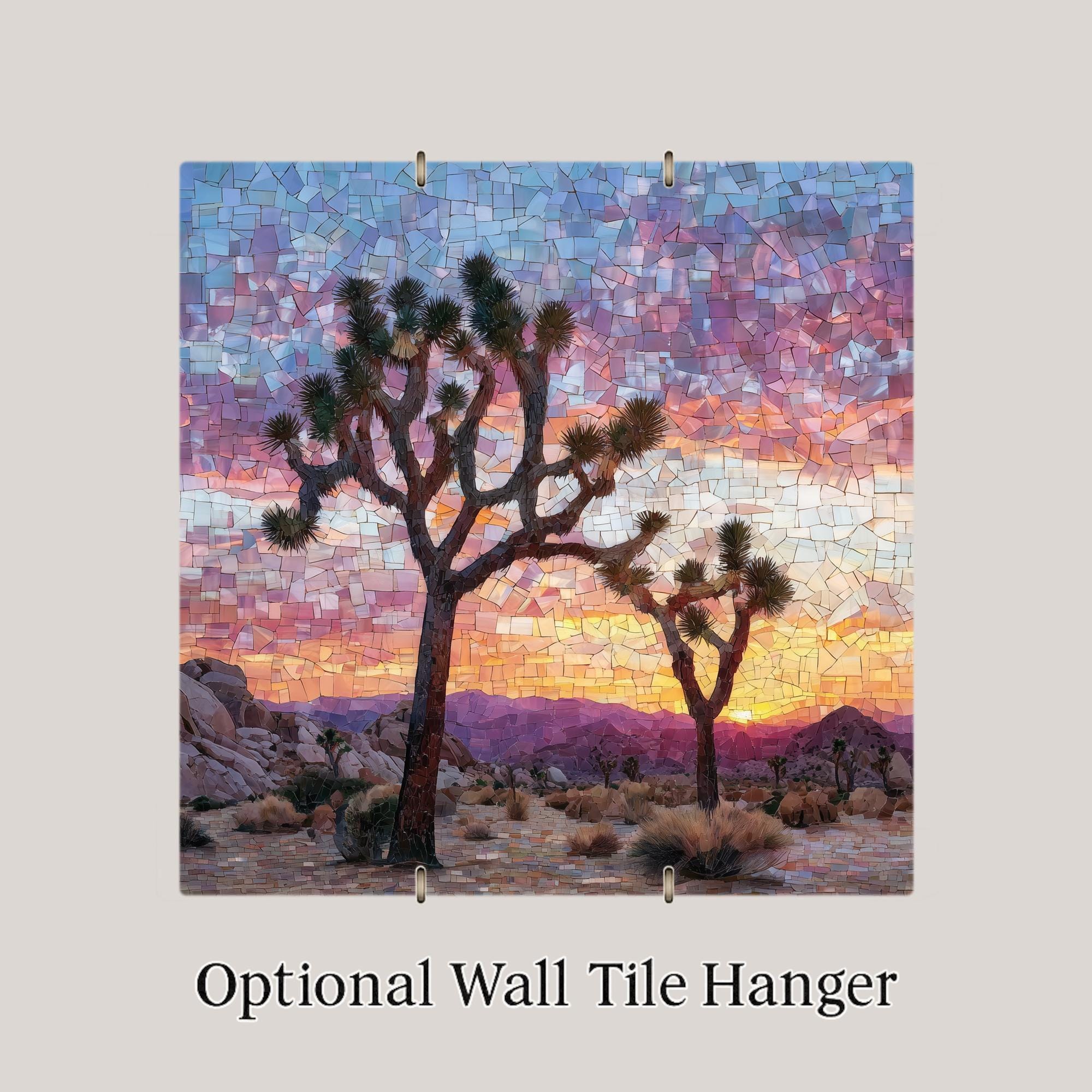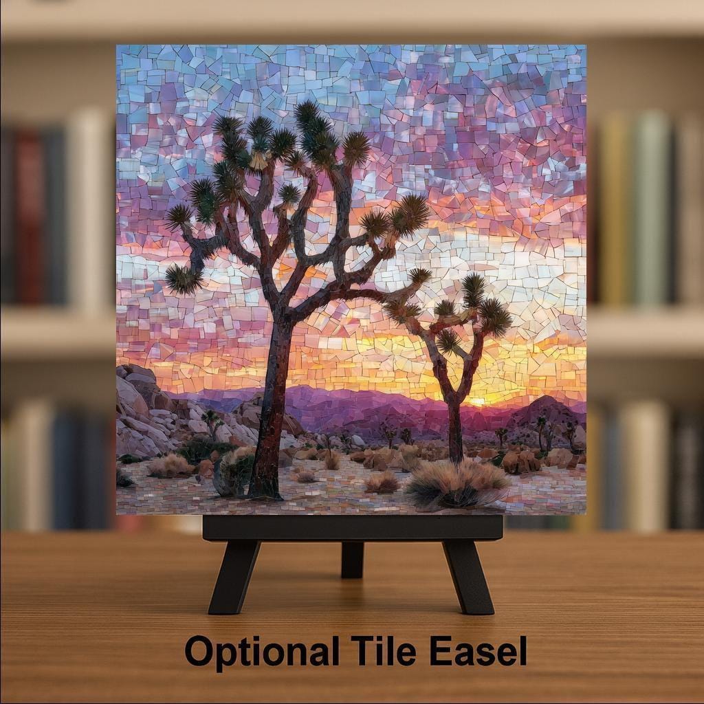Each tile is made to order and carefully packaged for safe delivery. Optional accessories—including a tile wall hanger, easel tile stand, cork backing, or a premium frame—allow you to customize how the artwork is displayed. This Joshua Tree ceramic tile art is designed to bring lasting beauty and a sense of calm desert atmosphere into your home decor.