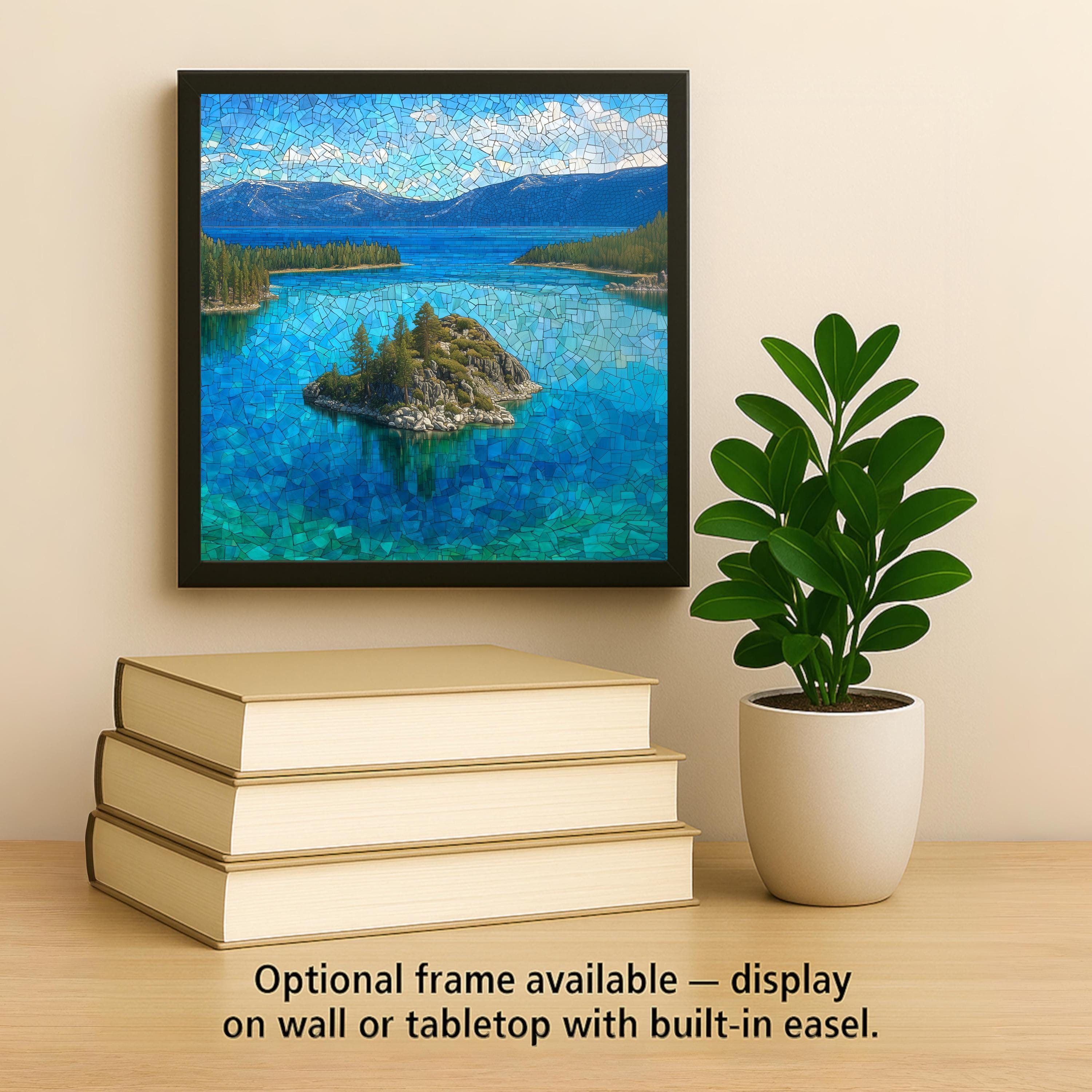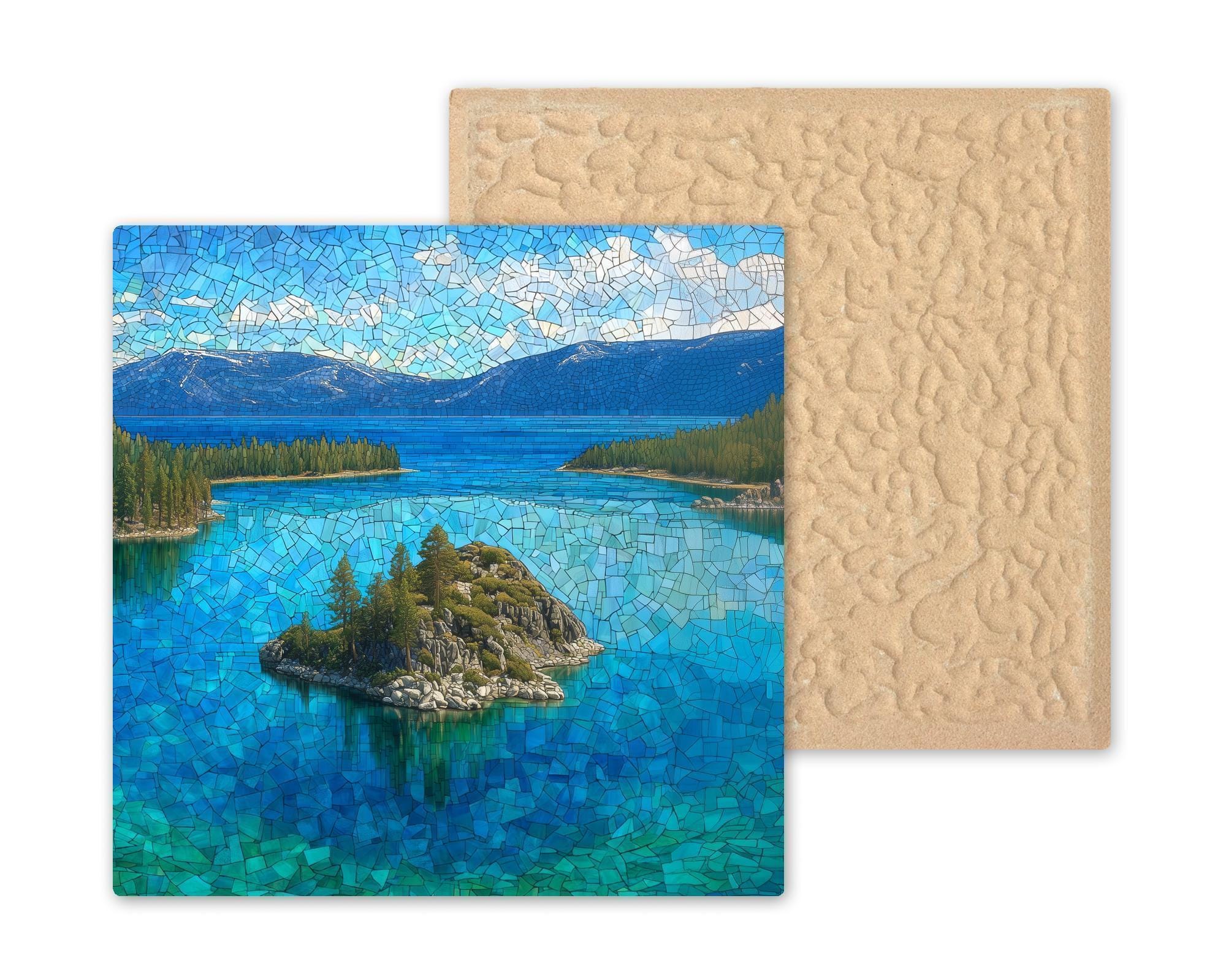 Inspired by the calm beauty of Lake Tahoe, this Emerald Bay ceramic tile wall art blends stained glass style with classic alpine scenery. The mosaic effect enhances the lake’s layered blues and greens while emphasizing the peaceful symmetry of the island and surrounding shoreline.