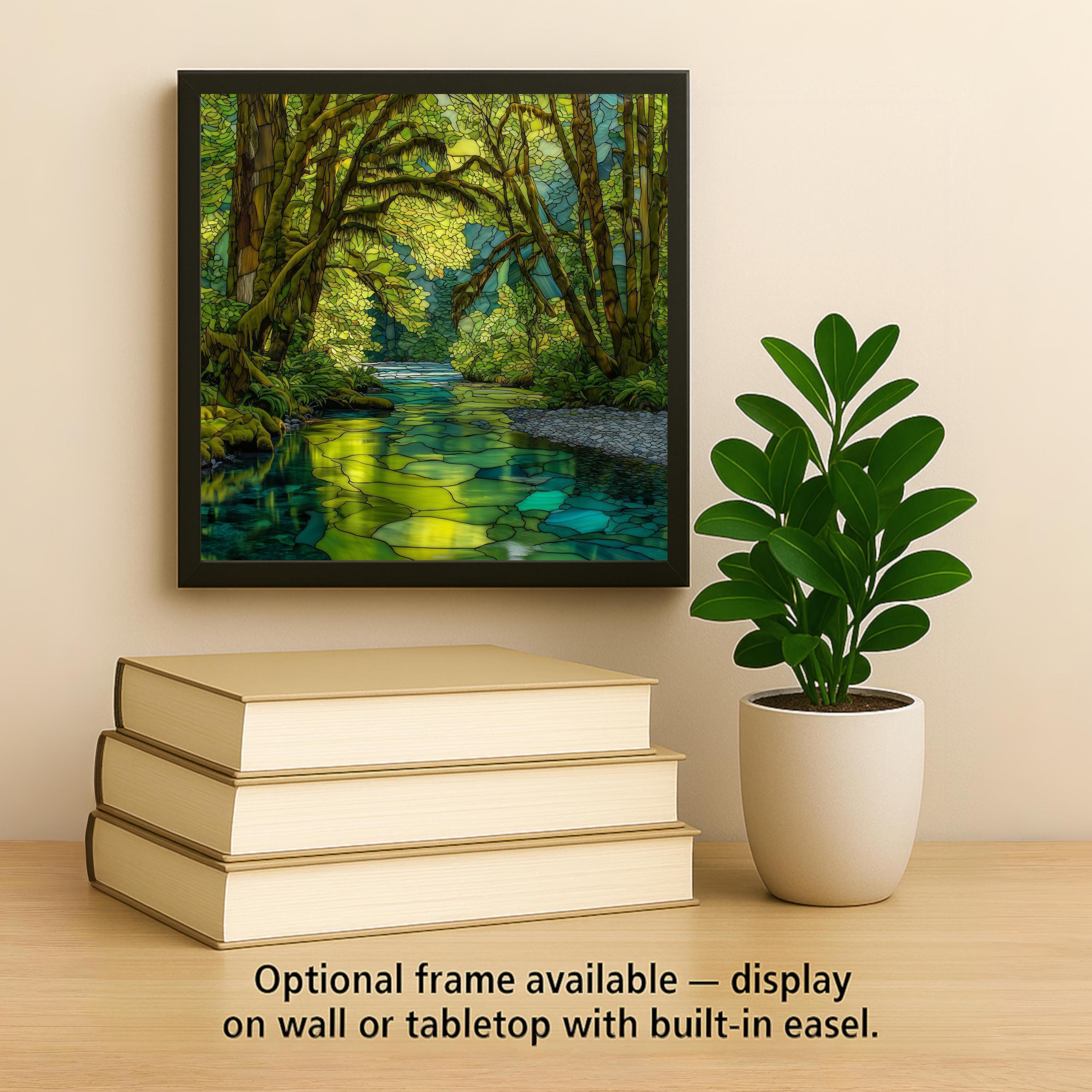 The stained glass–style design emphasizes organic movement and layered depth, allowing the greens and blues to glow with a soft, natural warmth. This artwork pairs beautifully with a variety of interiors, including coastal homes, cabins, forest-inspired spaces, and minimalist settings that benefit from a calming focal piece.