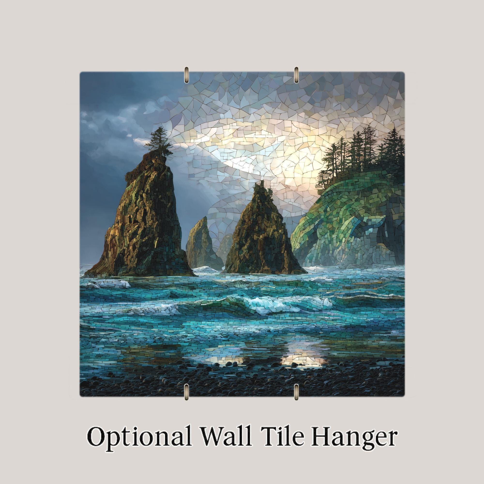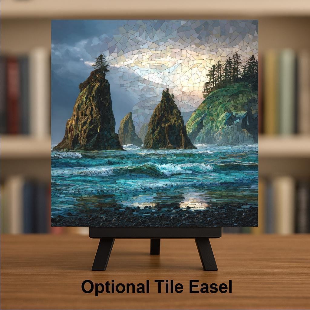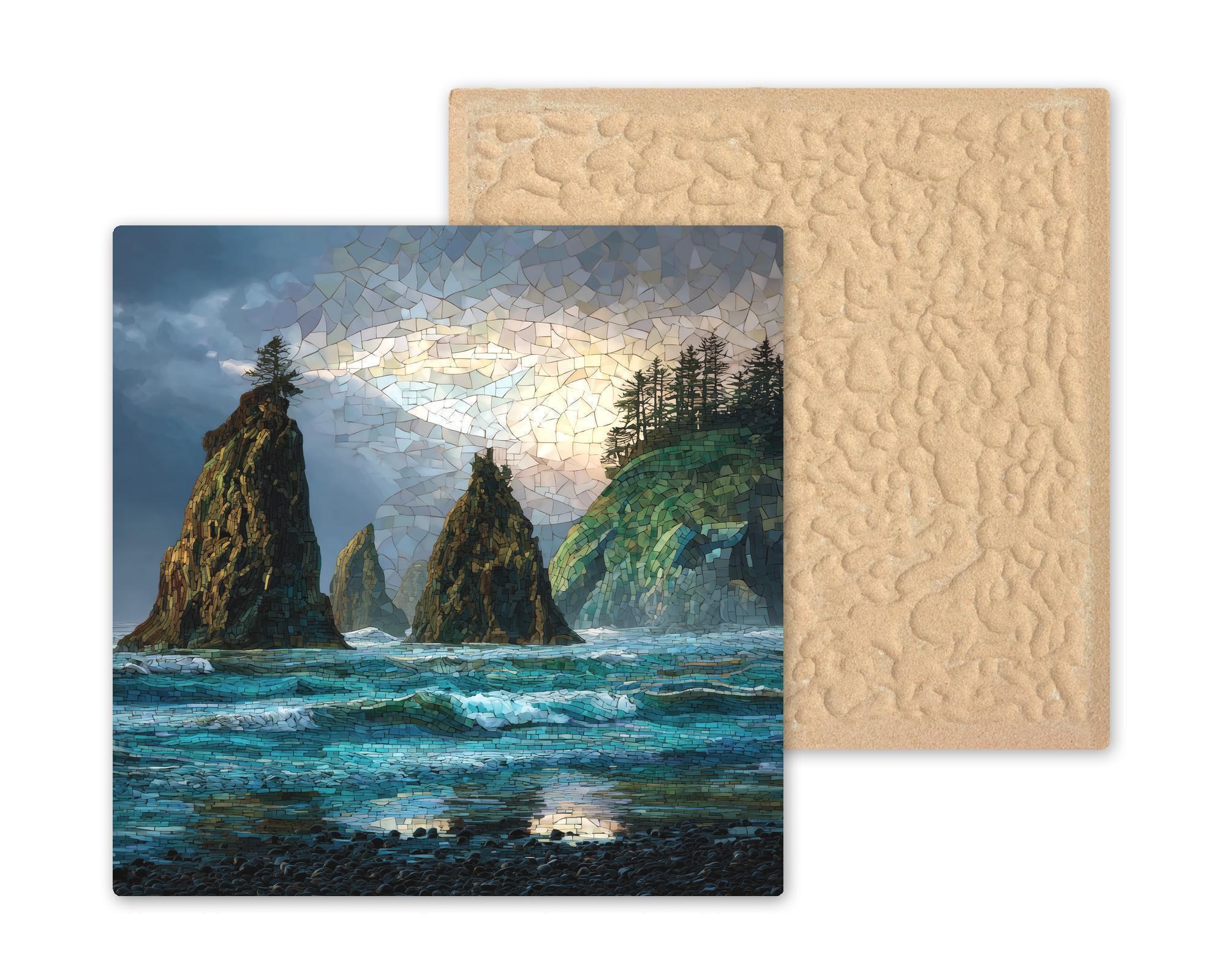 Ruby Beach is a place where land, sea, and sky meet in dramatic harmony. This ceramic tile wall art captures the moody coastal atmosphere that makes the Washington coast so unforgettable—the sound of waves, the mist in the air, and the timeless presence of the sea stacks standing against the tide.