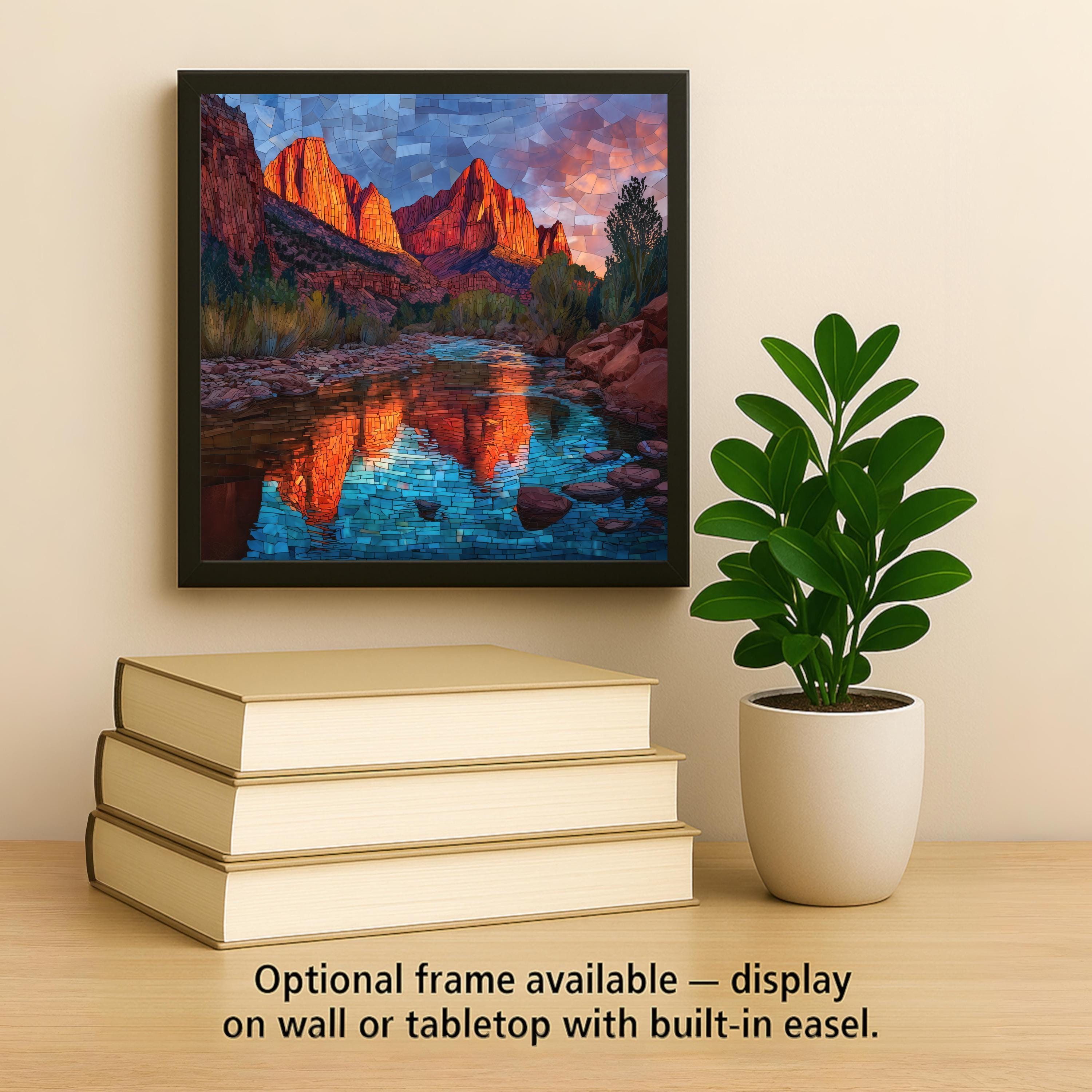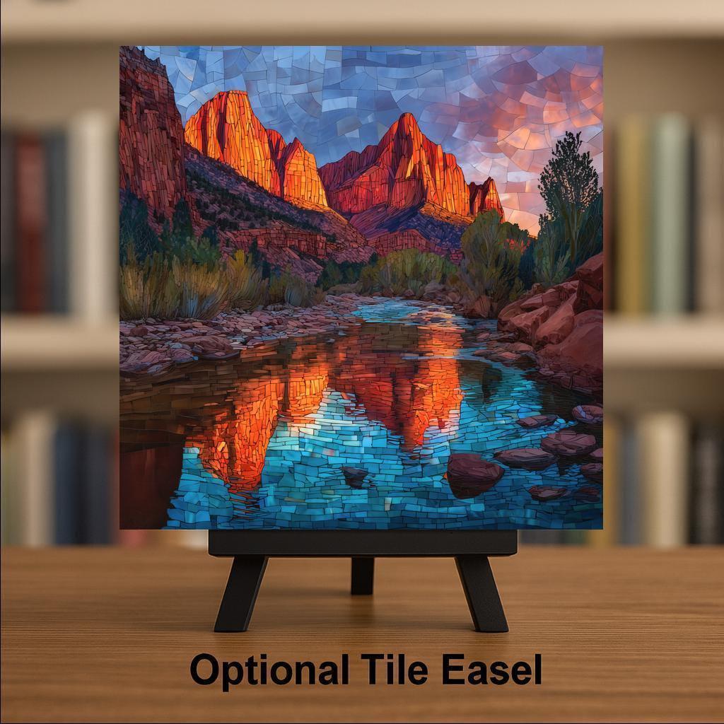 Zion National Park is celebrated for its towering red rock formations, winding rivers, and dramatic light — and this ceramic tile wall art captures that essence through a stained glass–inspired interpretation of the Watchman at sunset. The glowing canyon walls reflect into the Virgin River, creating a sense of depth, stillness, and natural rhythm that Zion is famous for.