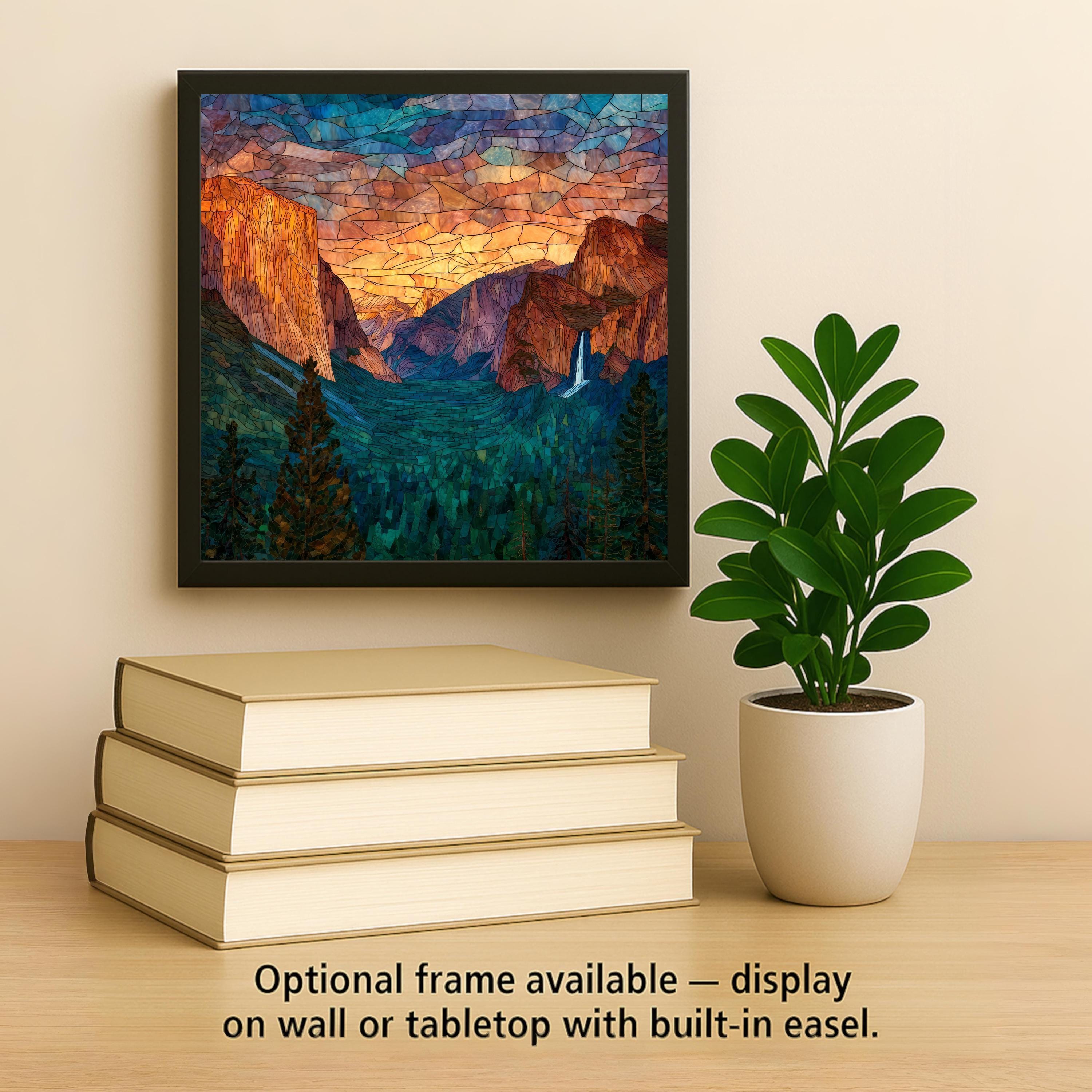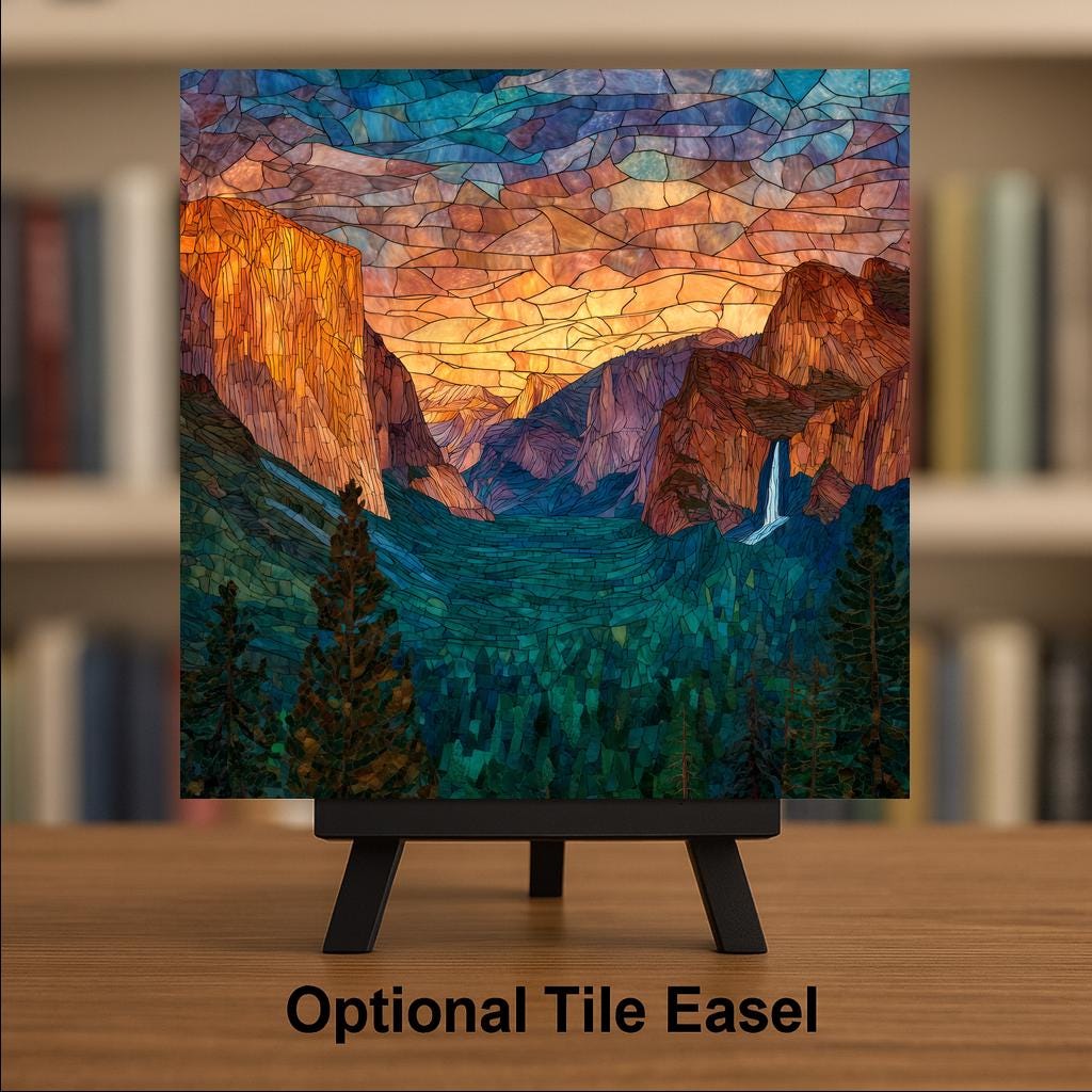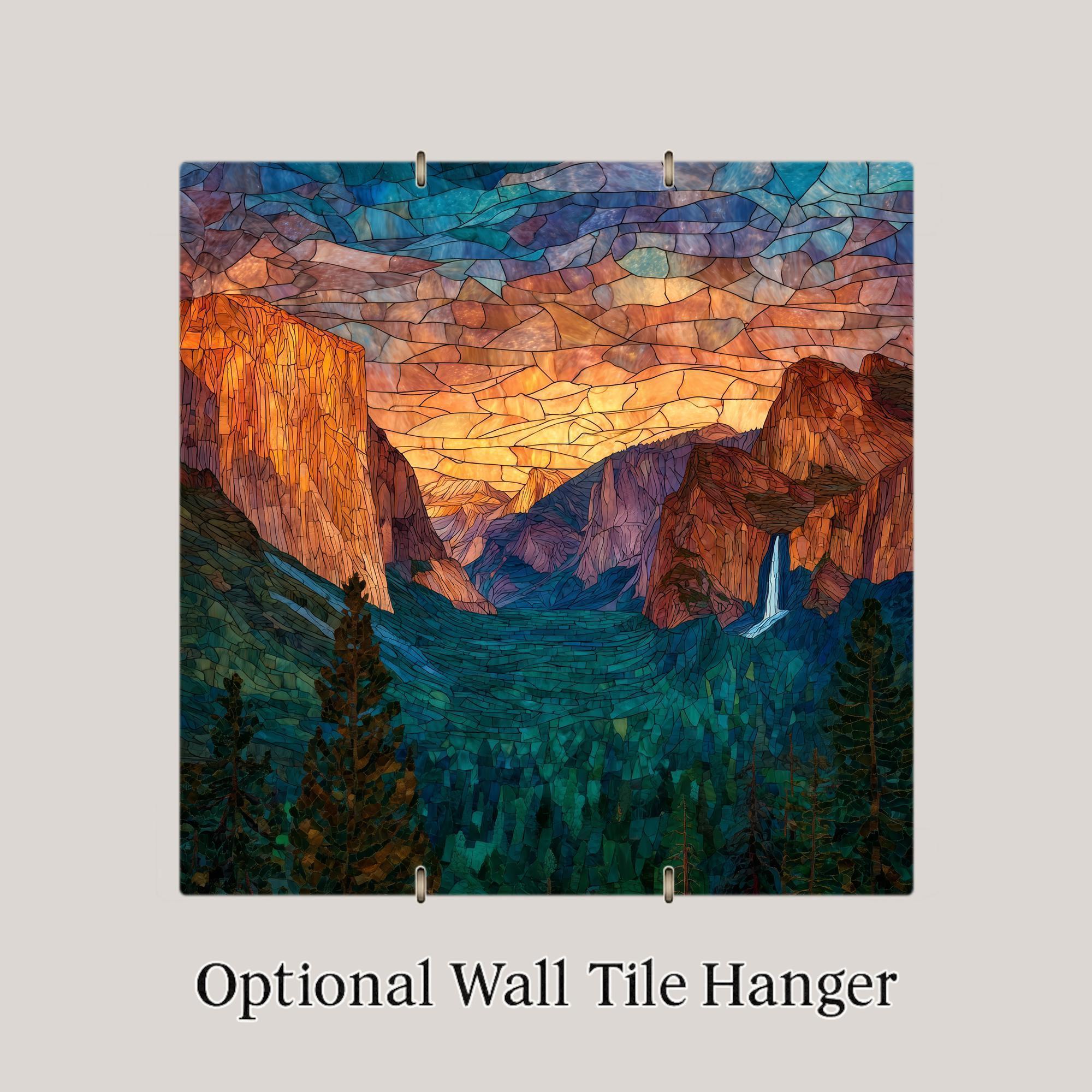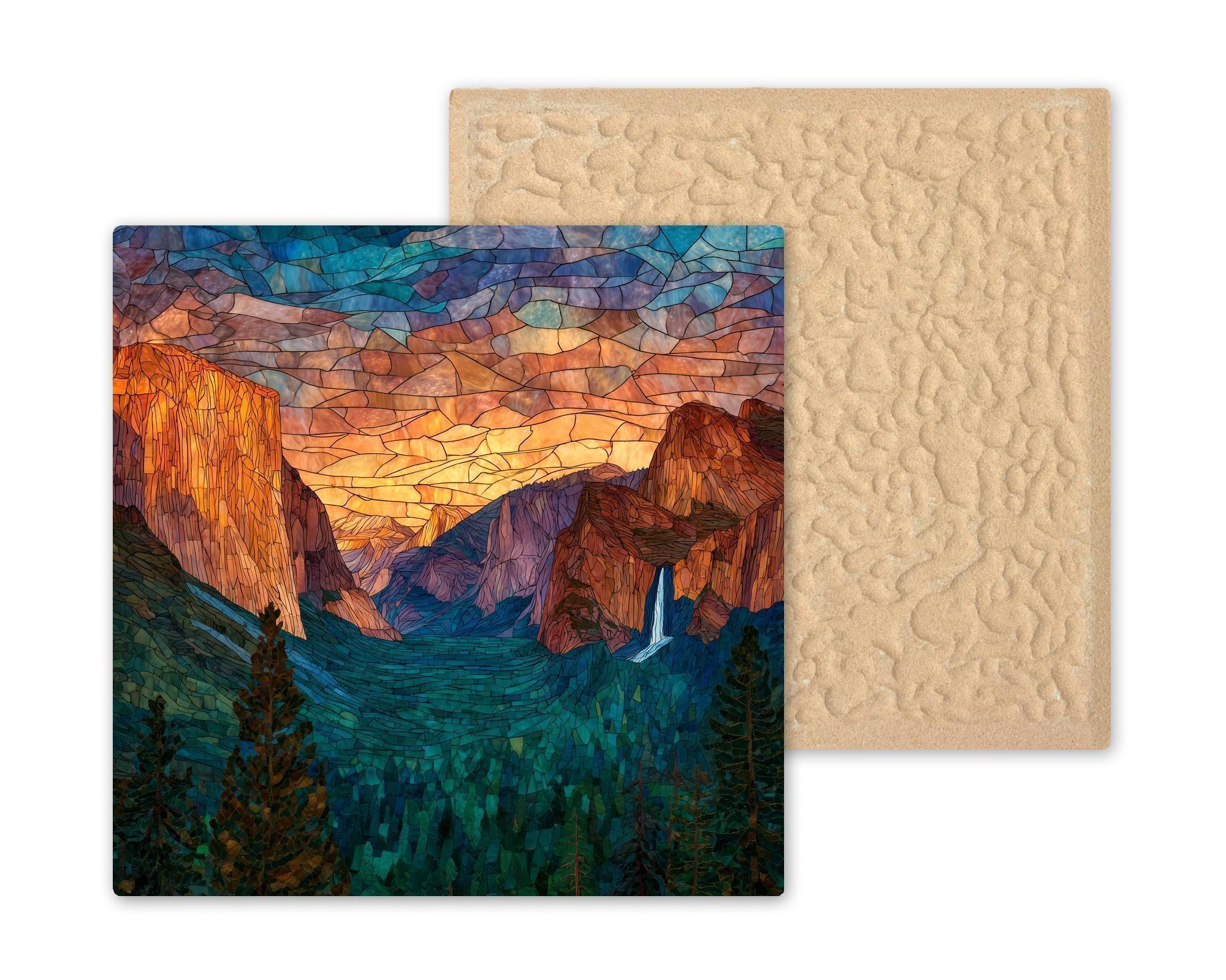 Yosemite Valley is one of the most photographed and beloved landscapes in the world, and this ceramic tile wall art celebrates its iconic form through a stained glass–inspired lens. The towering granite faces, deep forested valley, and distant waterfall are broken into luminous sections of color that echo the way light shifts across the valley at sunset.