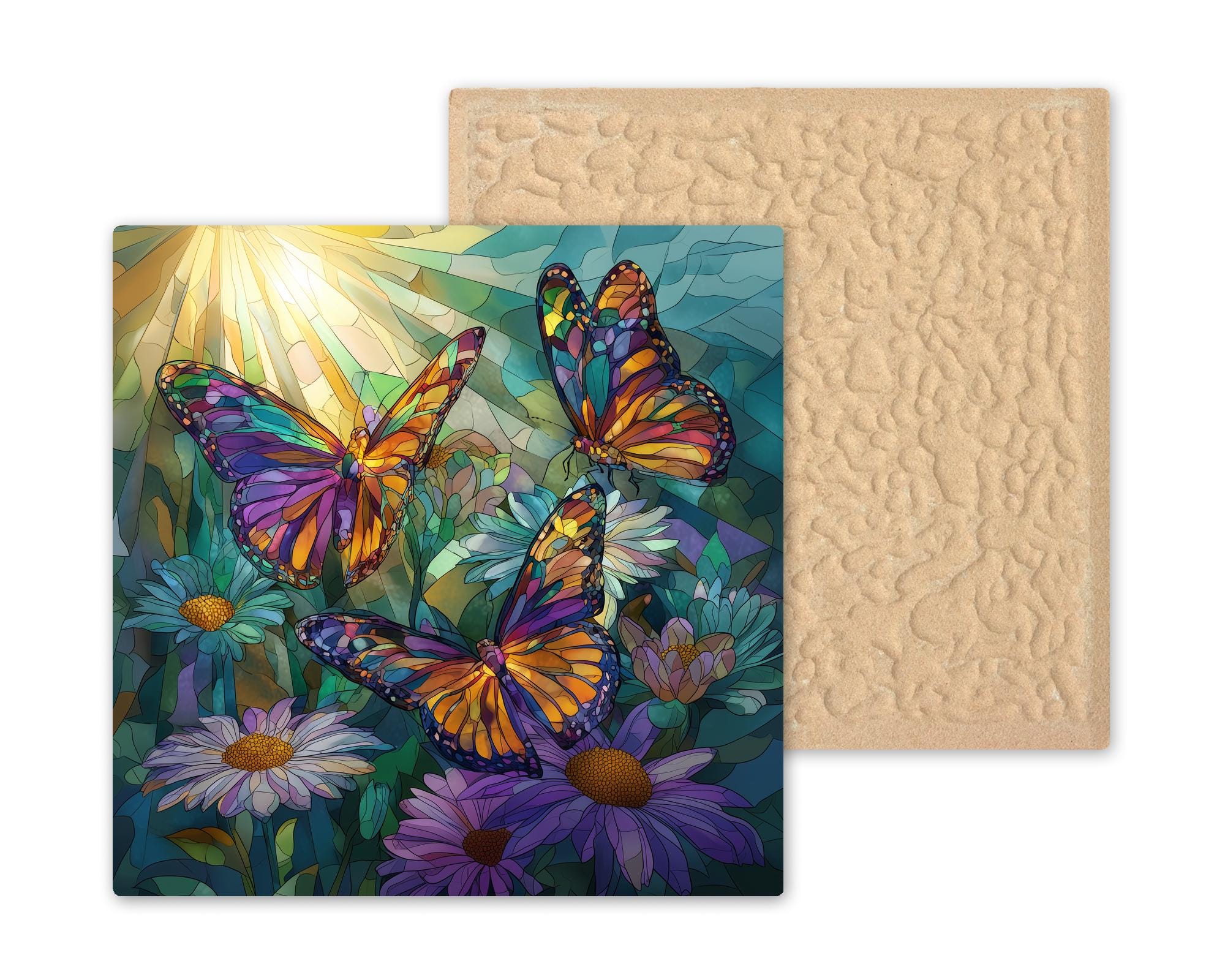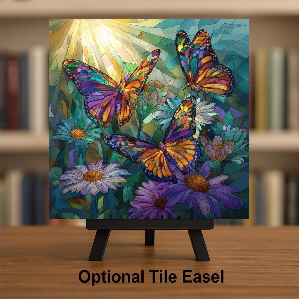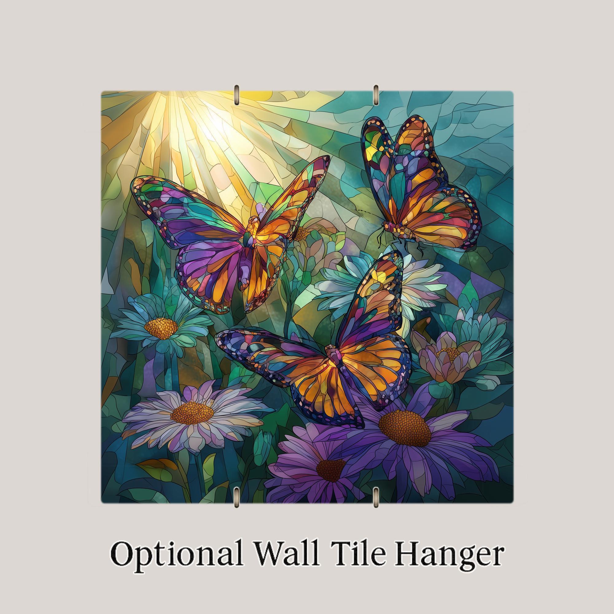 The monarch butterfly is a symbol of resilience, beauty, and change, and this ceramic tile wall art captures that meaning through a glowing stained glass–style interpretation. Multiple butterflies float gently above blooming flowers, their wings illuminated by warm light and jewel-toned color. The result is an artwork that feels peaceful, hopeful, and full of quiet motion.