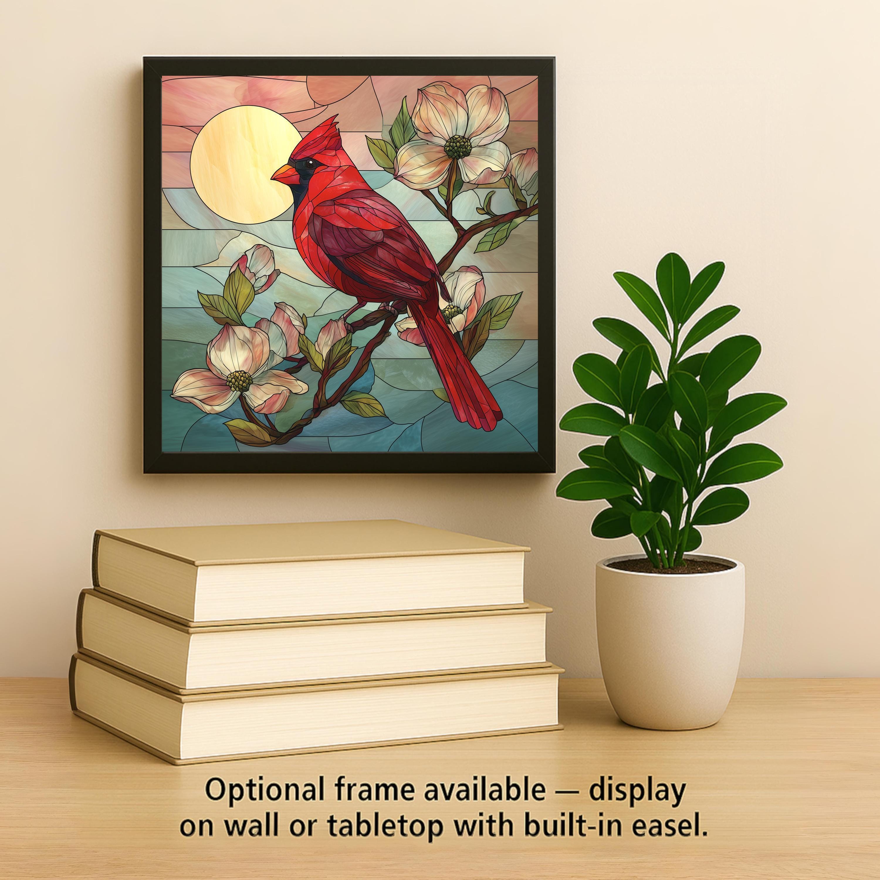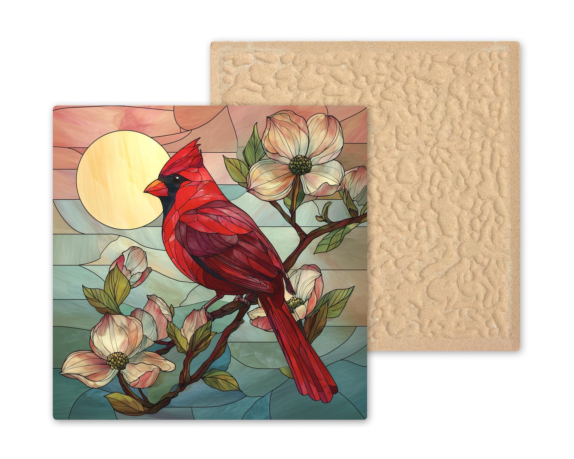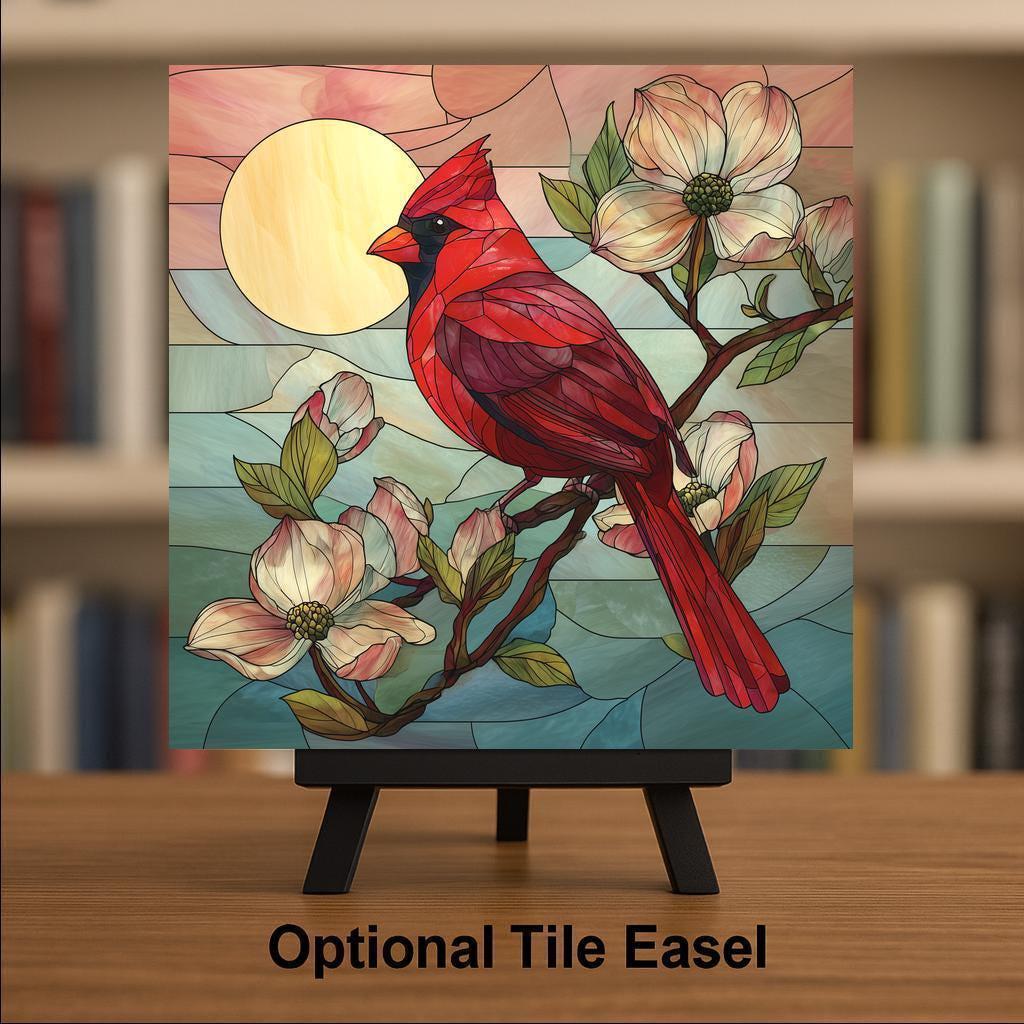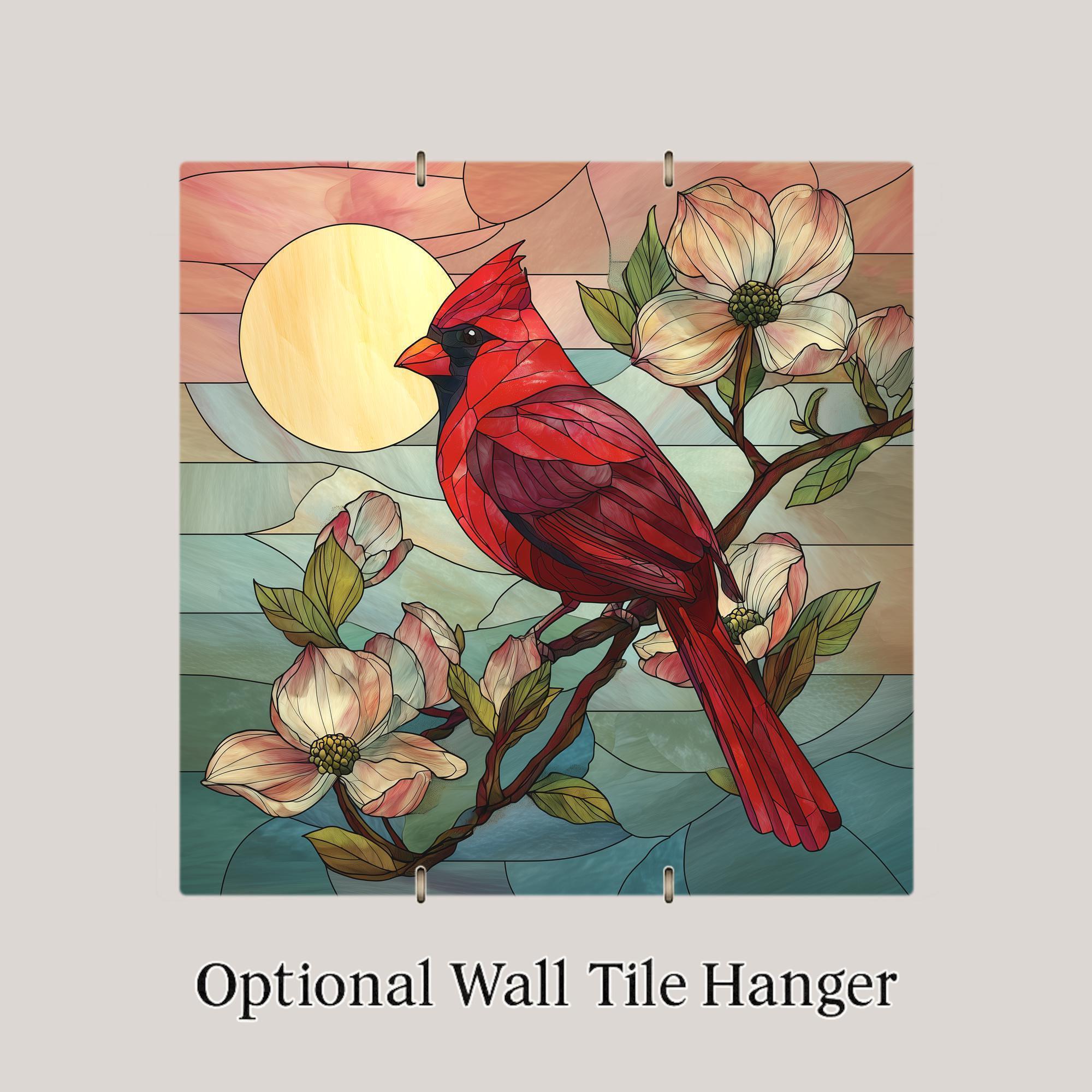 The cardinal has long been seen as a messenger of comfort and presence, and this ceramic tile wall art captures that symbolism through a glowing stained glass–style interpretation. The bold red bird stands confidently among soft dogwood blossoms, illuminated by gentle light that gives the artwork a peaceful, reassuring tone.