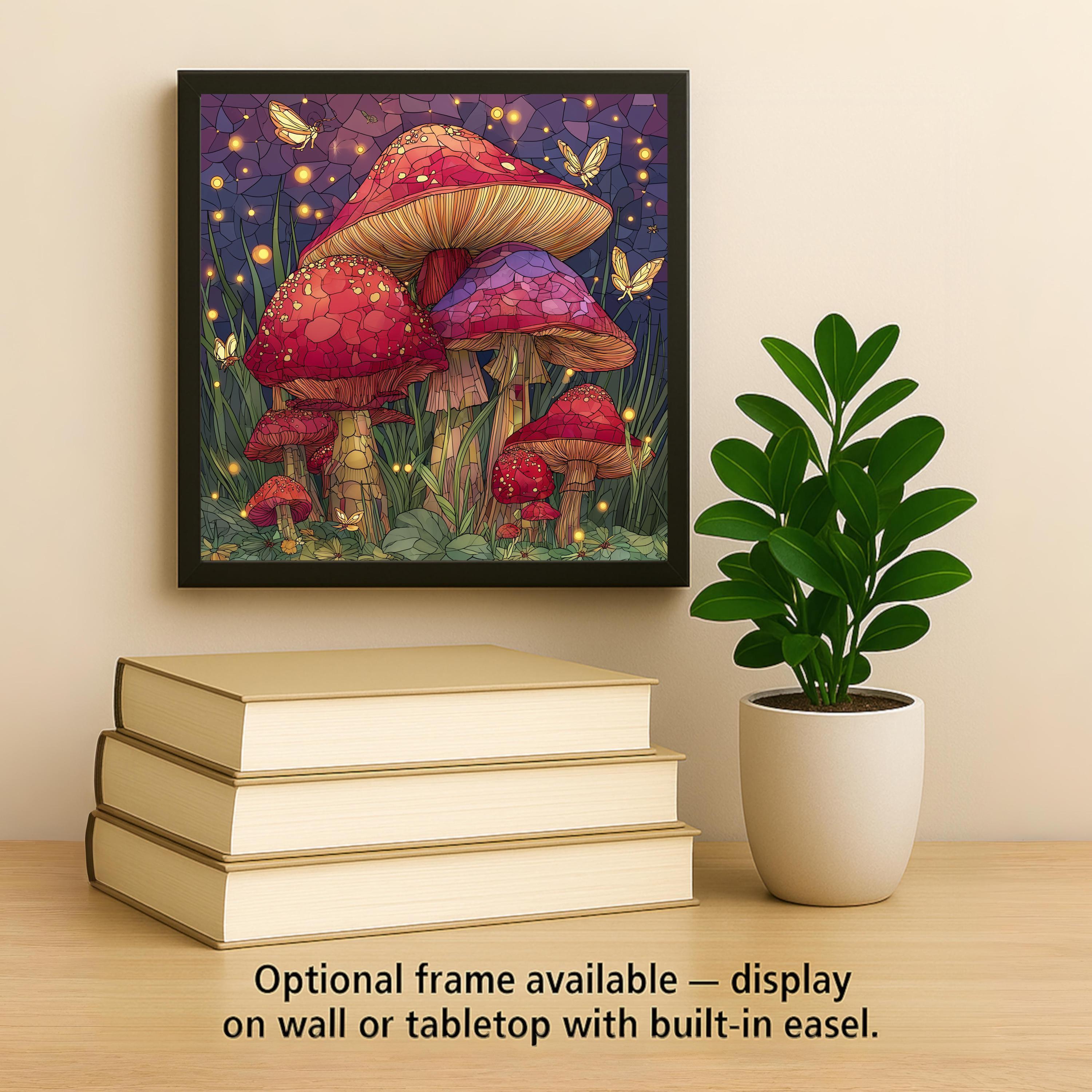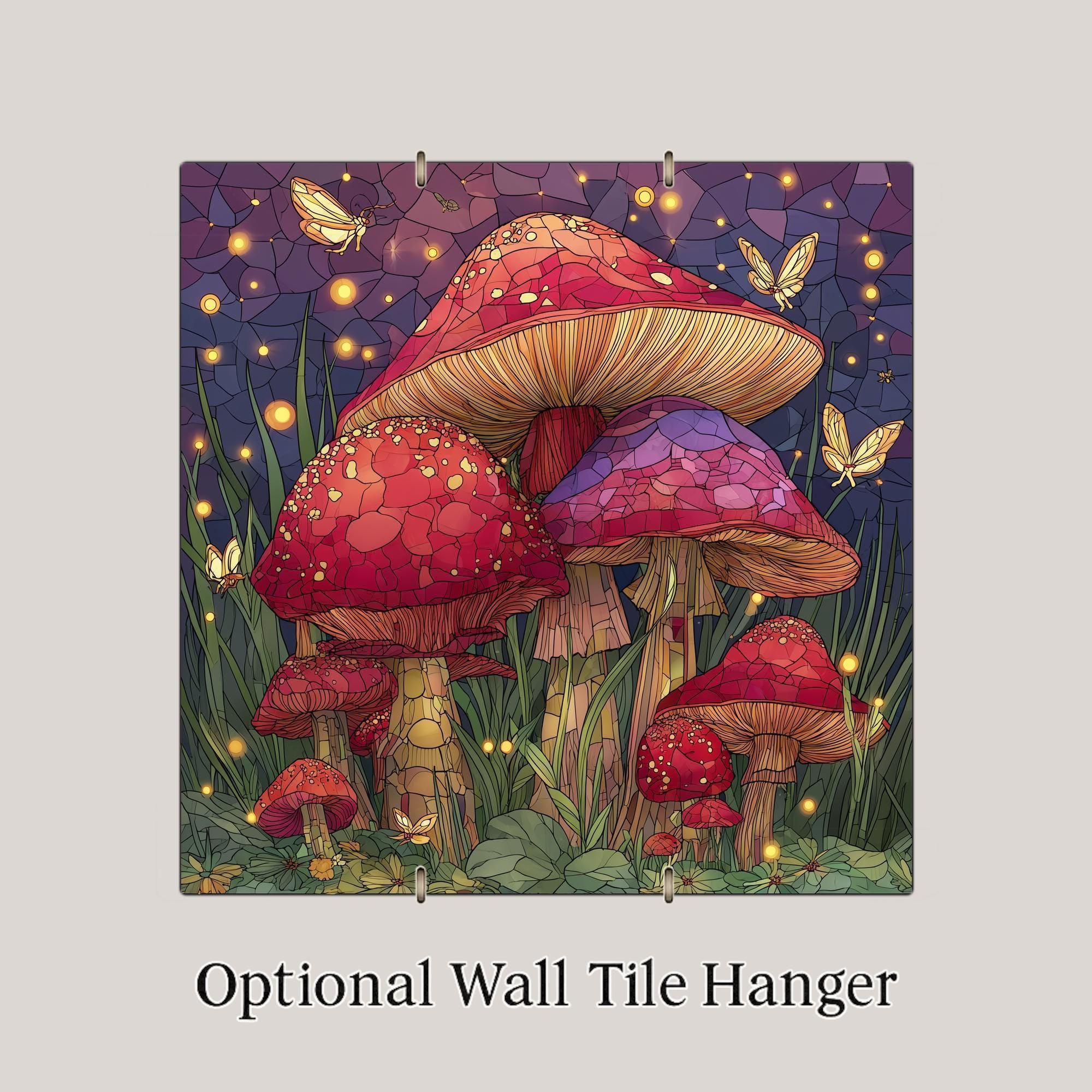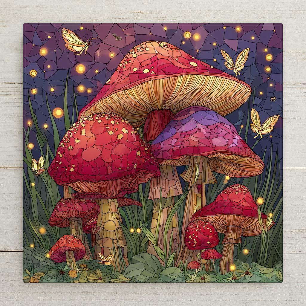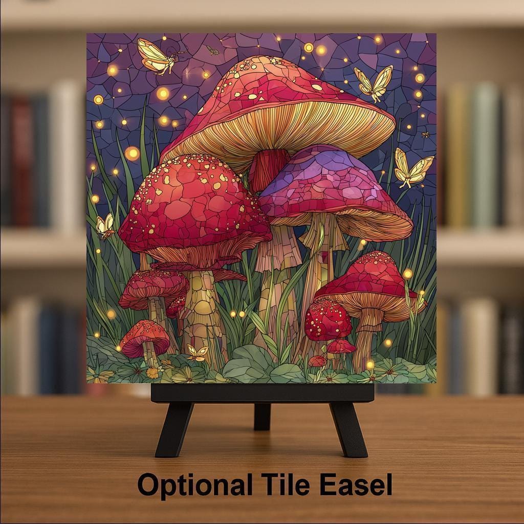 Mushrooms often symbolize growth, renewal, and the quiet magic of nature, and this stained-glass-inspired ceramic tile captures that symbolism in a joyful, uplifting way. The glowing lights and playful details create a calming atmosphere while still offering rich visual interest, making this artwork both soothing and inspiring.