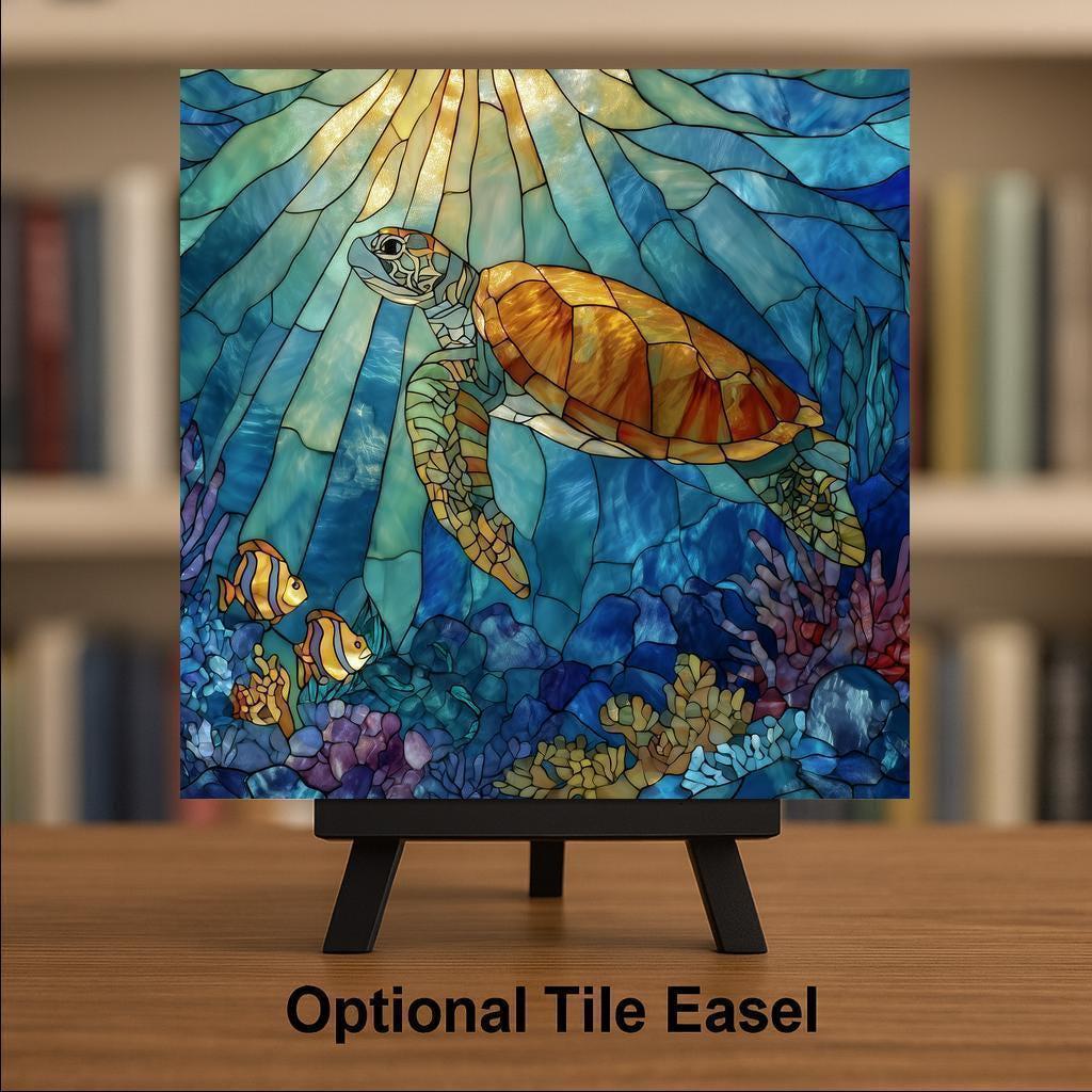 Sea turtles are widely associated with wisdom, protection, endurance, and peaceful strength, and this stained-glass-inspired ceramic tile reflects those qualities through gentle motion and radiant light. The layered blues and soft highlights create a soothing atmosphere that helps bring a sense of calm and grounding to any space.