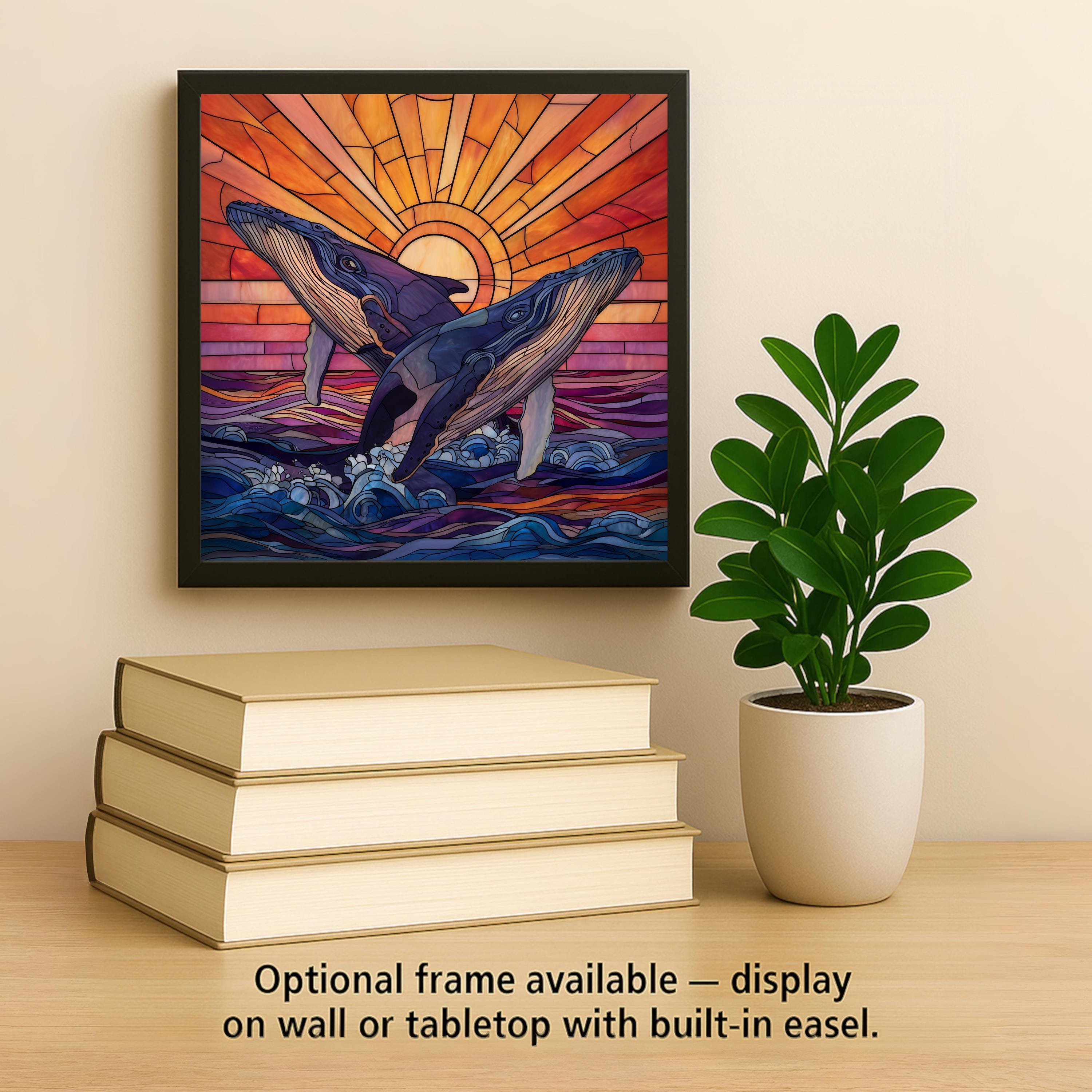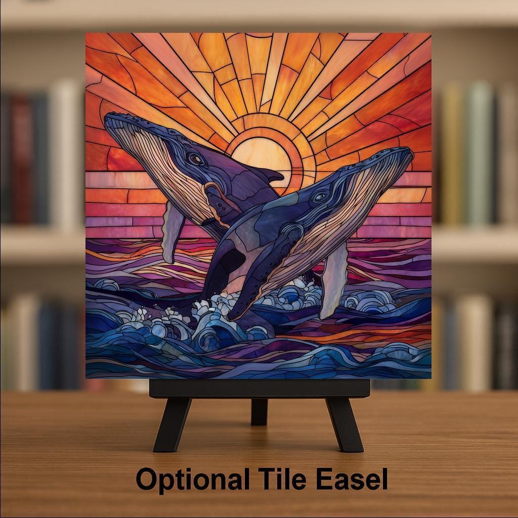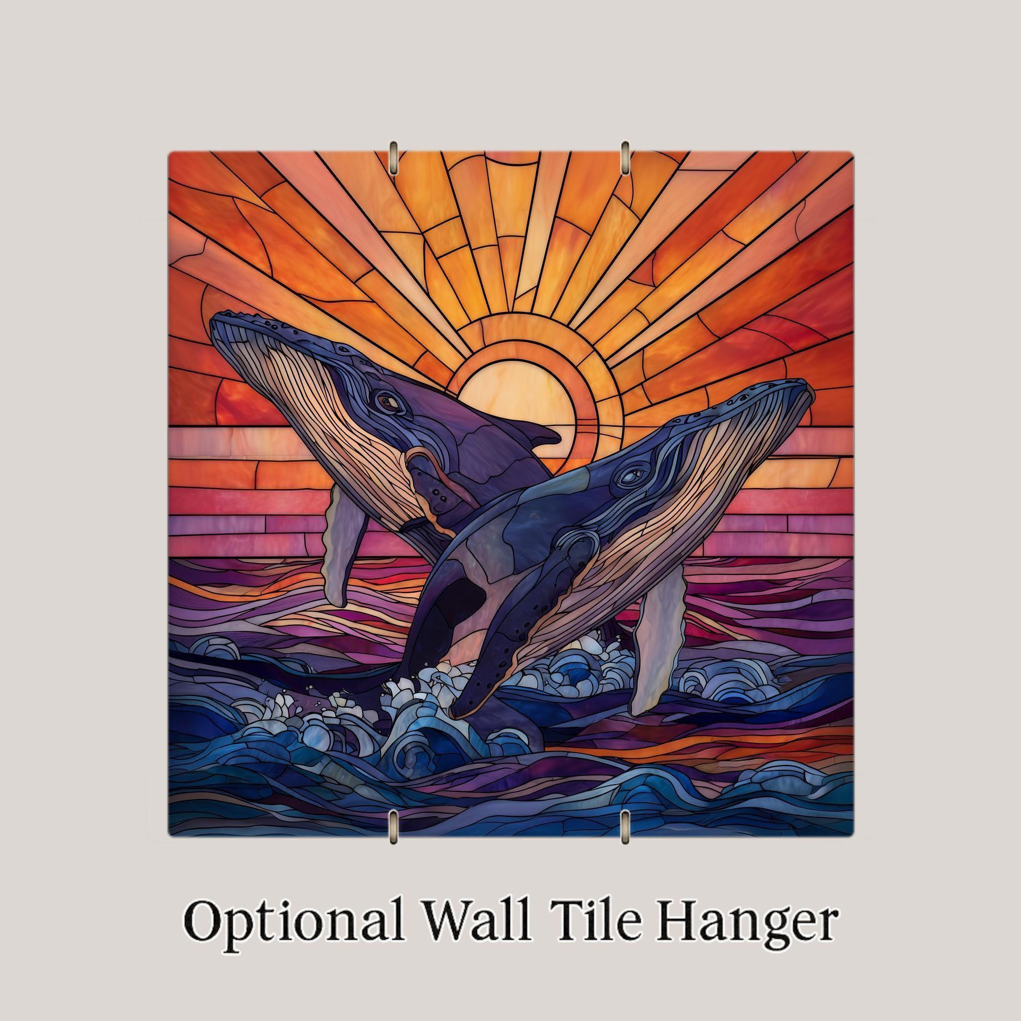 Whales are often associated with wisdom, emotional depth, communication, and connection, and this stained-glass-inspired ceramic tile reflects those themes through movement and light. The paired whales symbolize companionship and balance, while the glowing sunset evokes renewal and hope.