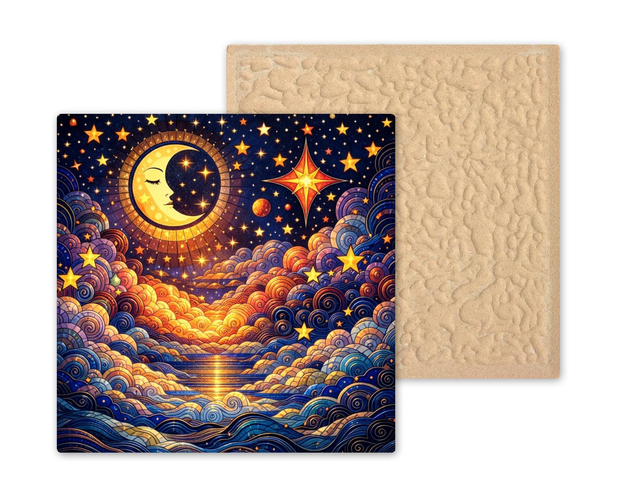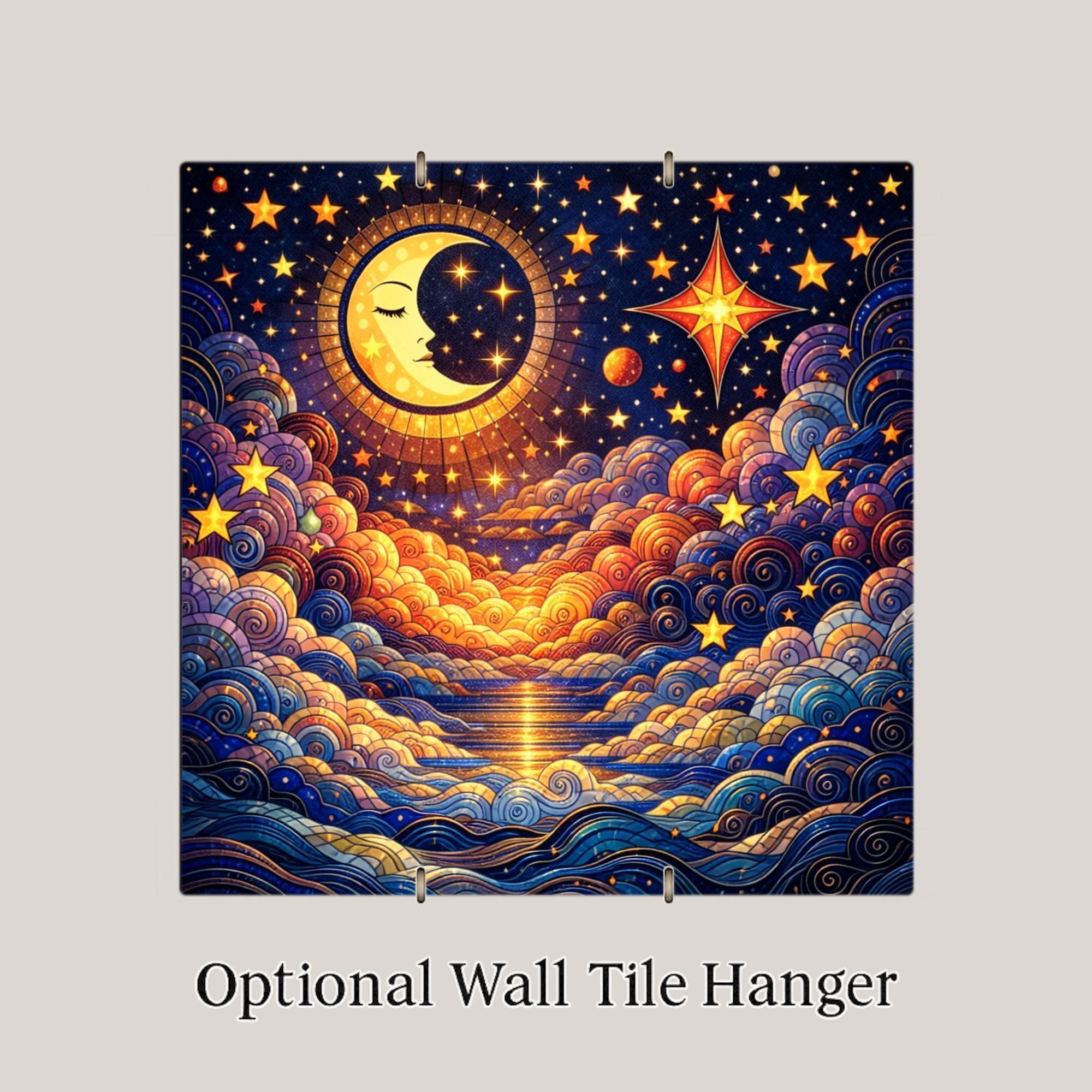 Celestial imagery has long been used to bring peace, reflection, and beauty into the home, and this moon-themed ceramic tile wall art does exactly that. With its flowing cloud patterns, radiant stars, and warm golden highlights, this piece creates a tranquil focal point that feels calming without being overpowering.