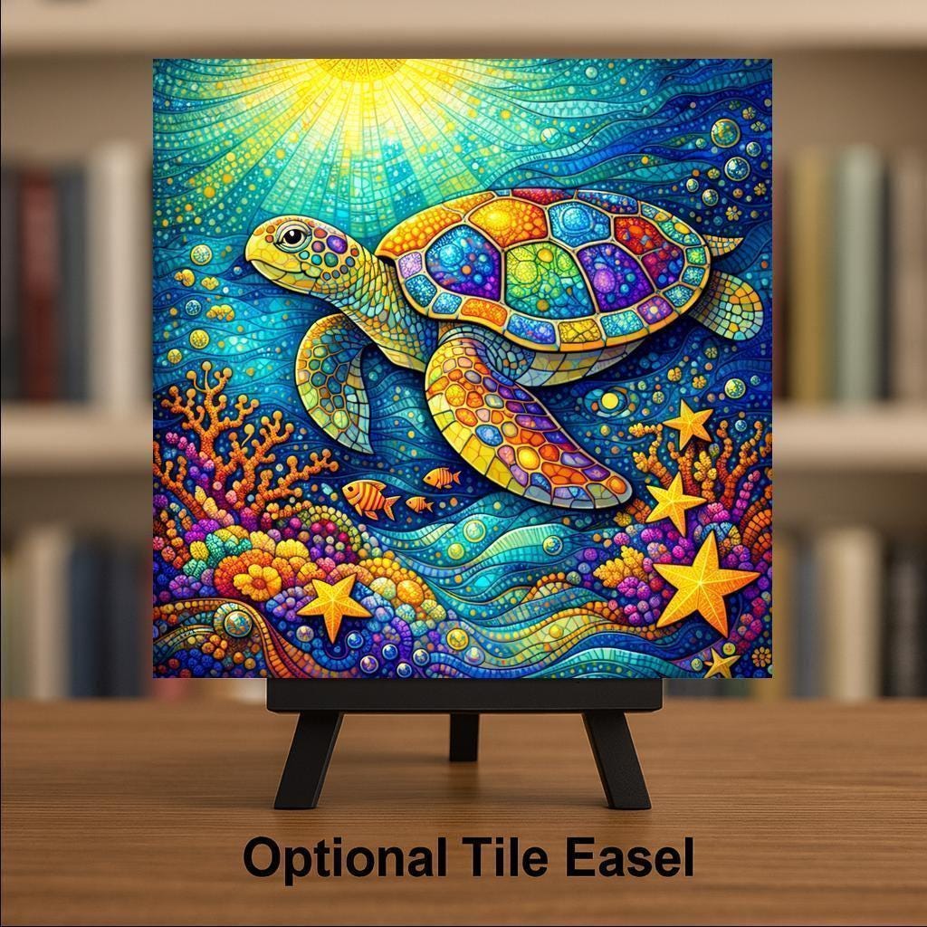 This sea turtle ceramic tile wall art is designed for those who love the ocean, coastal living, and meaningful home decor. The artwork blends flowing water patterns with bold, luminous colors inspired by stained glass, creating a tranquil yet eye-catching design. The turtle moves effortlessly through layered blues and golds, symbolizing calm strength and steady forward motion.