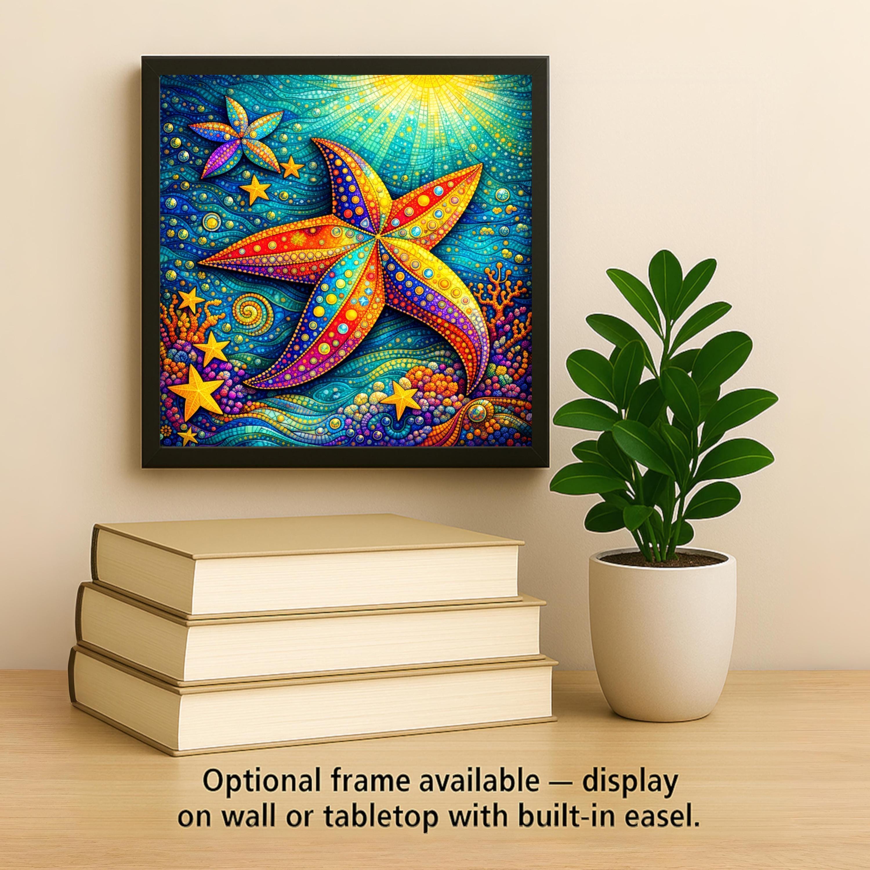 This Starfish Ceramic Tile Wall Art captures the essence of ocean life through a glowing stained-glass aesthetic that feels both calming and energizing. The swirling water patterns and radiant highlights create a sense of movement, while the starfish remains a strong, central symbol of balance and connection to nature. It’s a perfect choice for anyone drawn to the sea, coastal decor, or symbolic wall art with meaning.
