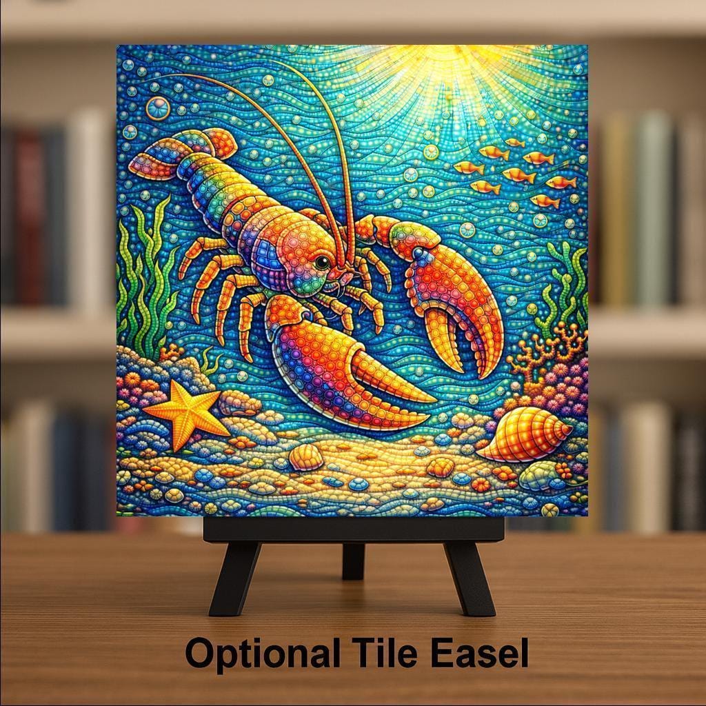 This whimsical lobster ceramic tile wall art is designed to make people smile. The playful expression, bold colors, and flowing underwater details create a sense of movement and light while maintaining a polished, decorative look. Inspired by stained glass art, the design captures depth and texture in a way that feels artistic yet approachable.