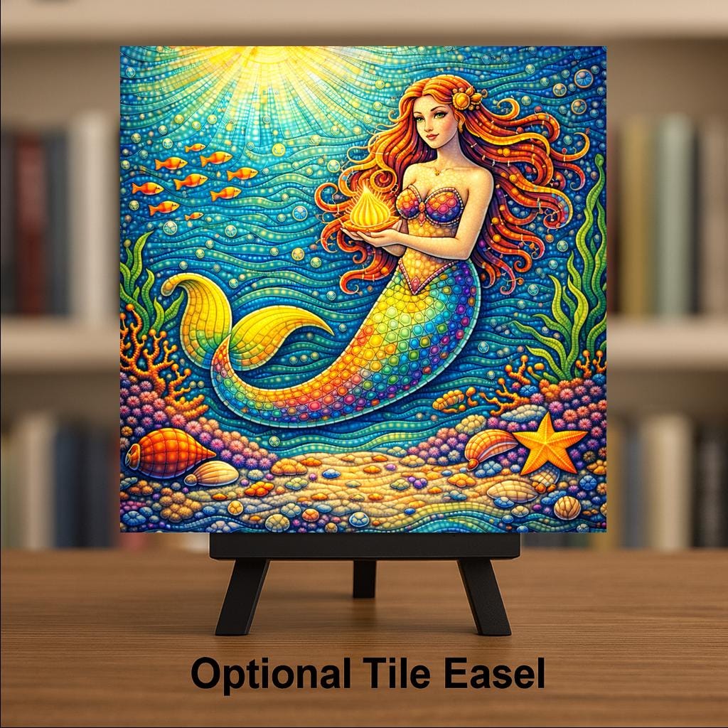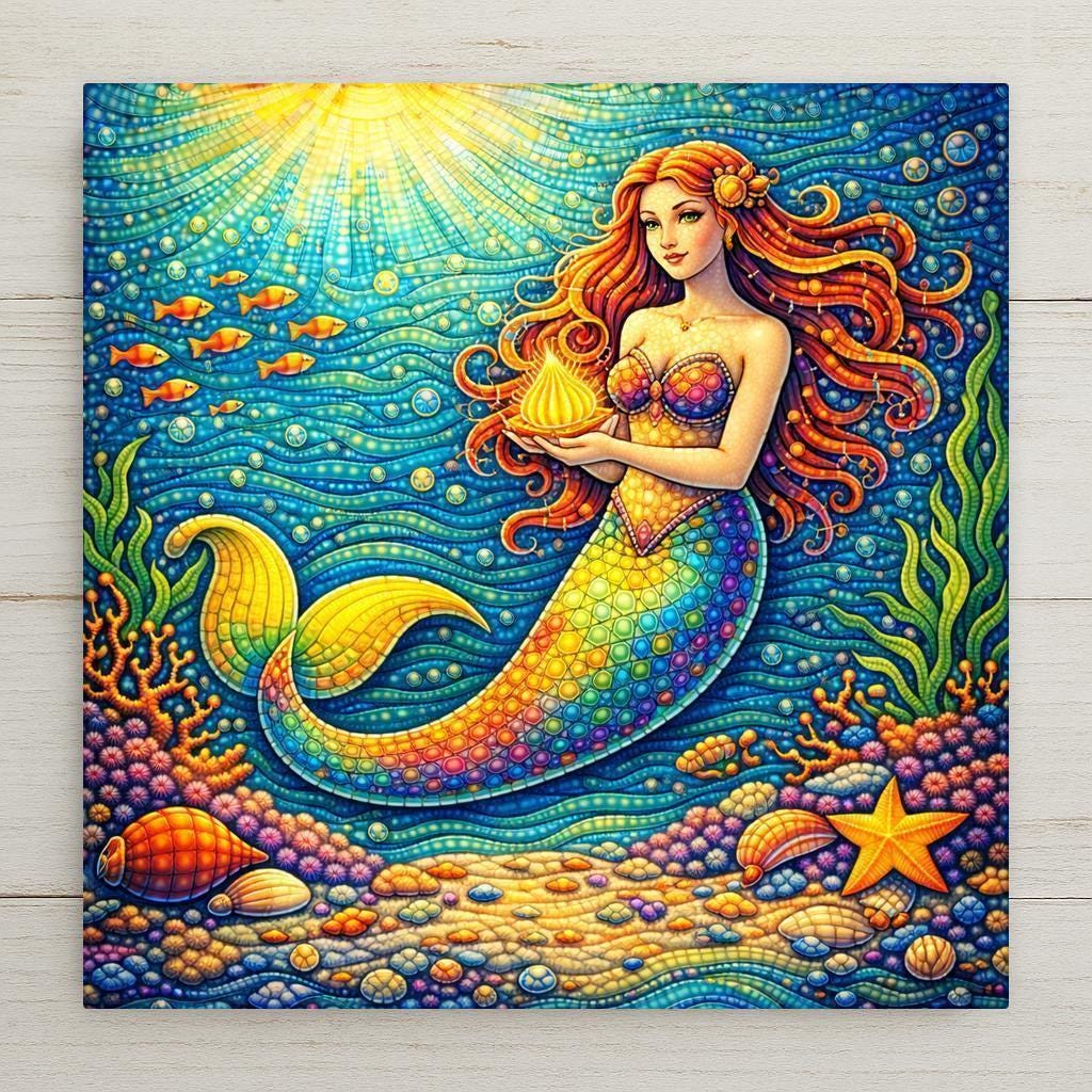 This whimsical mermaid tile wall art blends fantasy and coastal charm in a way that feels both playful and refined. Inspired by ocean folklore and illustrated with flowing movement, it adds personality without overwhelming a space. The balance of soft blues, warm golden light, and jewel-tone accents makes it especially appealing for beach house decor and coastal home decor where color and calm coexist.