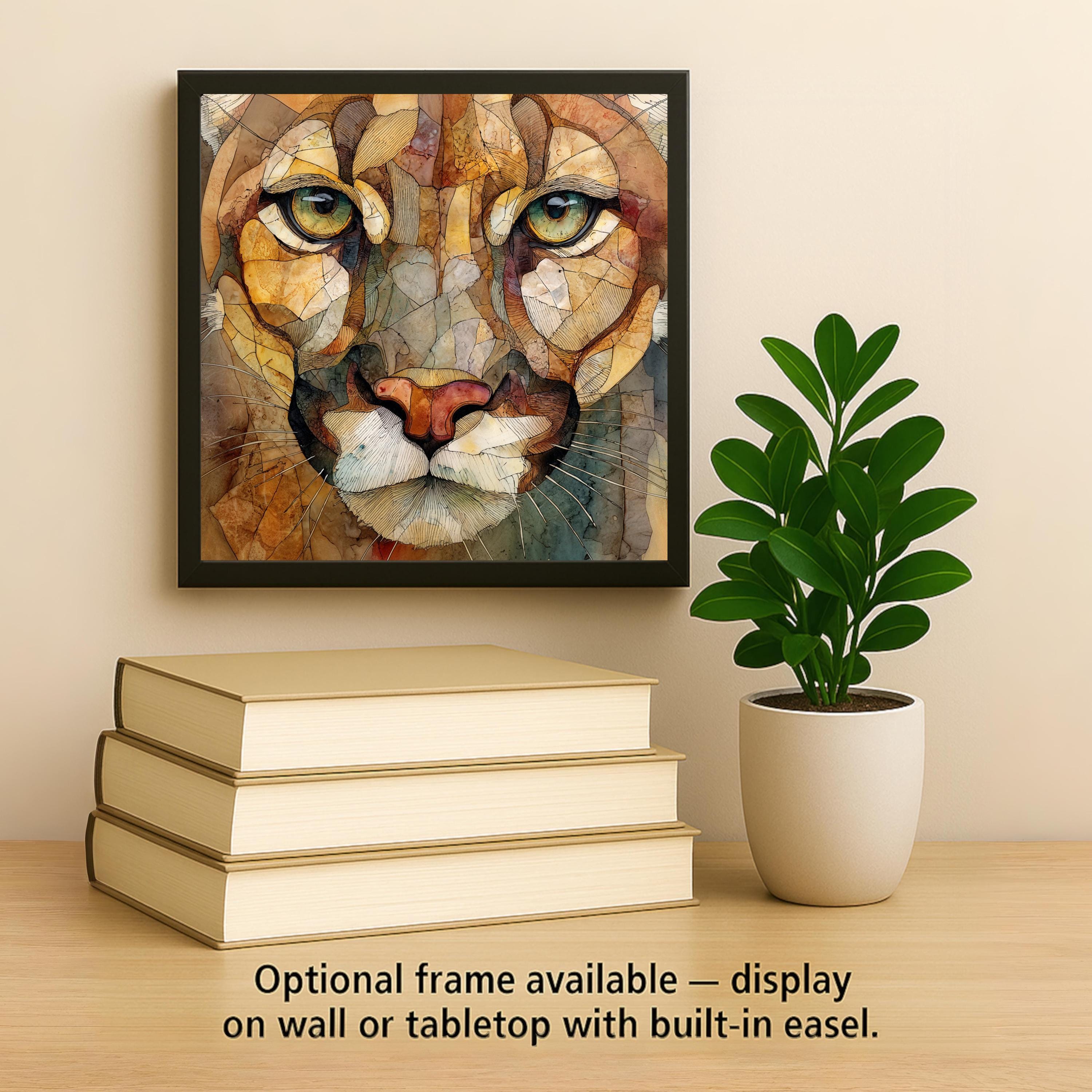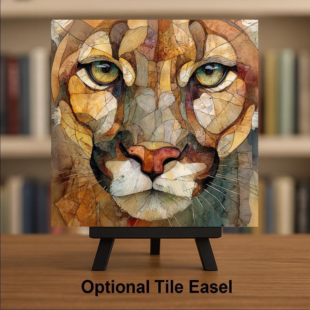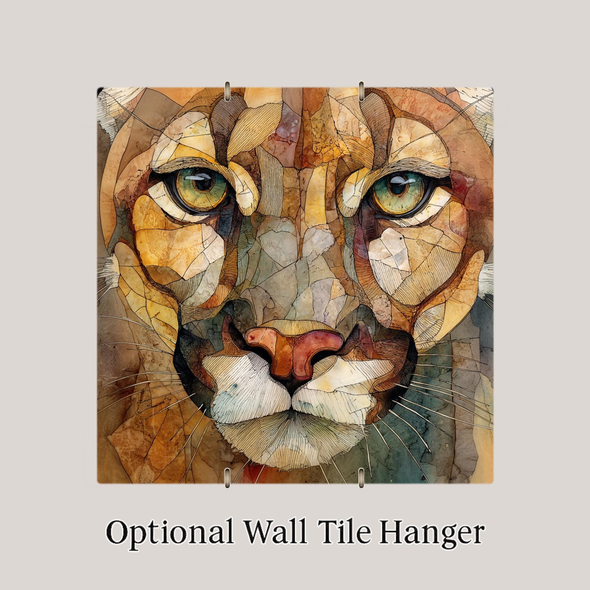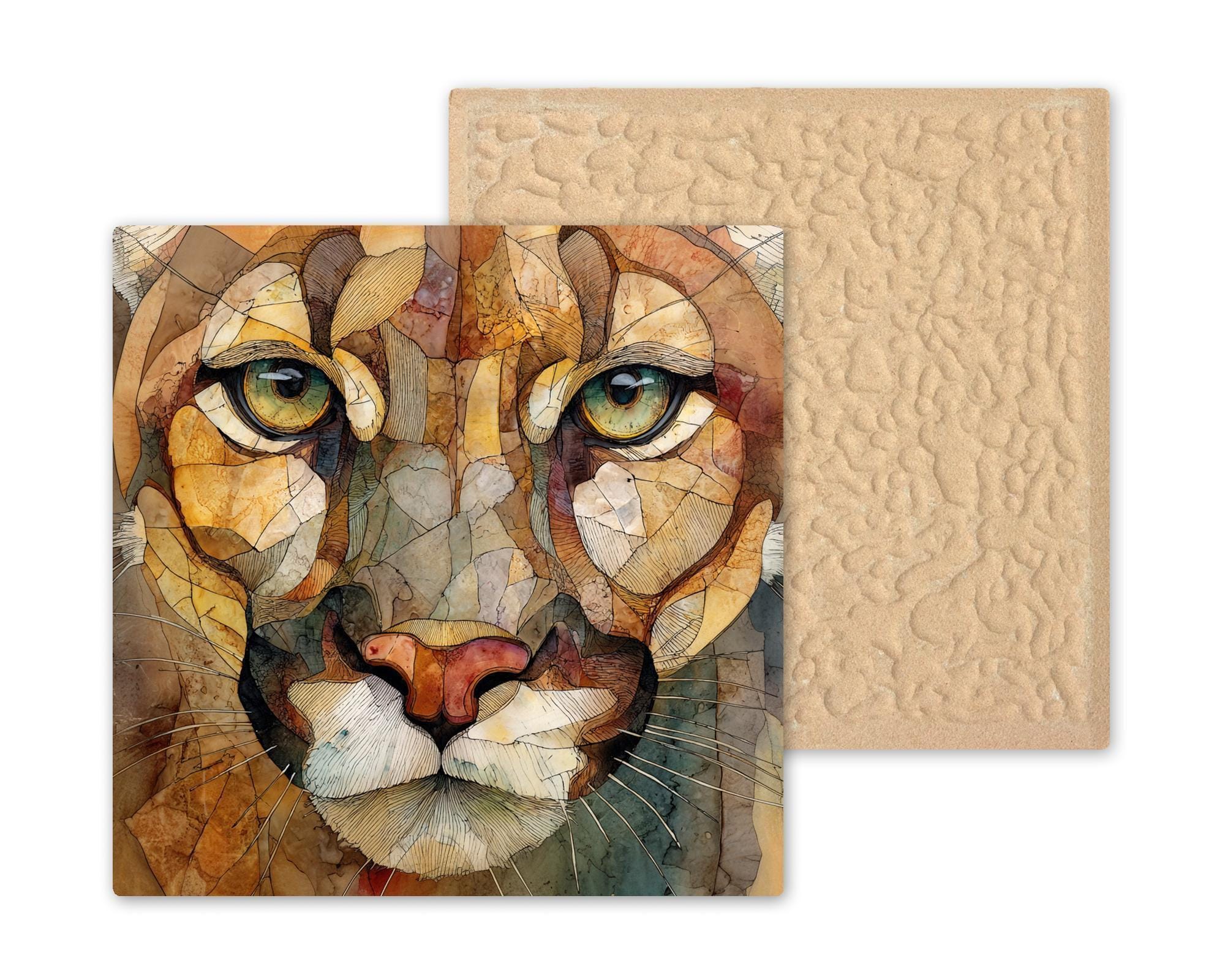 Inspired by the quiet power of the wilderness, this cougar ceramic tile wall art celebrates the mountain lion as a symbol of strength, awareness, and resilience. The artwork features a close-up portrait that highlights expressive eyes, layered textures, and natural tones, creating depth and emotional impact. The stained glass–style design adds a luminous, handcrafted feel while remaining a permanent print on ceramic tile.
