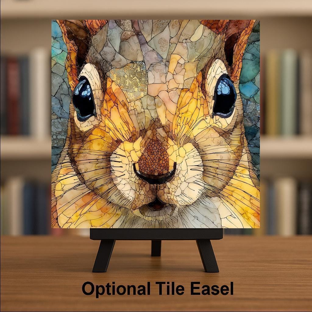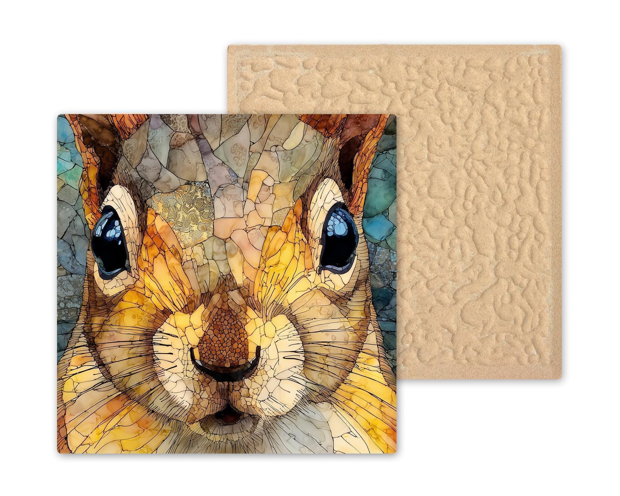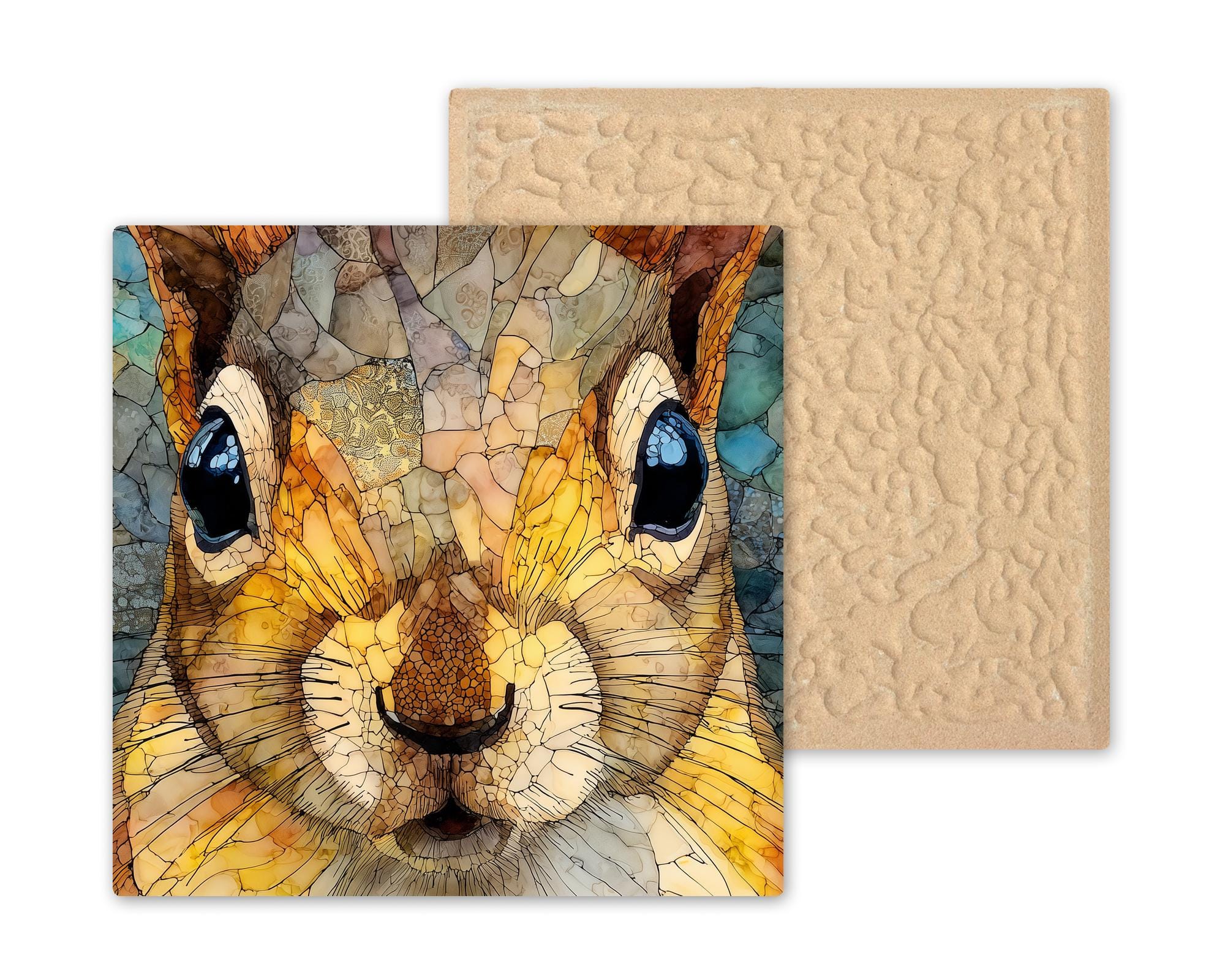This wildlife ceramic tile captures the quiet intelligence and playful spirit of a squirrel through a stained glass aesthetic that feels timeless yet modern. The mosaic-style linework enhances the fur texture and facial features, while the soft earth-tone palette blends easily with rustic, cottage, farmhouse, and nature-themed home decor styles.