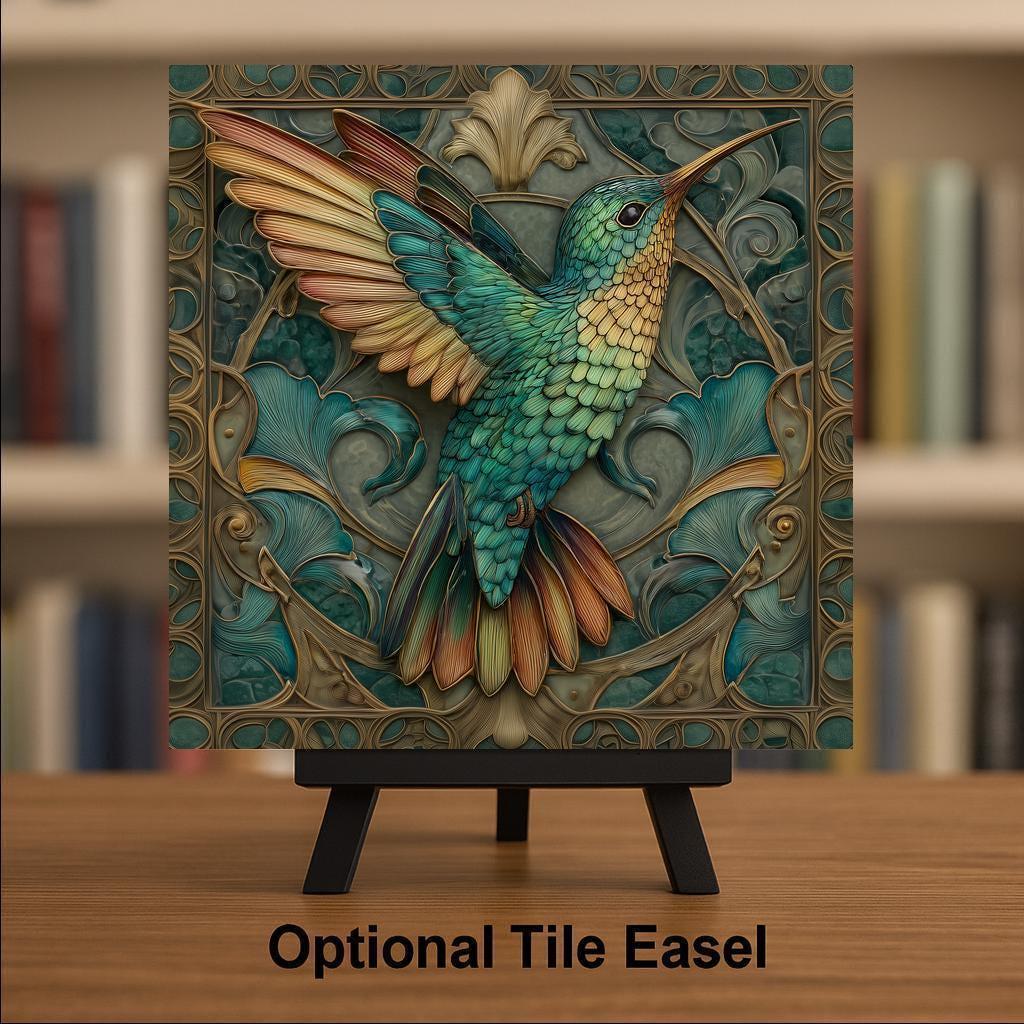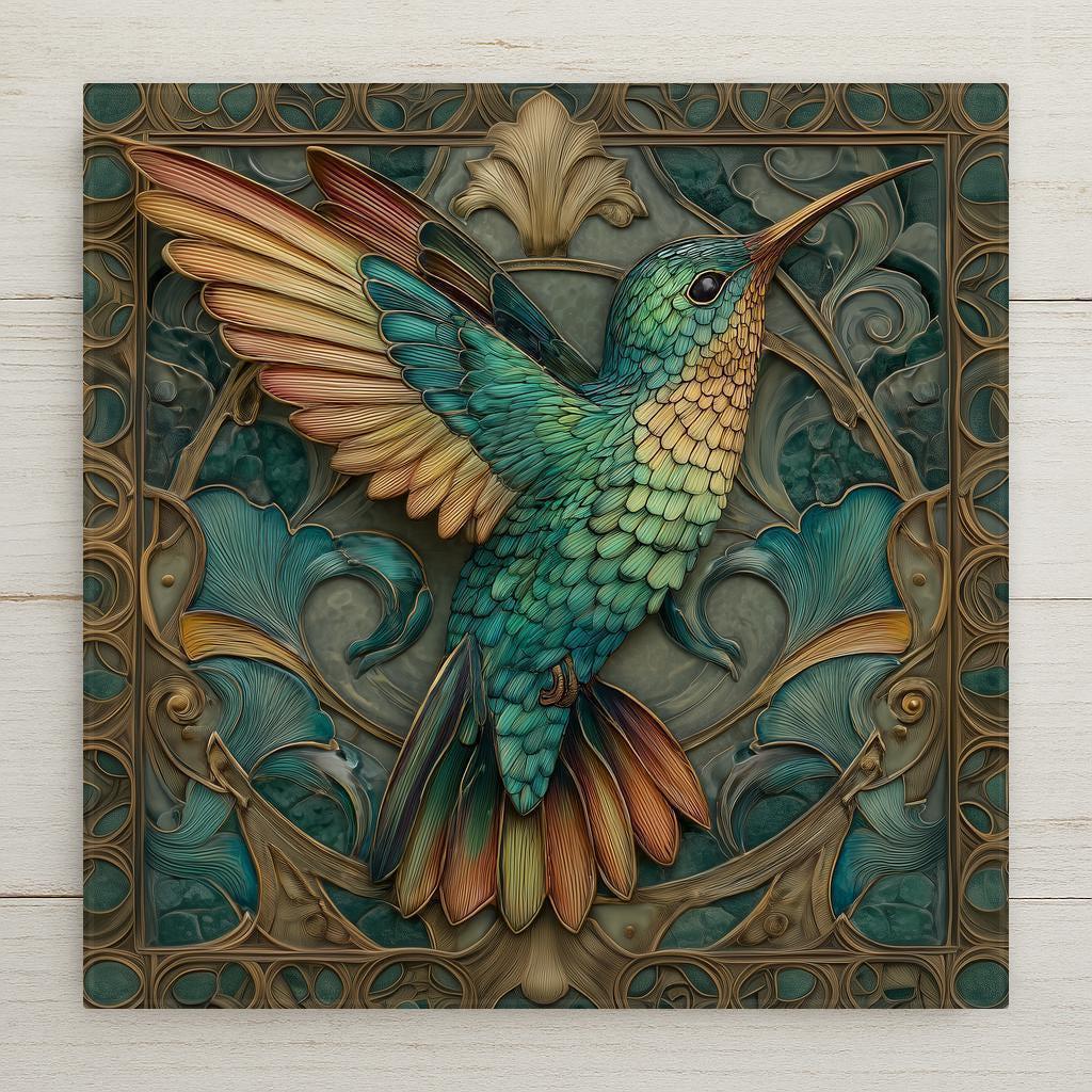 This Art Nouveau hummingbird tile blends decorative elegance with natural symbolism. The symmetrical composition, curved floral motifs, and layered feather details are inspired by vintage botanical illustration while maintaining a refined, modern feel. The teal and gold color palette adds warmth and sophistication, making this piece easy to style in a wide range of interiors.