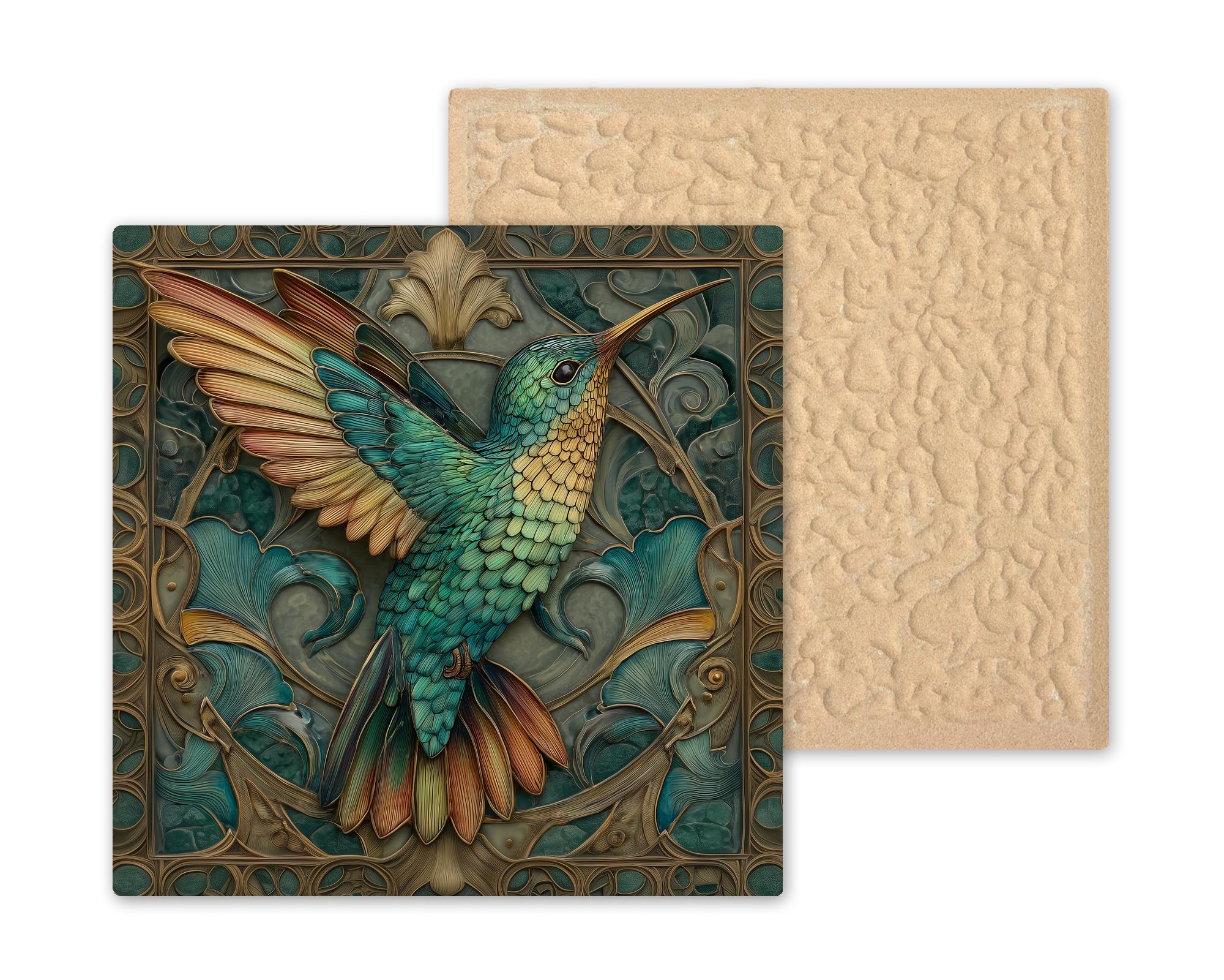 This Art Nouveau hummingbird tile blends decorative elegance with natural symbolism. The symmetrical composition, curved floral motifs, and layered feather details are inspired by vintage botanical illustration while maintaining a refined, modern feel. The teal and gold color palette adds warmth and sophistication, making this piece easy to style in a wide range of interiors.