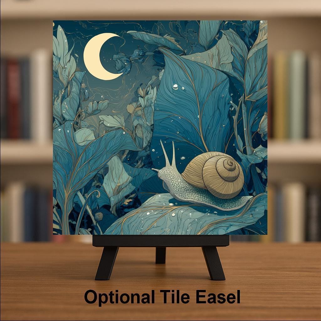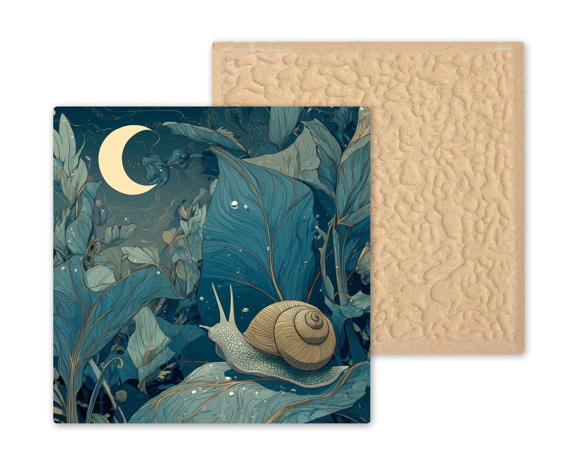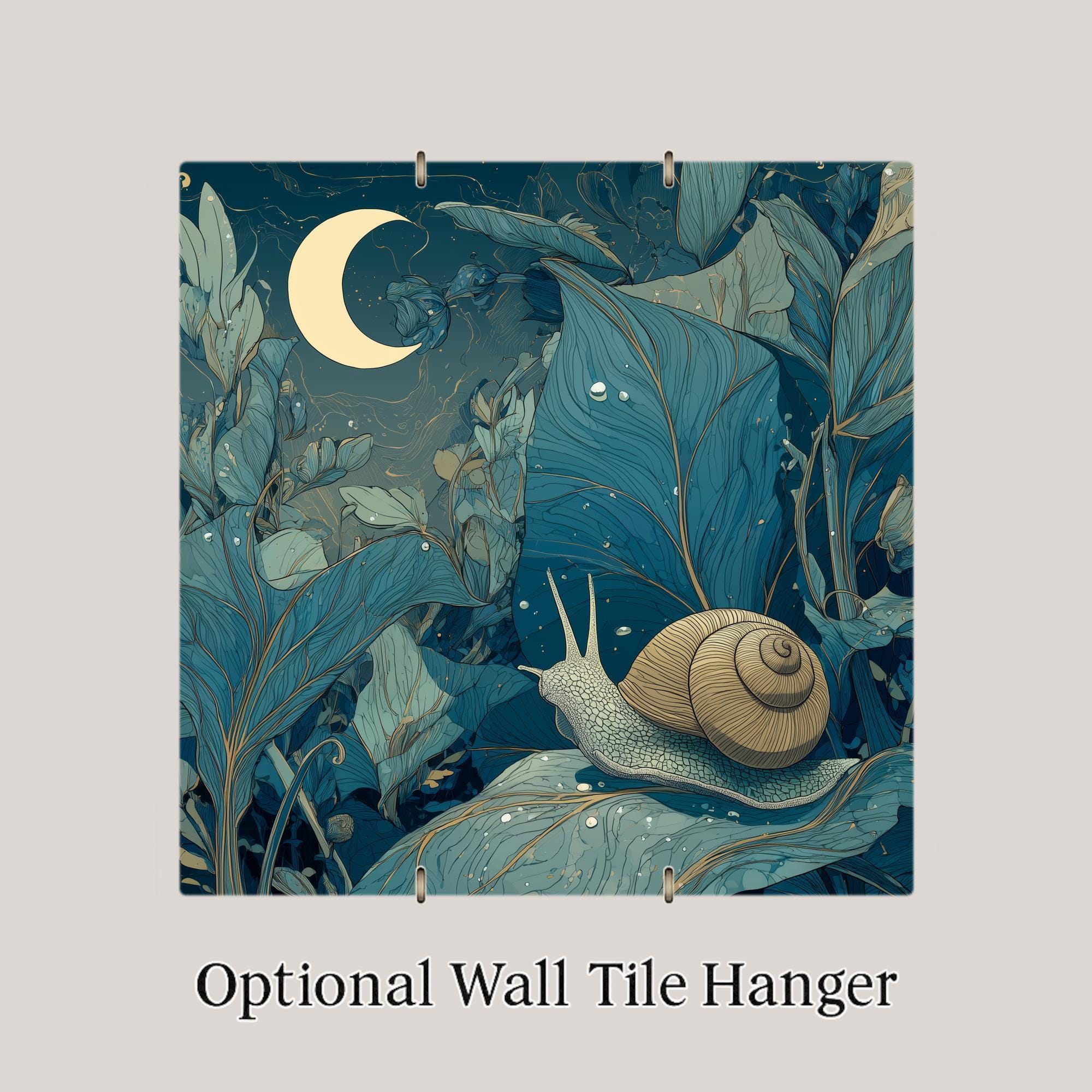 Bring calm, whimsical charm into your home with this moonlit snail ceramic tile wall art. Featuring a gentle snail resting beneath a crescent moon and surrounded by flowing leaves, this design blends nature illustration with a dreamy nighttime atmosphere. The cool blues, soft greens, and subtle gold accents create a peaceful visual that complements cottagecore, botanical, and nature-inspired decor styles.