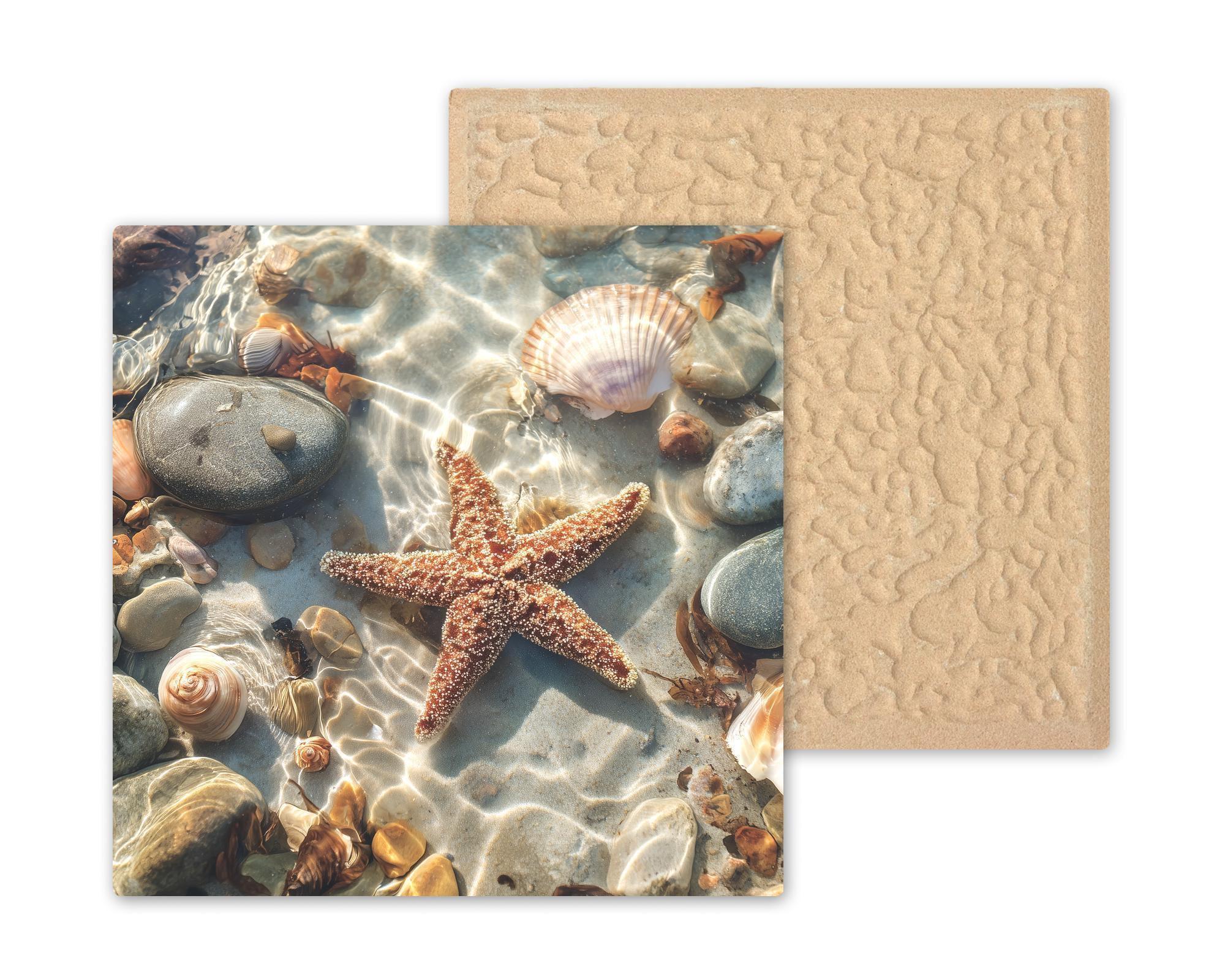 Inspired by quiet moments along the shoreline, this Tidepool Starfish Ceramic Tile Art highlights the simple beauty found where land meets sea. Light dances across shallow water, revealing shells, stones, and a starfish resting naturally in its environment. The composition feels serene, balanced, and deeply coastal.