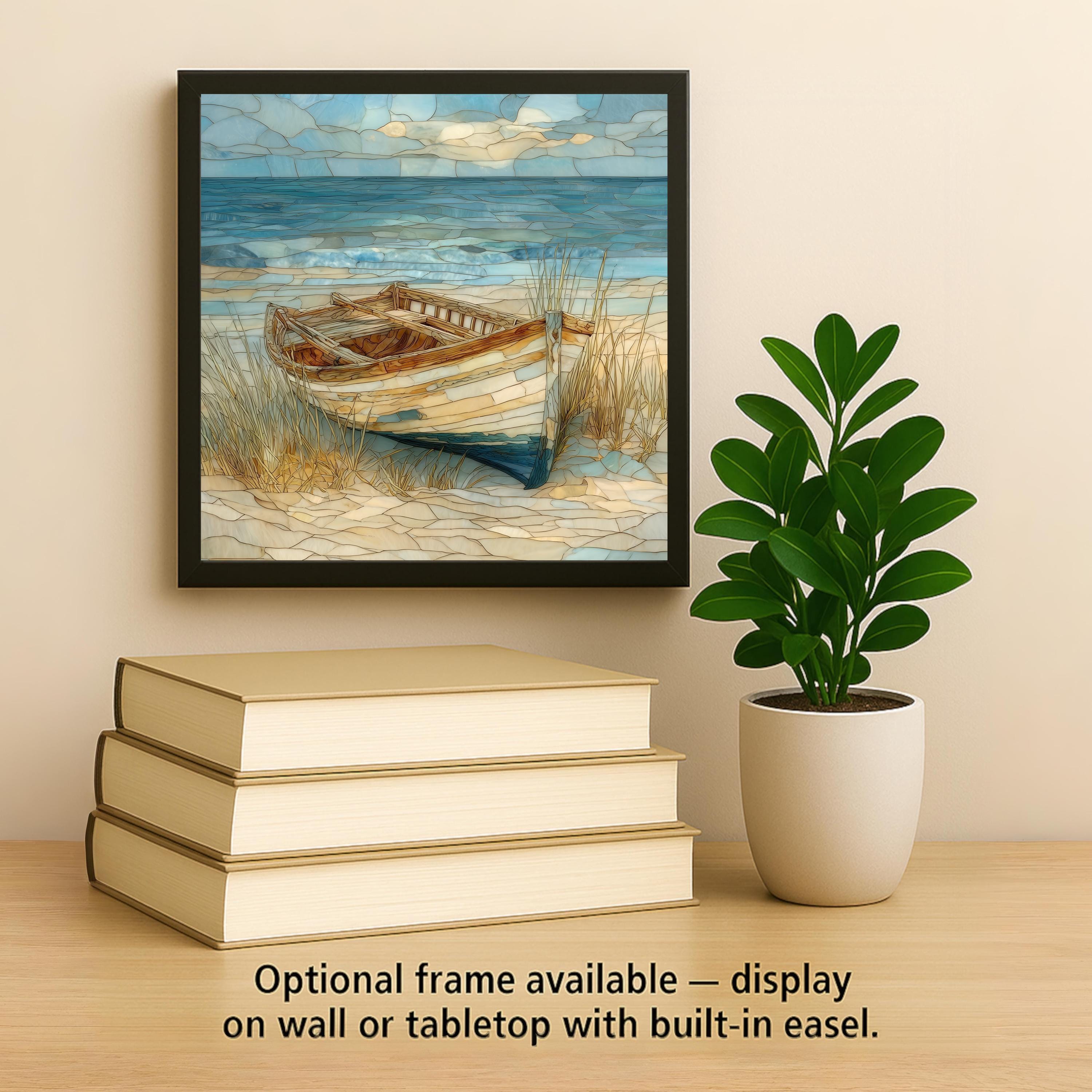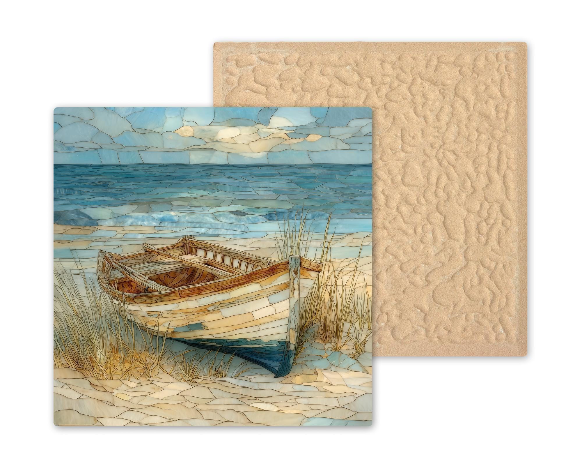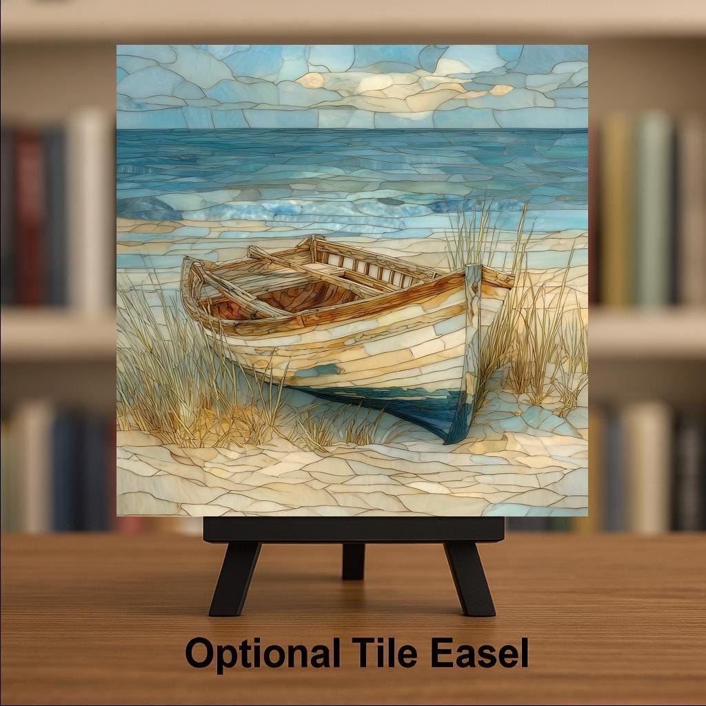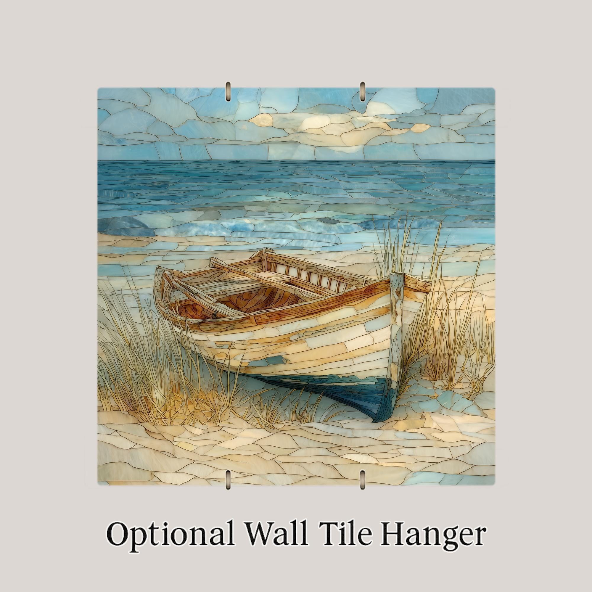 Bring the feeling of a quiet beach morning into your space with this coastal ceramic tile wall art featuring a classic wooden rowboat by the sea. The stained glass–style design blends gentle waves, soft sky tones, and sandy textures into a harmonious ocean scene that feels both relaxed and refined.
