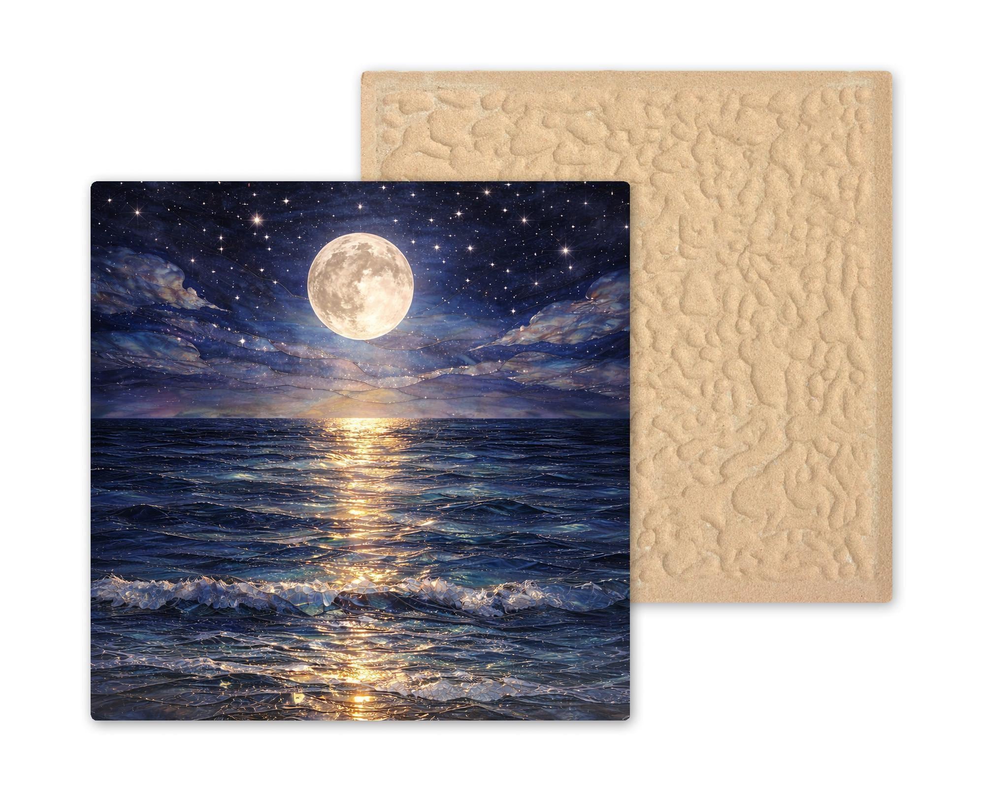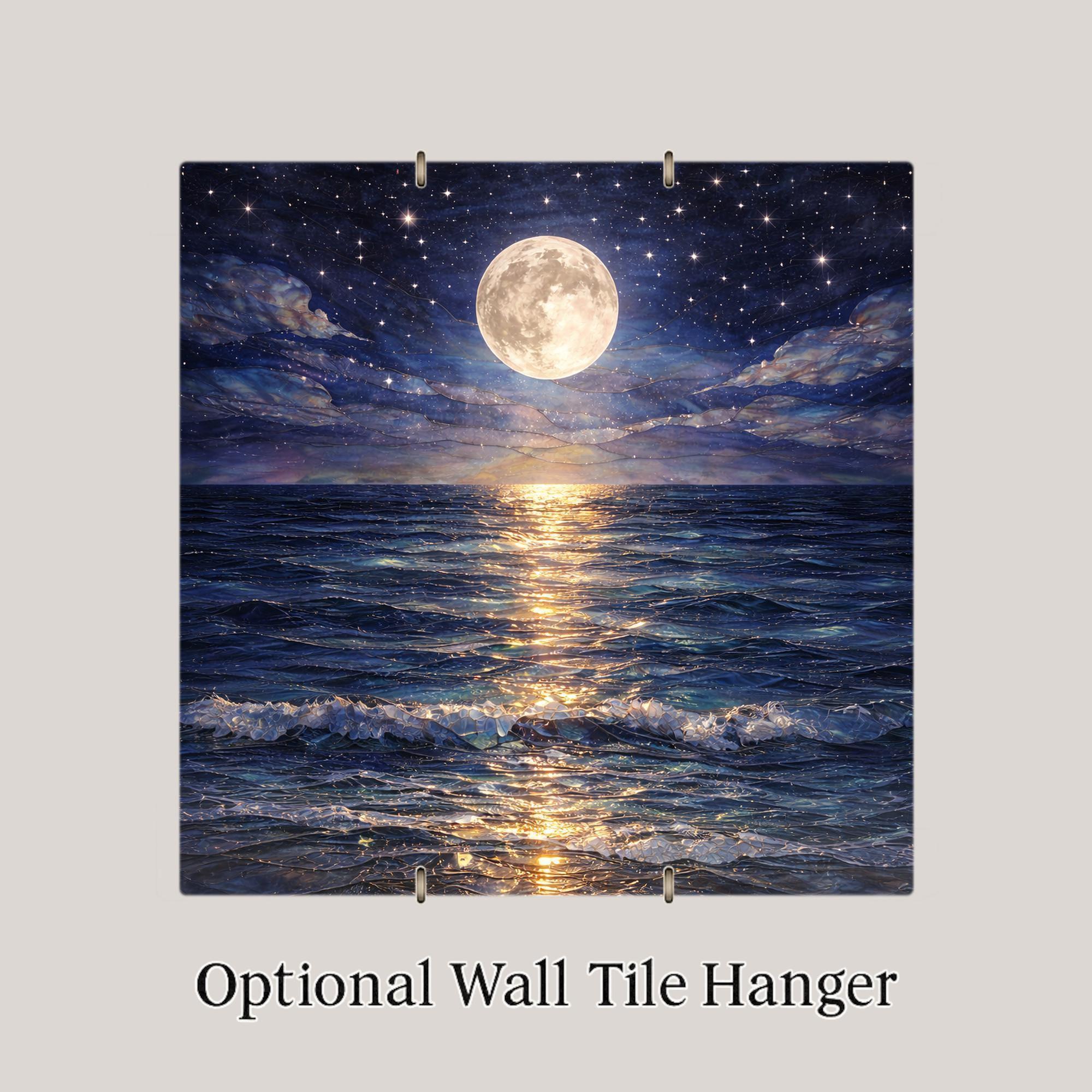 This full moon ocean ceramic tile art is designed to bring serenity and balance into your home. The moon hangs low over the horizon, illuminating the waves below and casting a gentle glow across the water. Subtle stained glass–style textures enhance the movement of the sea while maintaining a calm, peaceful feel.