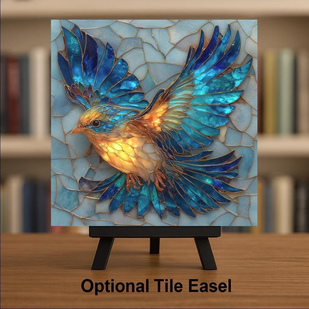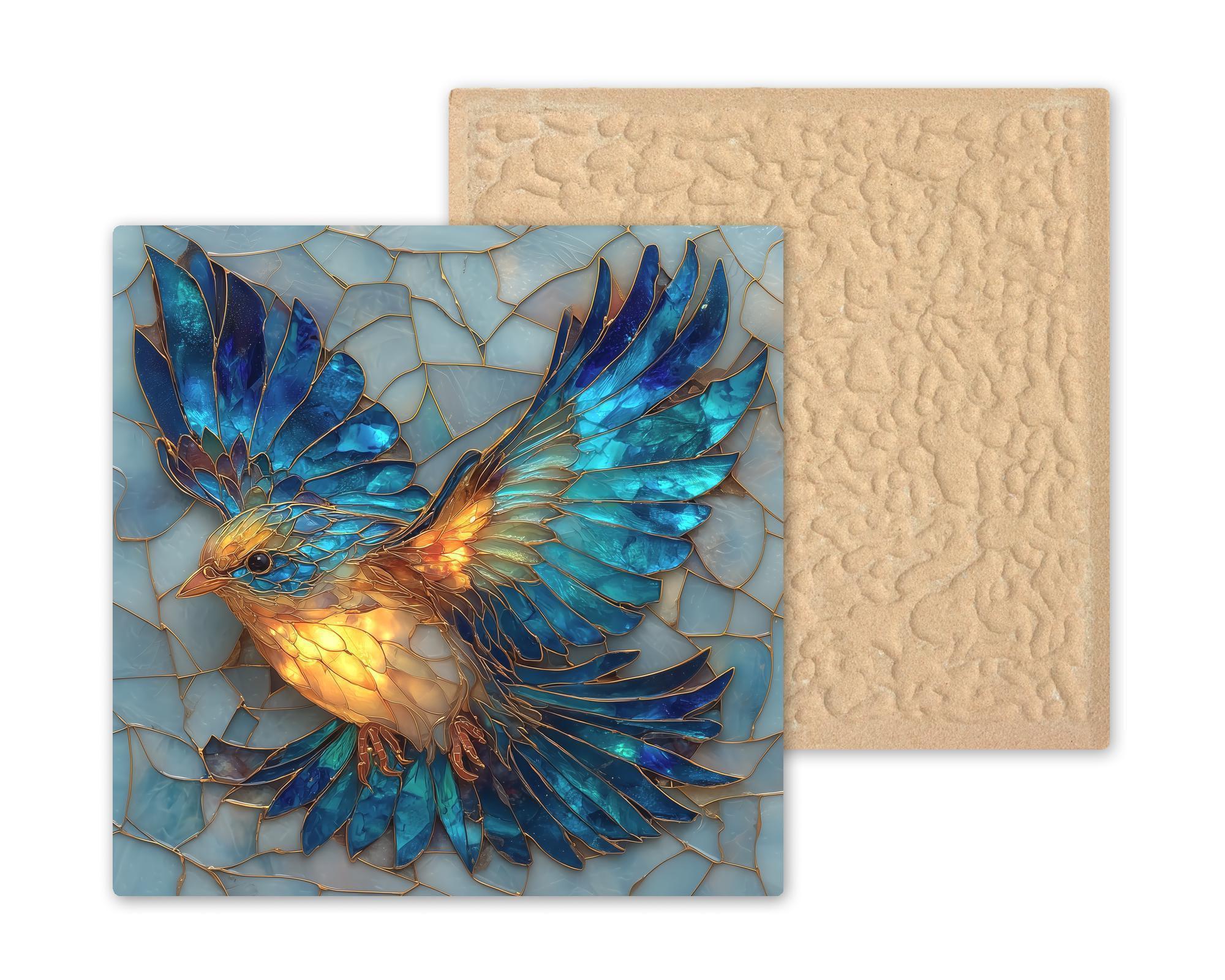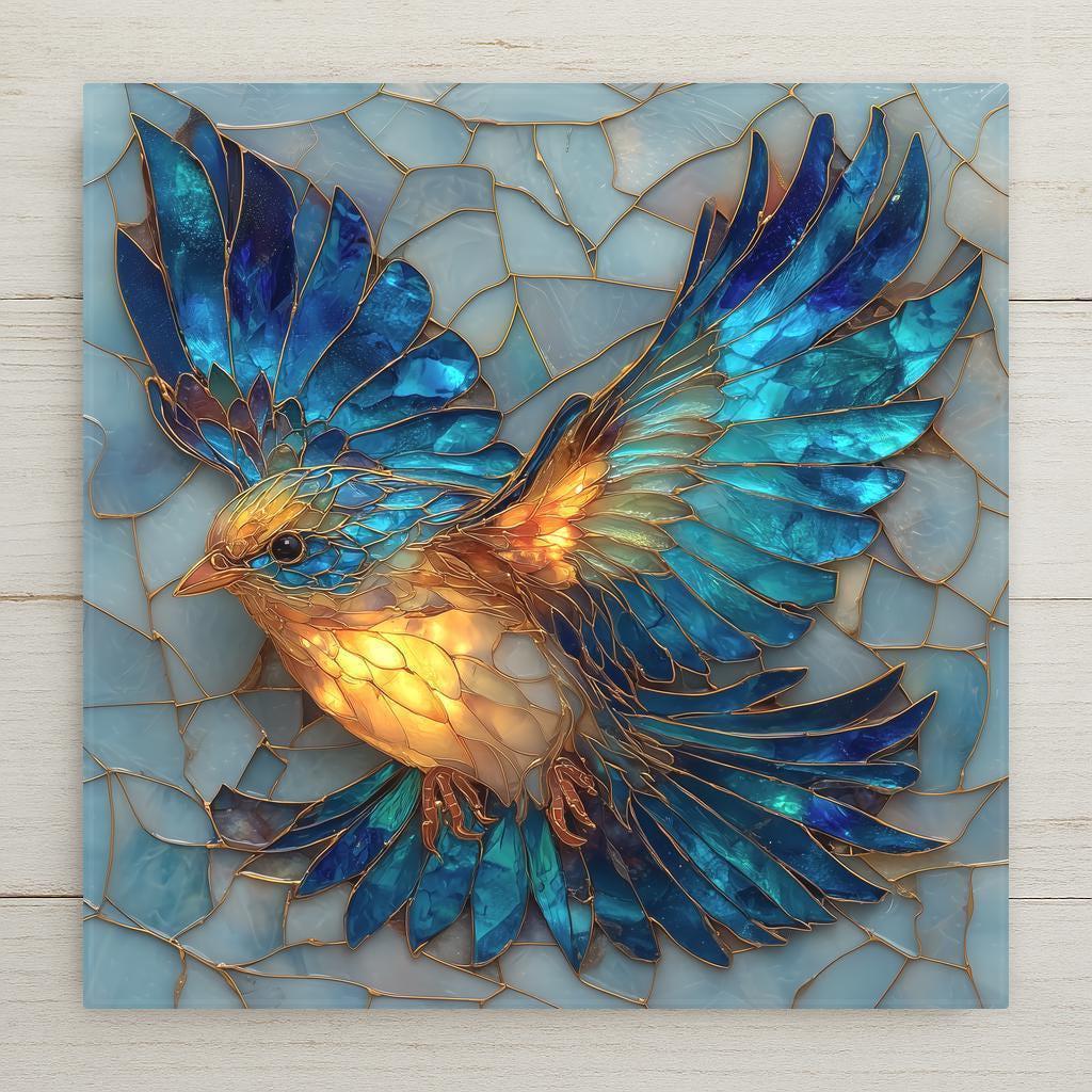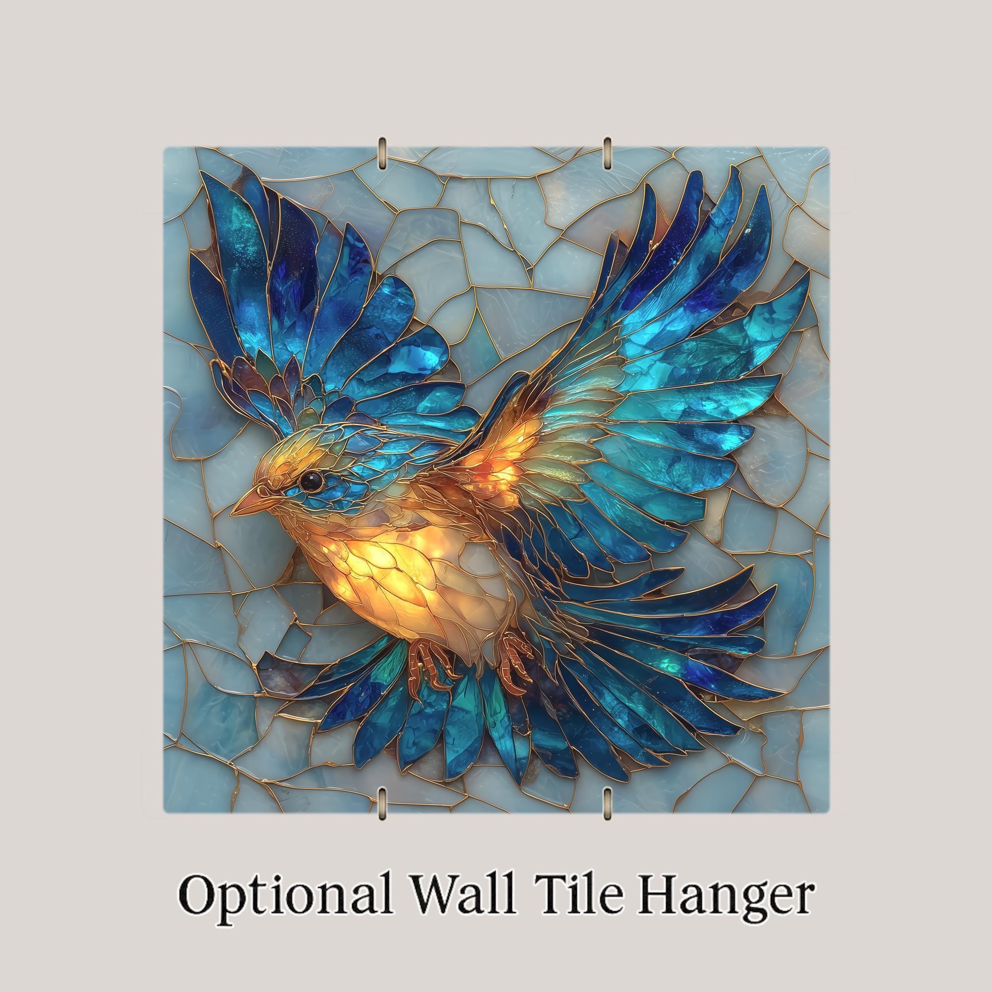 This bluebird ceramic tile wall decor captures a moment of motion and light, with wings fully extended and warm golden tones glowing through layers of blue glass-style detail. The composition creates a sense of energy balanced with calm, making it ideal for spaces where you want an uplifting and inspiring focal point.