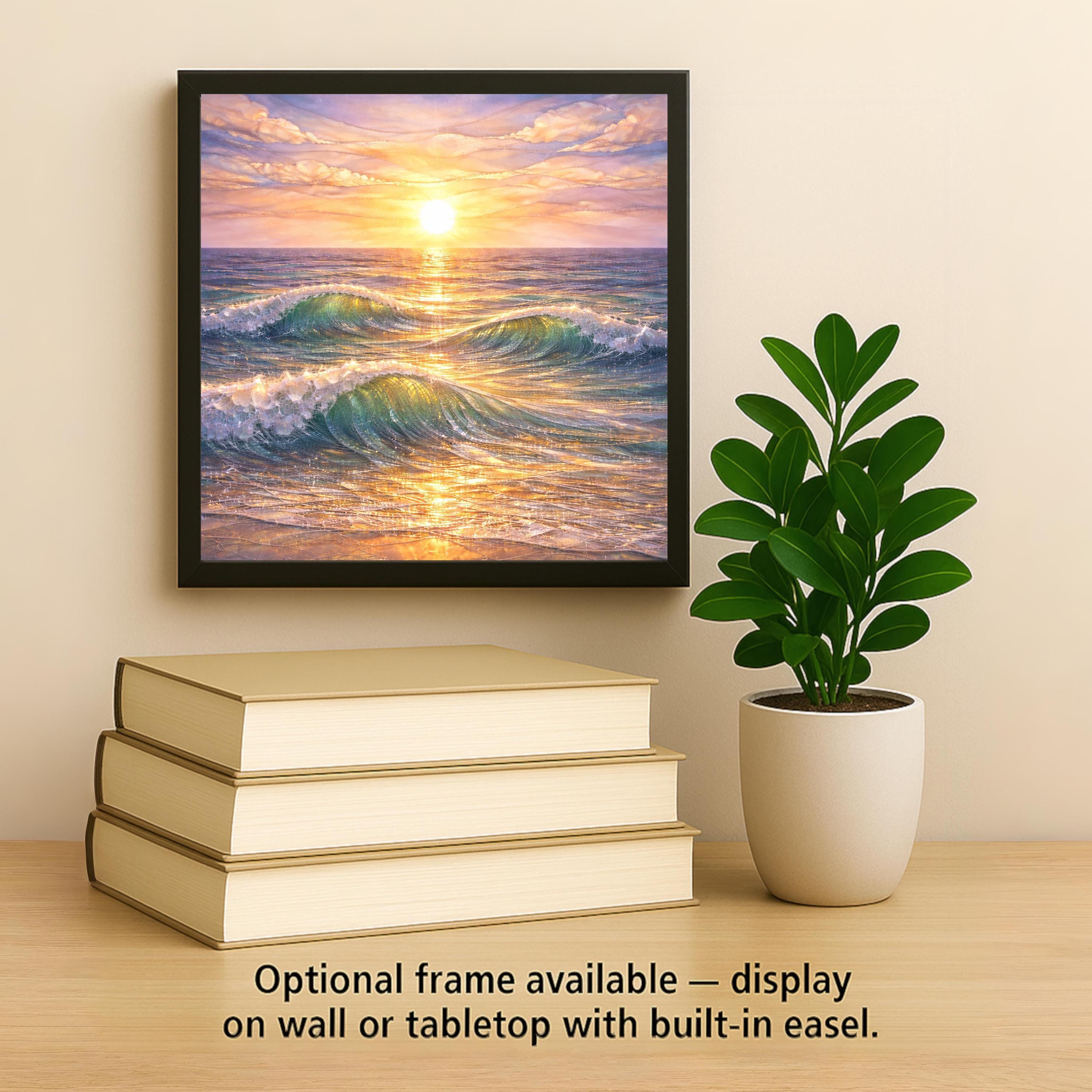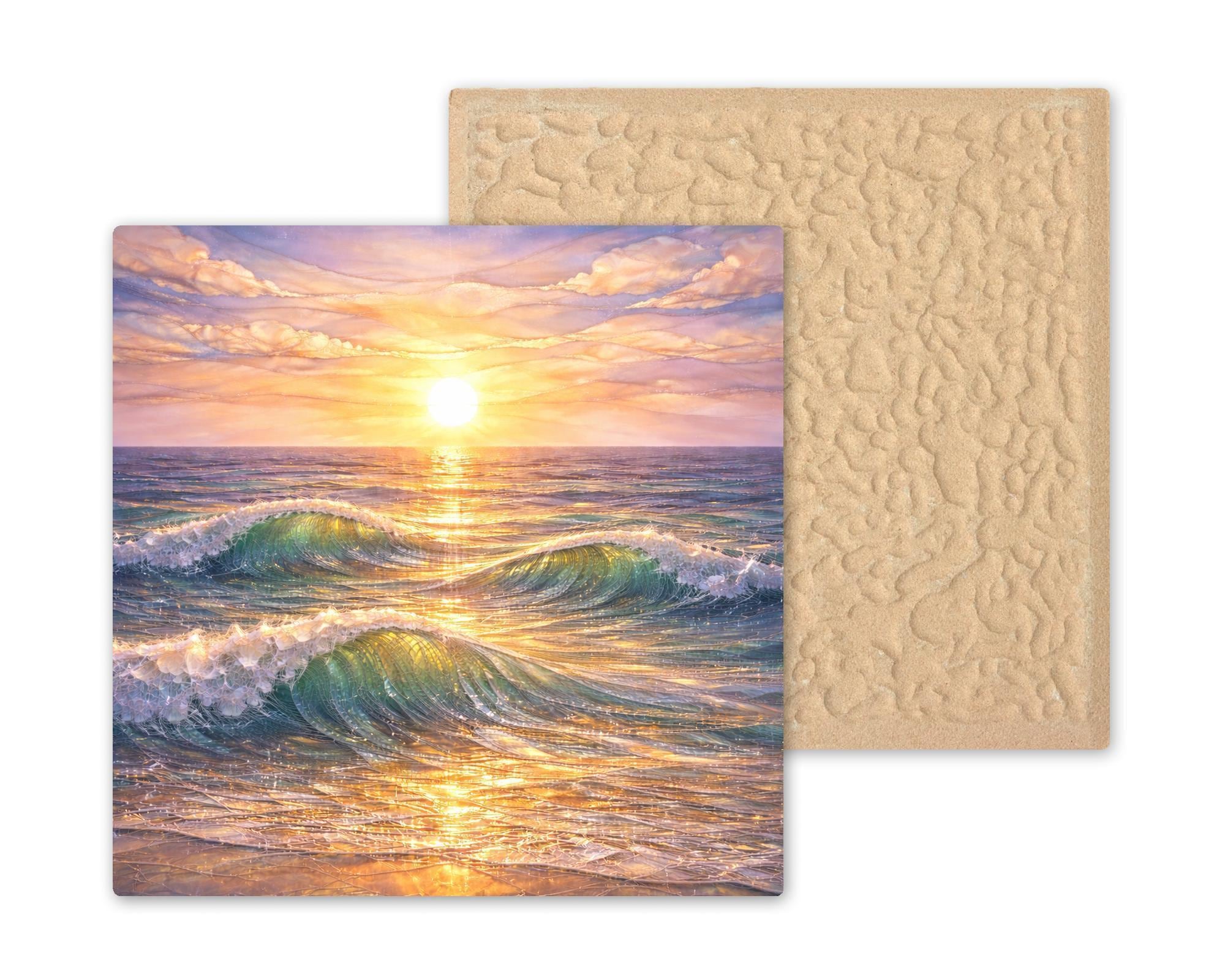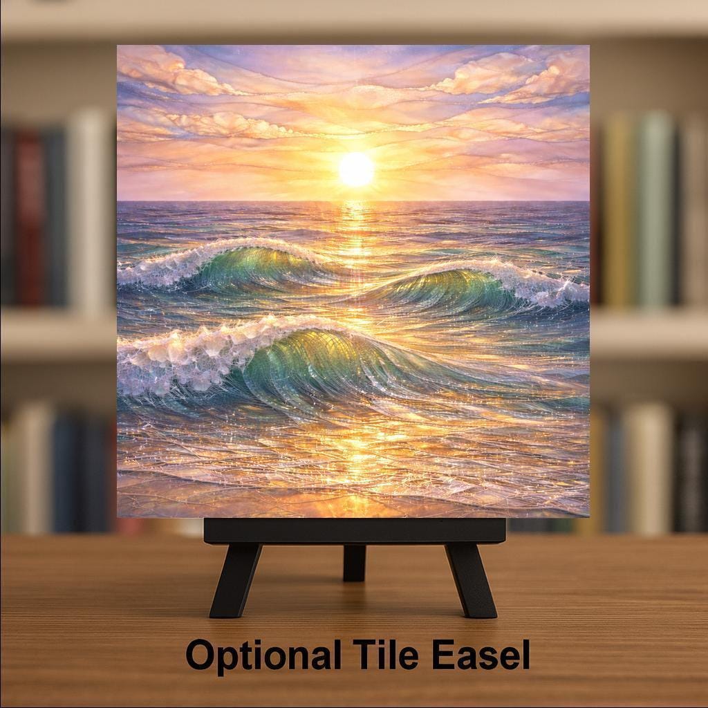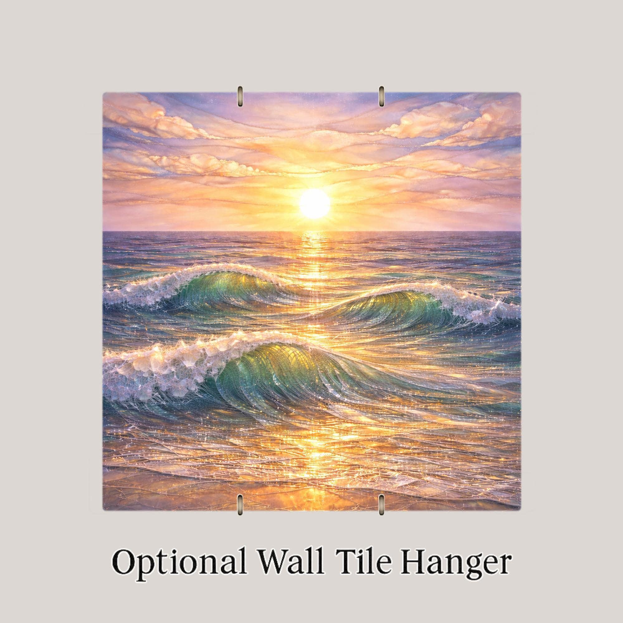 This ocean ceramic tile wall decor captures a quiet moment where light and water meet. Gentle waves roll toward the shore as the sun rests low on the horizon, filling the scene with golden reflections and soothing color. The stained glass-style aesthetic adds depth and movement while maintaining a calm, balanced composition.