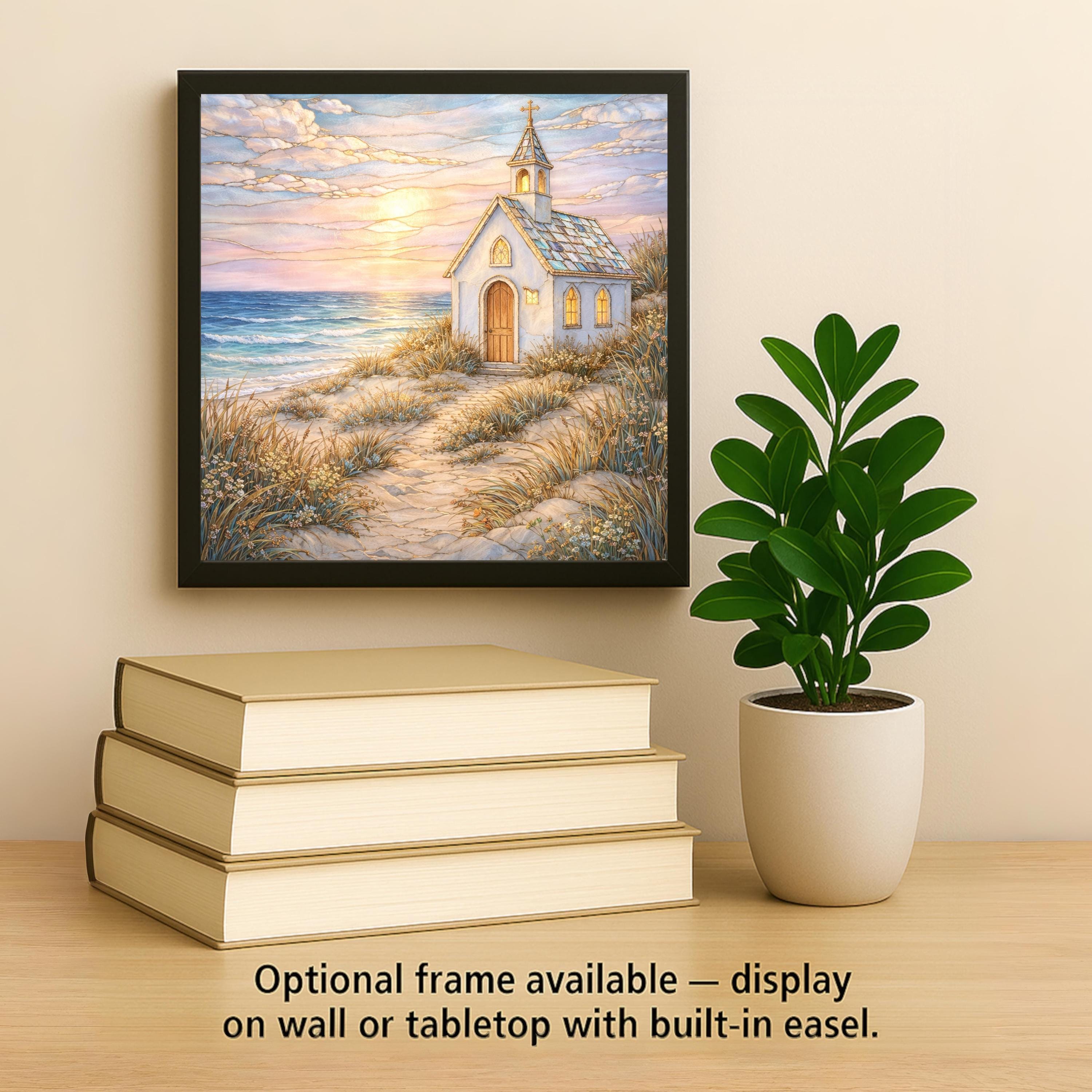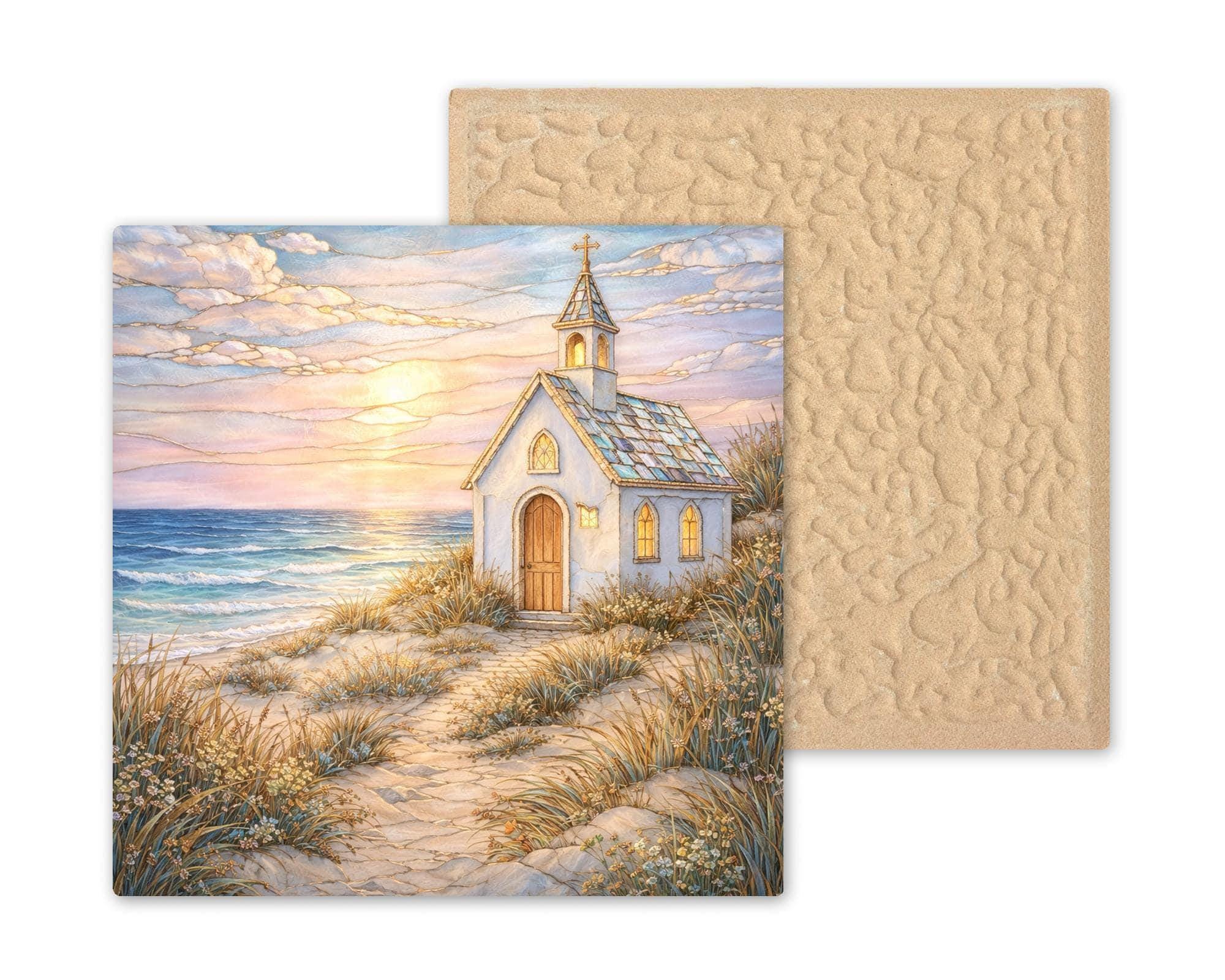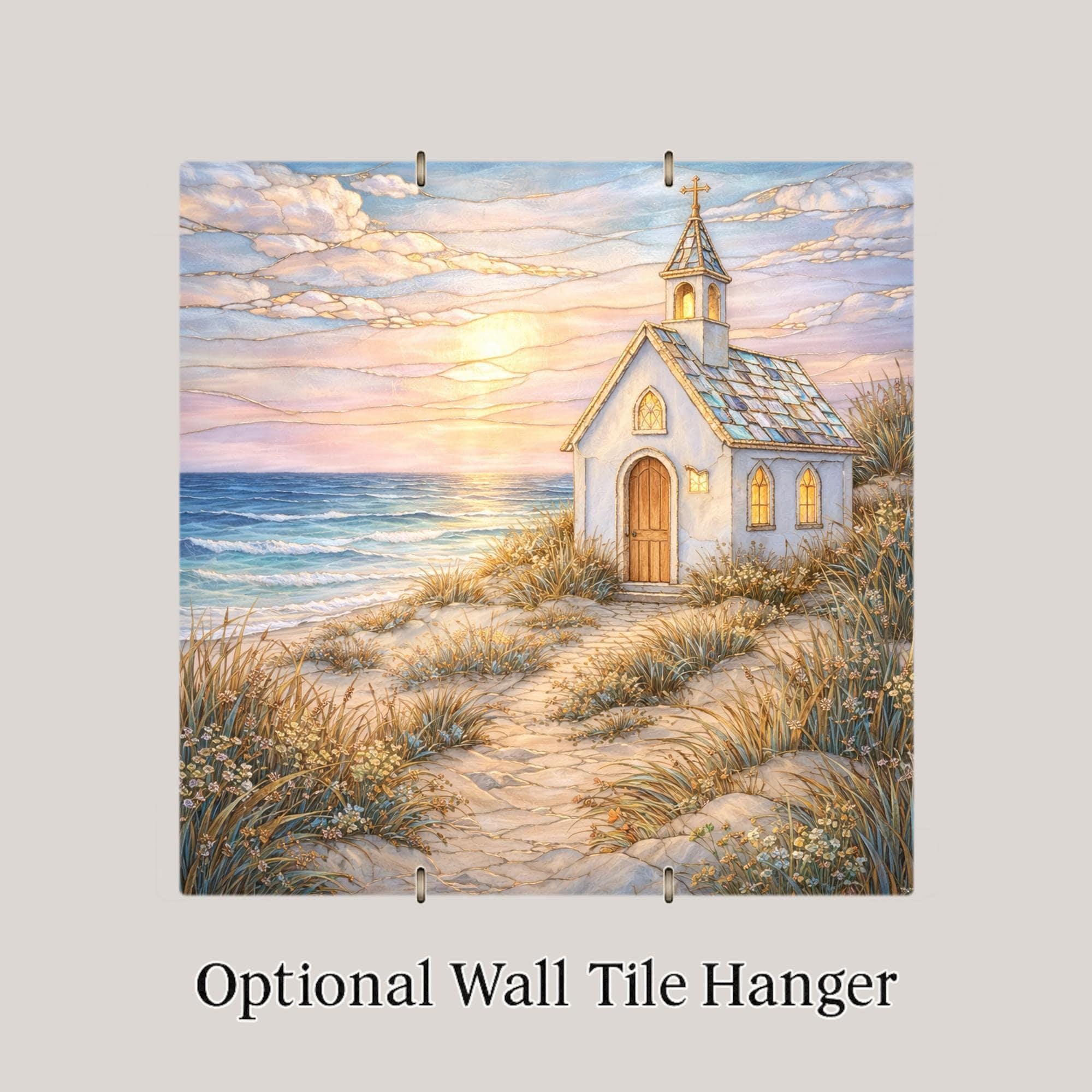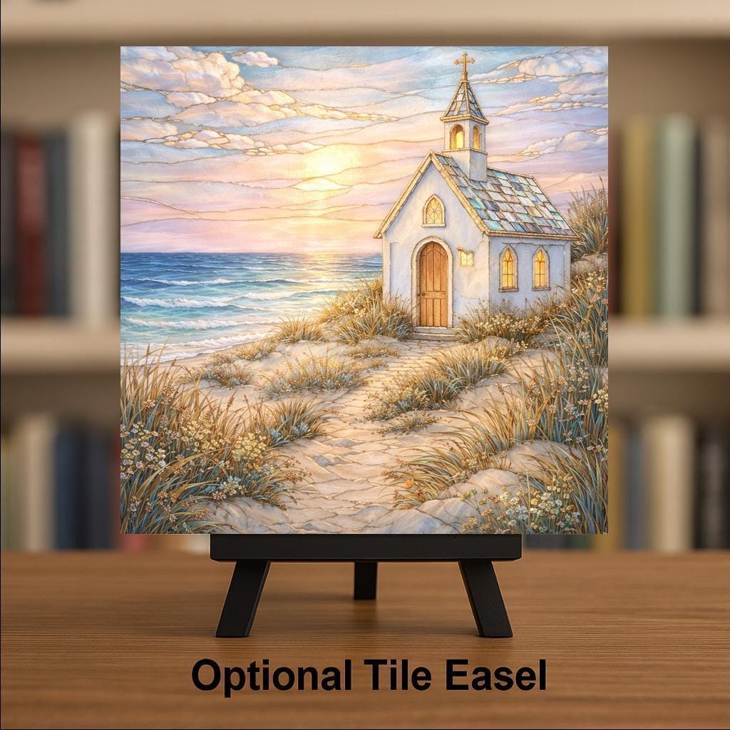 Rendered as a ceramic tile, the artwork gains a sense of permanence and weight. The stained glass–inspired style is expressed entirely through print, offering the visual warmth of glass while maintaining durability and ease of display. As coastal wall art, it integrates naturally into curated interiors that value calm, faith, and connection to nature.