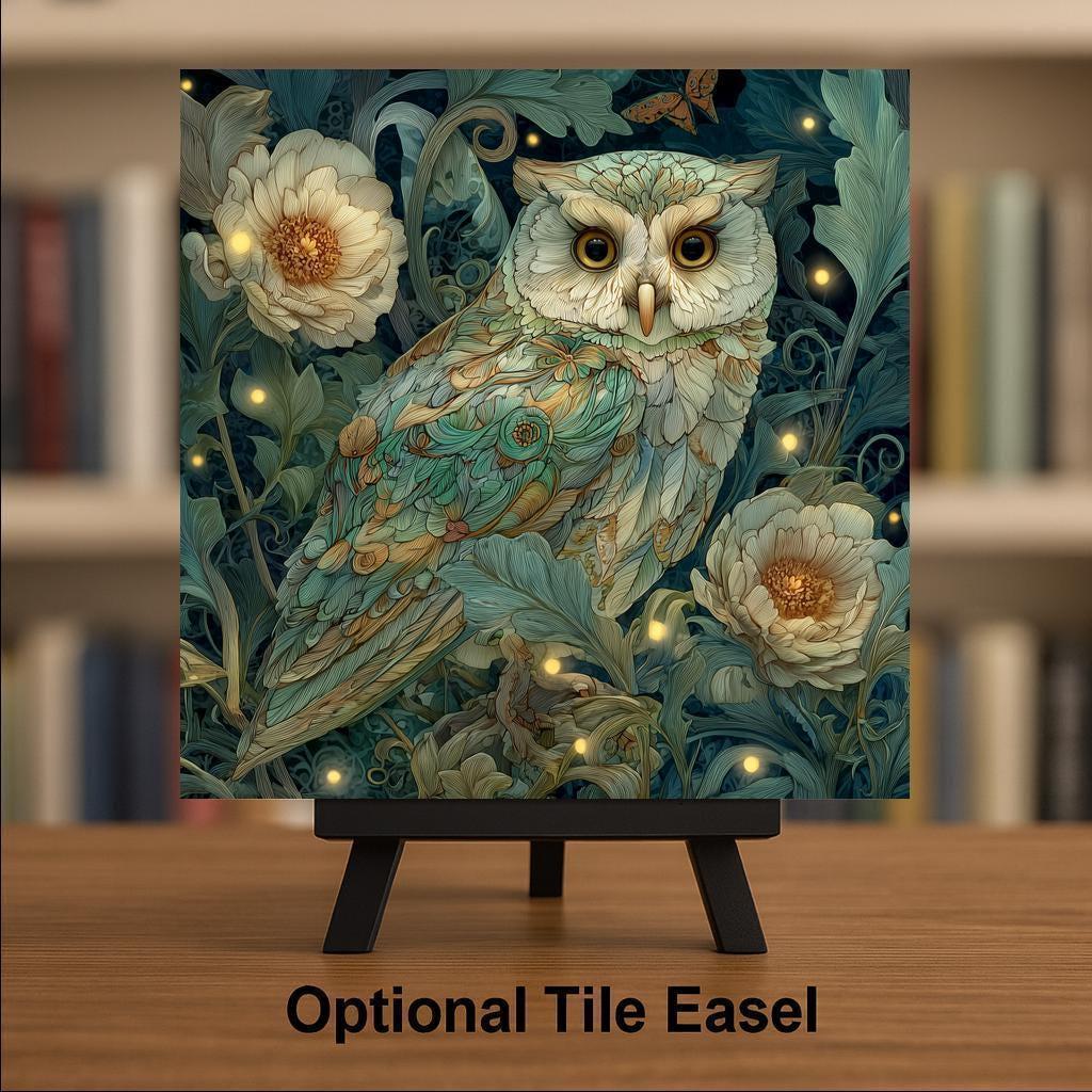 This botanical owl ceramic tile wall decor is designed to feel calm, detailed, and refined. The flowing leaves, soft floral shapes, and luminous highlights give the artwork a handcrafted stained glass appearance, while the owl remains the quiet focal point of the design. The natural color palette makes it easy to pair with a wide range of home decor styles.